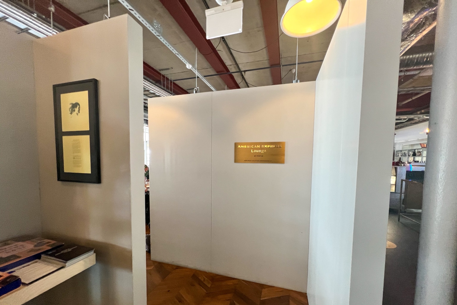The lounge is inside the restaurant through a small passageway marked by a gold plaque labelled “American Express Lounge.”