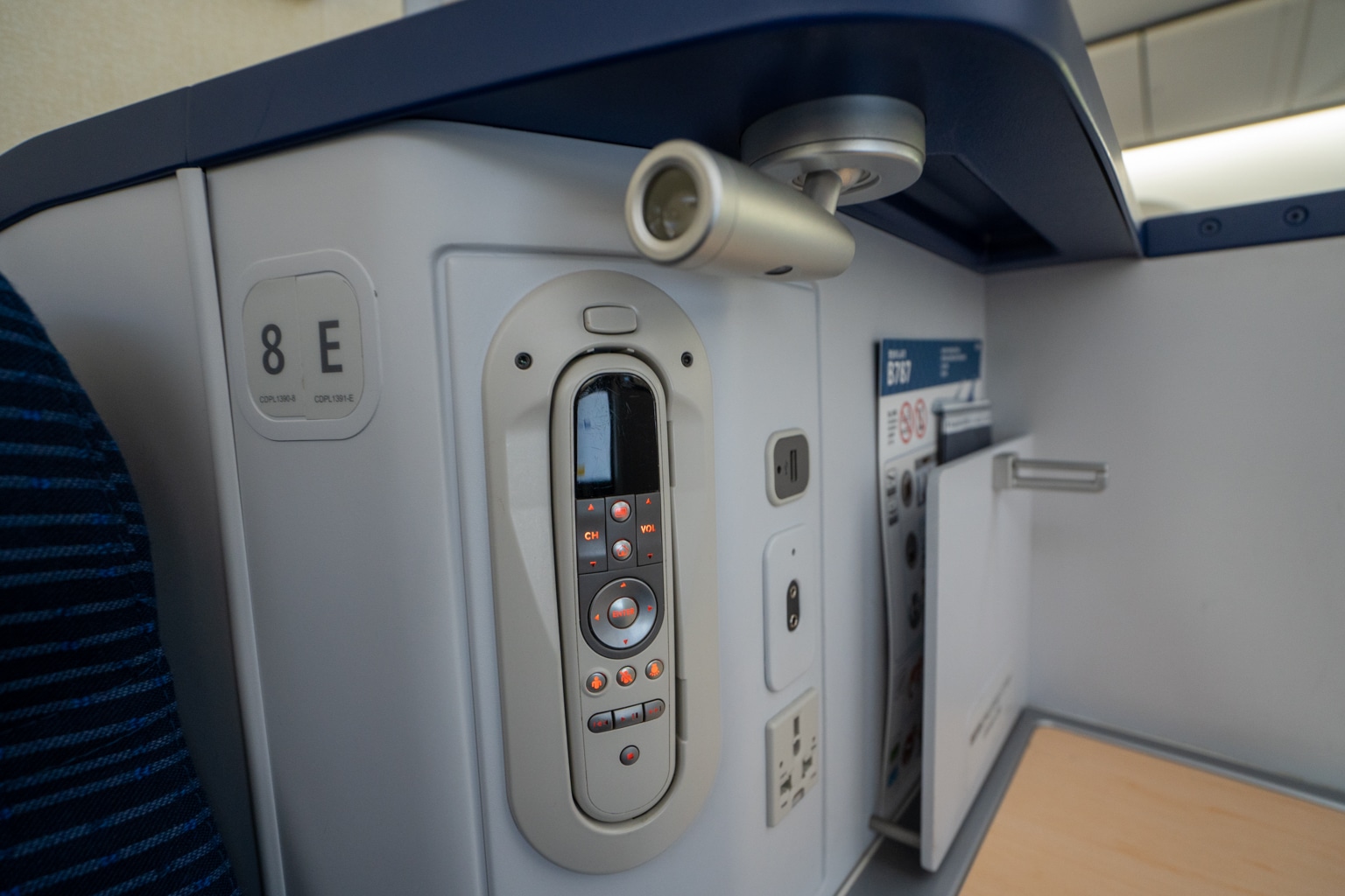 You’ll find here a reading lamp, universal power outlet, USB port, and remote control for the entertainment screen. There’s also a small pocket with literature storage above the side table.