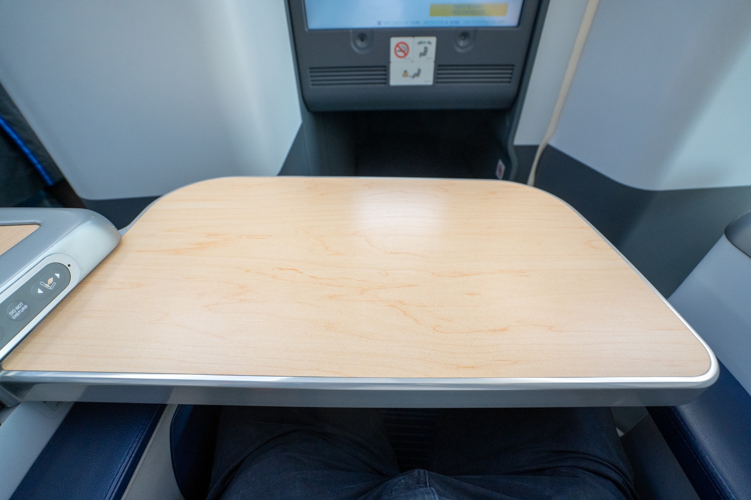From the inner surface of the seat console, the tray table can be unlatched and maneuvered into place in front of you.