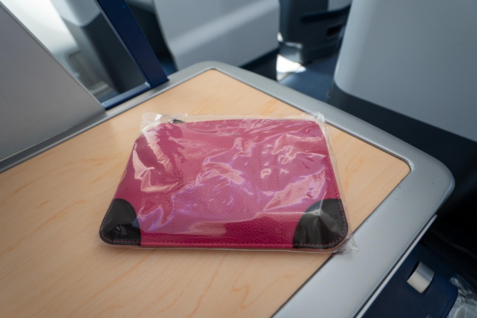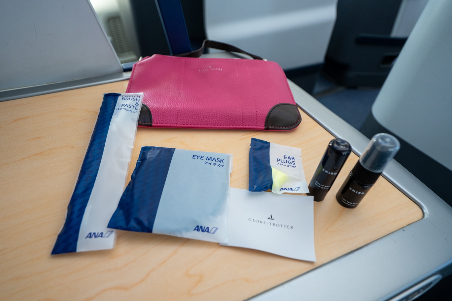 The ANA business class amenity kits is supplied by the UK-based Globe-Trotter luggage brand. This kit was a bright pink leather, but ANA rotates colours and designs throughout the year.