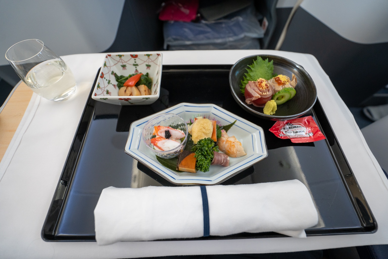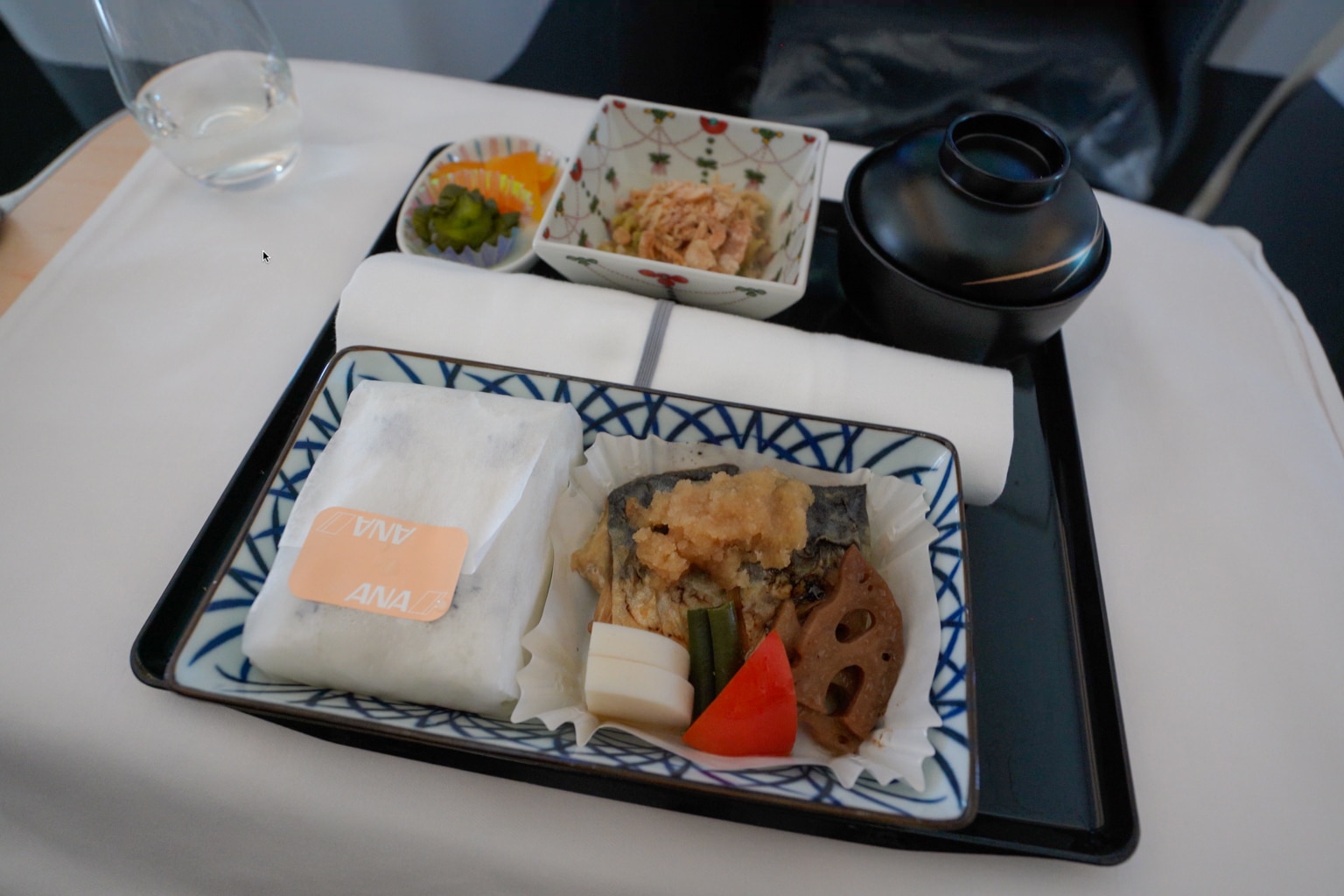 The meal presentation was, again, very lovely. ANA loves to serve a small square of rice wrapped in paper, which is always a special touch and one of the “little things” to look forward to whenever you’re flying with this airline.
