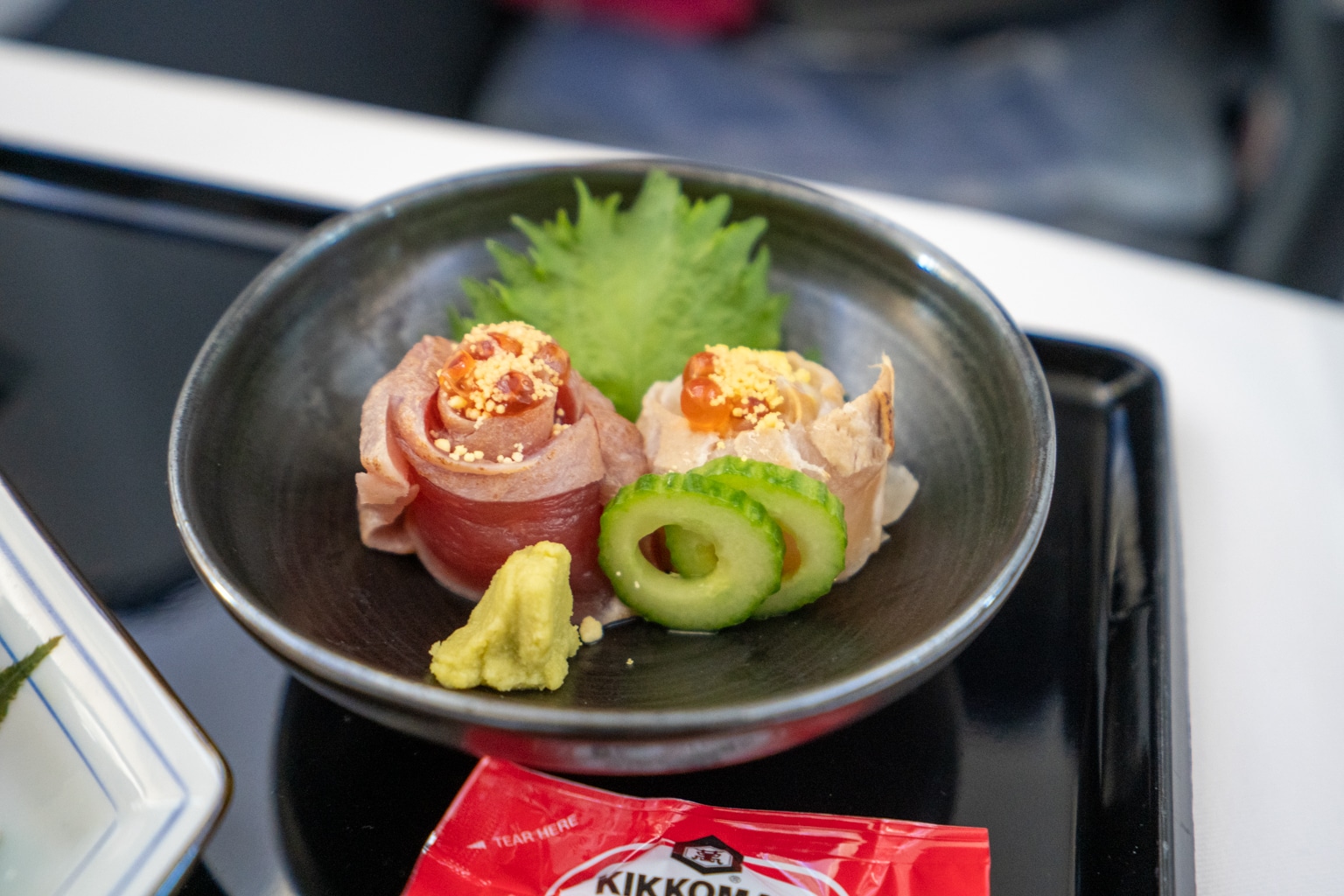The tray of fish, vegetables, and other tasty tidbits concluded the flight in style as we began our gradual descent into Tokyo Narita.