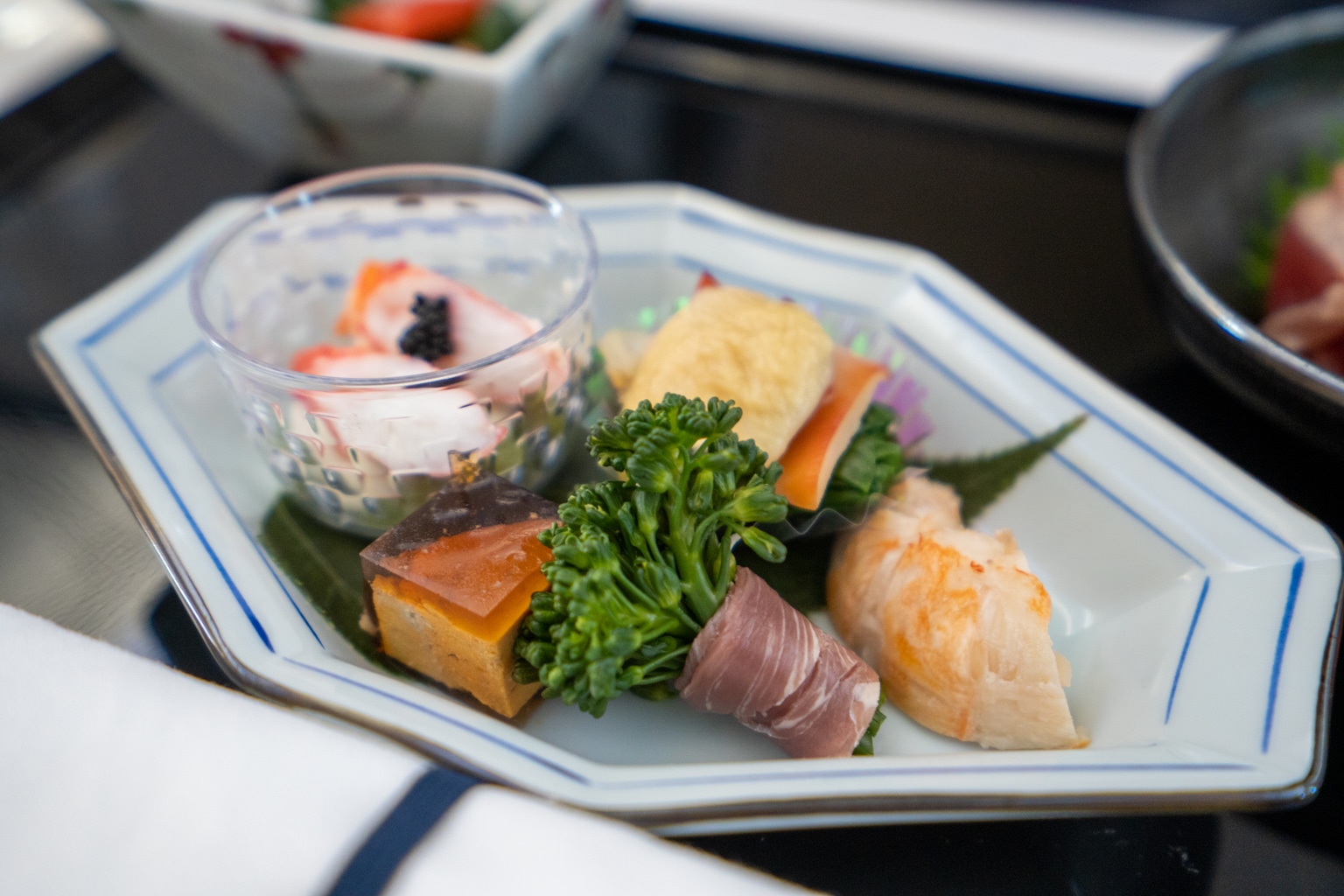 The Japanese menu was a washoku multi-course meal, beginning with an amuse bouche, followed by a selection of appetizers served on one plate.