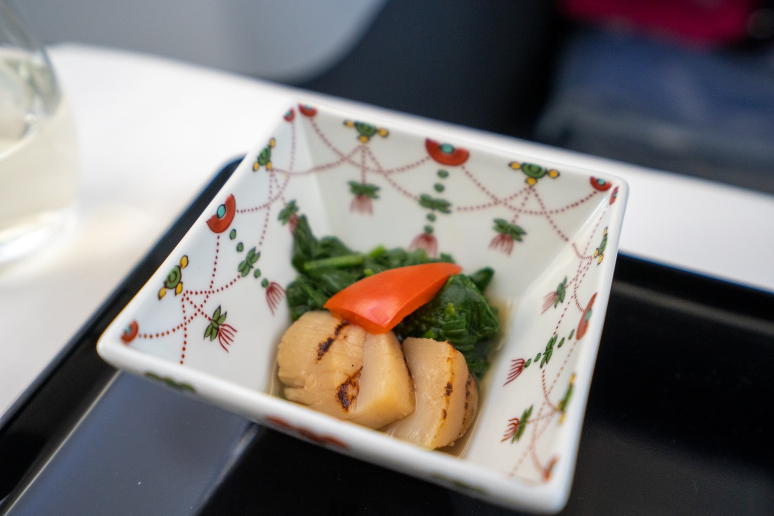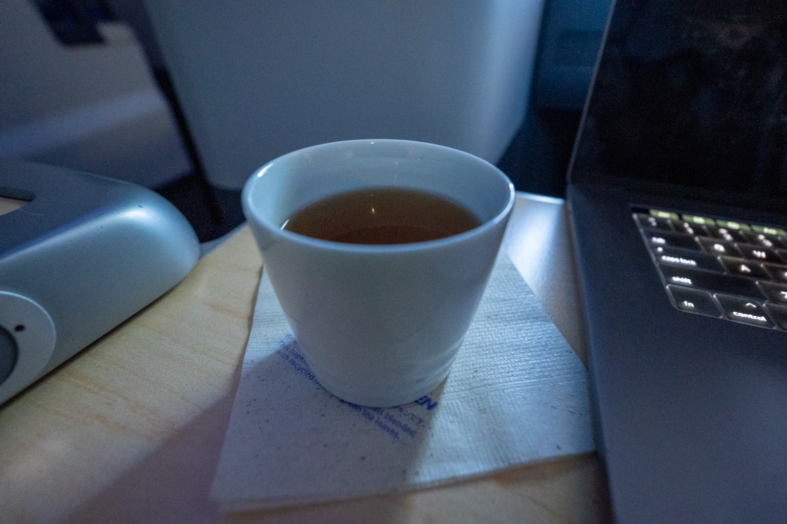 I purchased a full flight Wi-Fi plan and worked for the next few hours. I ordered a hojicha – smoked Japanese green tea – to enjoy while I caught up on some work, intending to sample as much of the beverage menu as I could, just as I had done with the food menu.