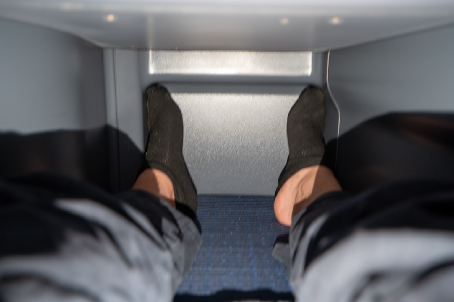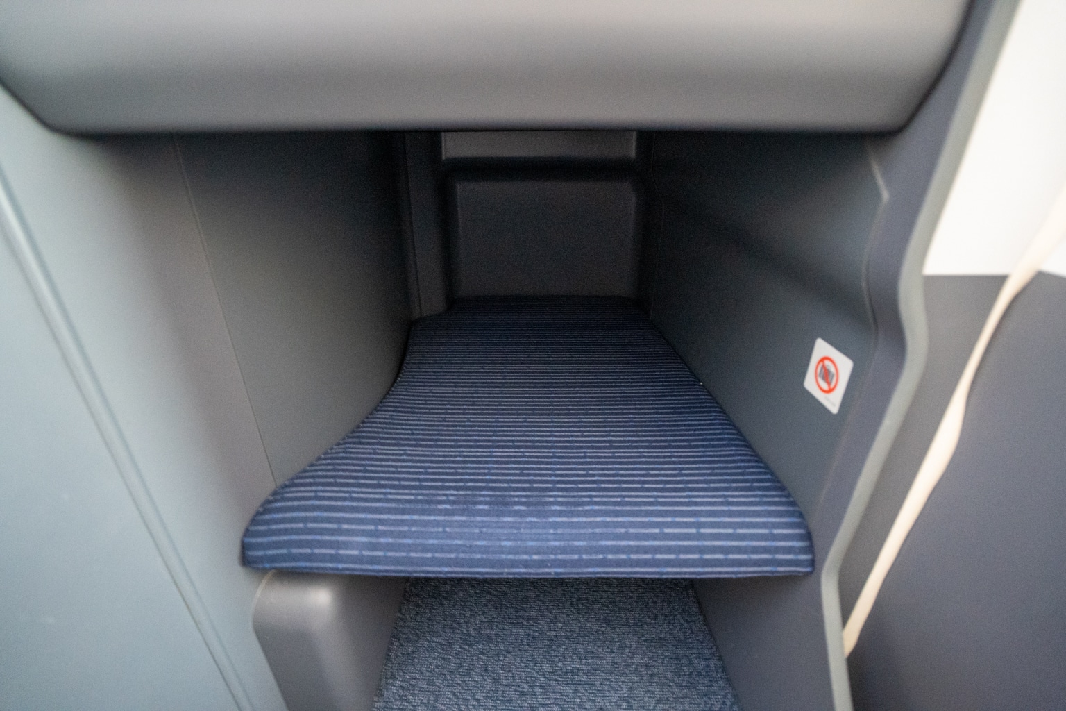 The finishes of the cabin interior consist of deep blues and muted greys. It’s a rather industrial look which might not be the most visually appealing by today’s aesthetic standards, especially compared to the newer, more sophisticated look of “The Room” on the Boeing 777.