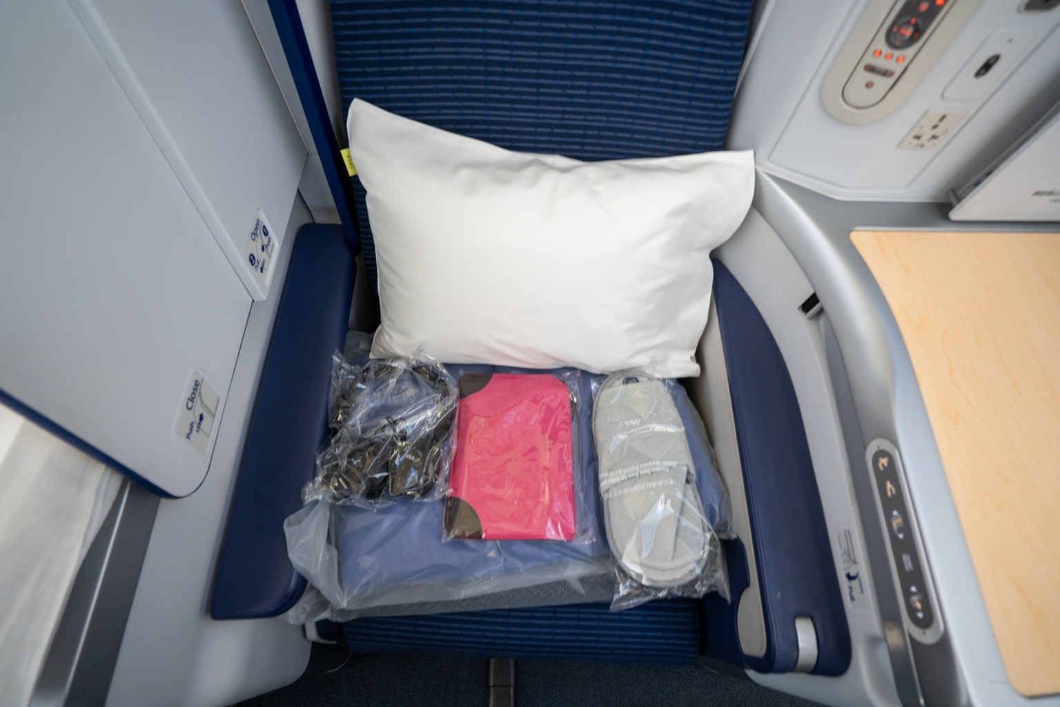 For departures out of Vancouver, the crew prefers to leave most of the business class amenities at your seat prior to boarding rather than hand them out prior to the departure. Indeed, we arrived at our seats to find a blanket, pillow, slippers, headphones, and an ANA amenity kit waiting for us.