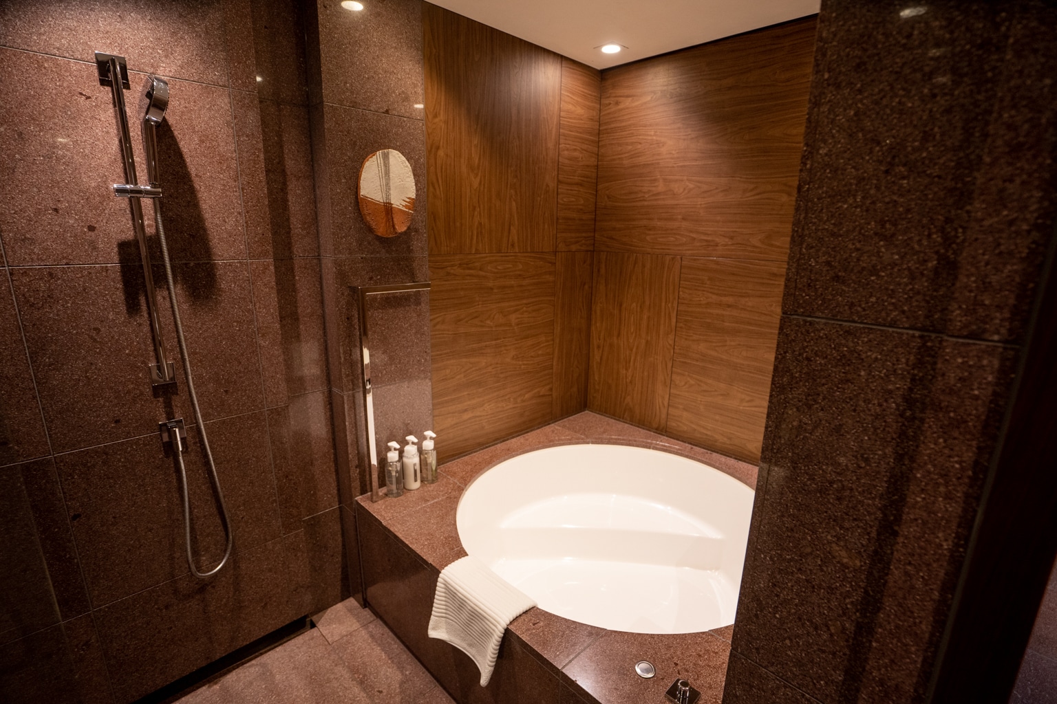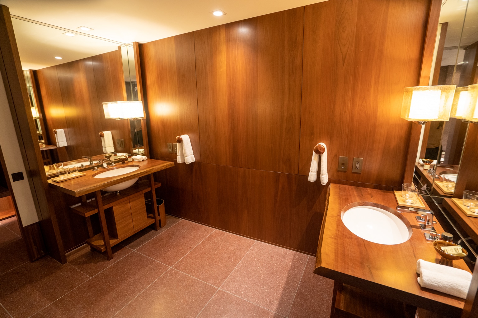 Within the room was a single vanity with plenty of counter space, and a large mirror. Then, a Japanese-style wet room contained a shower and a spacious circular tub made of stone.