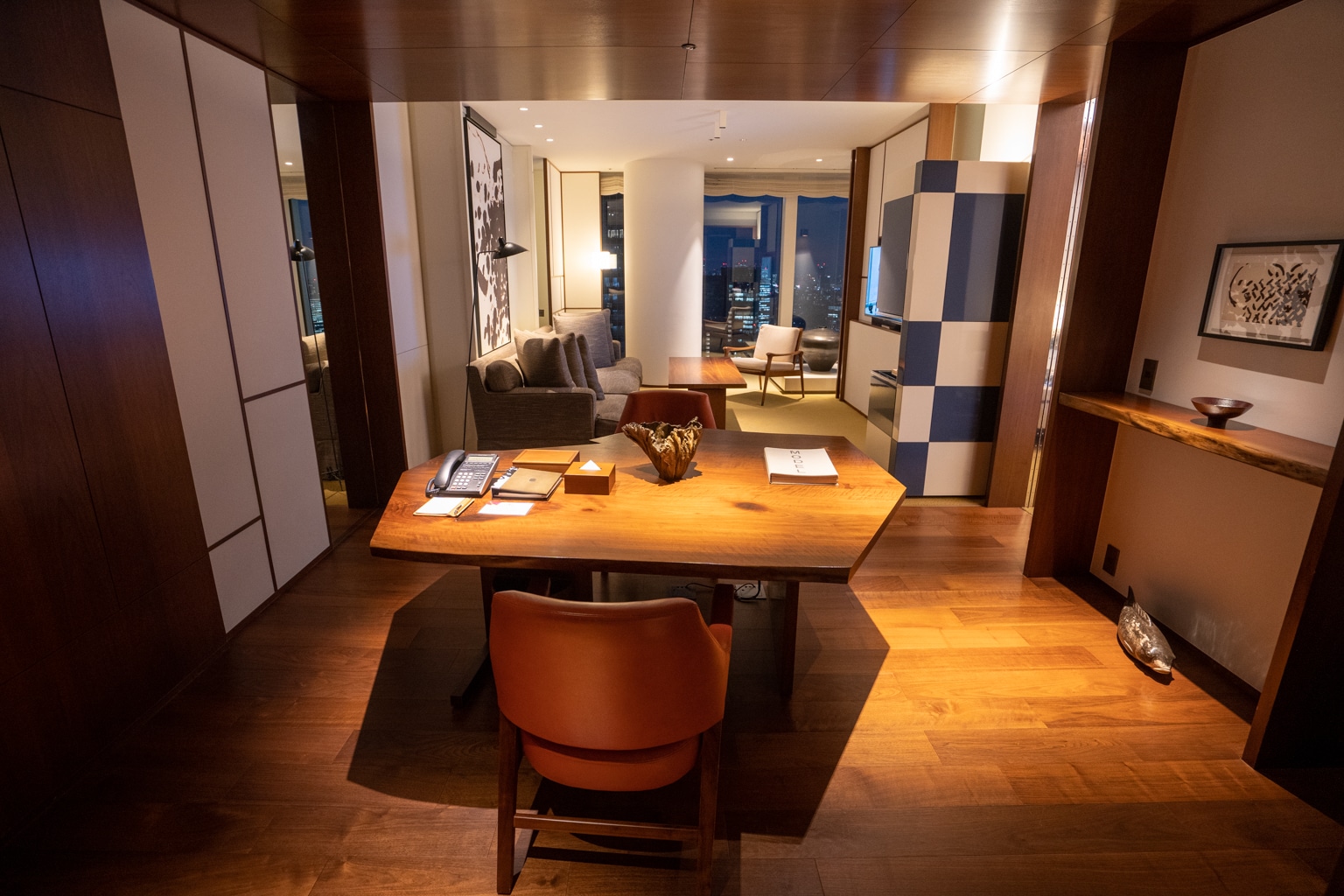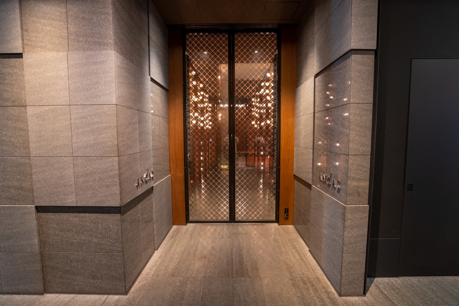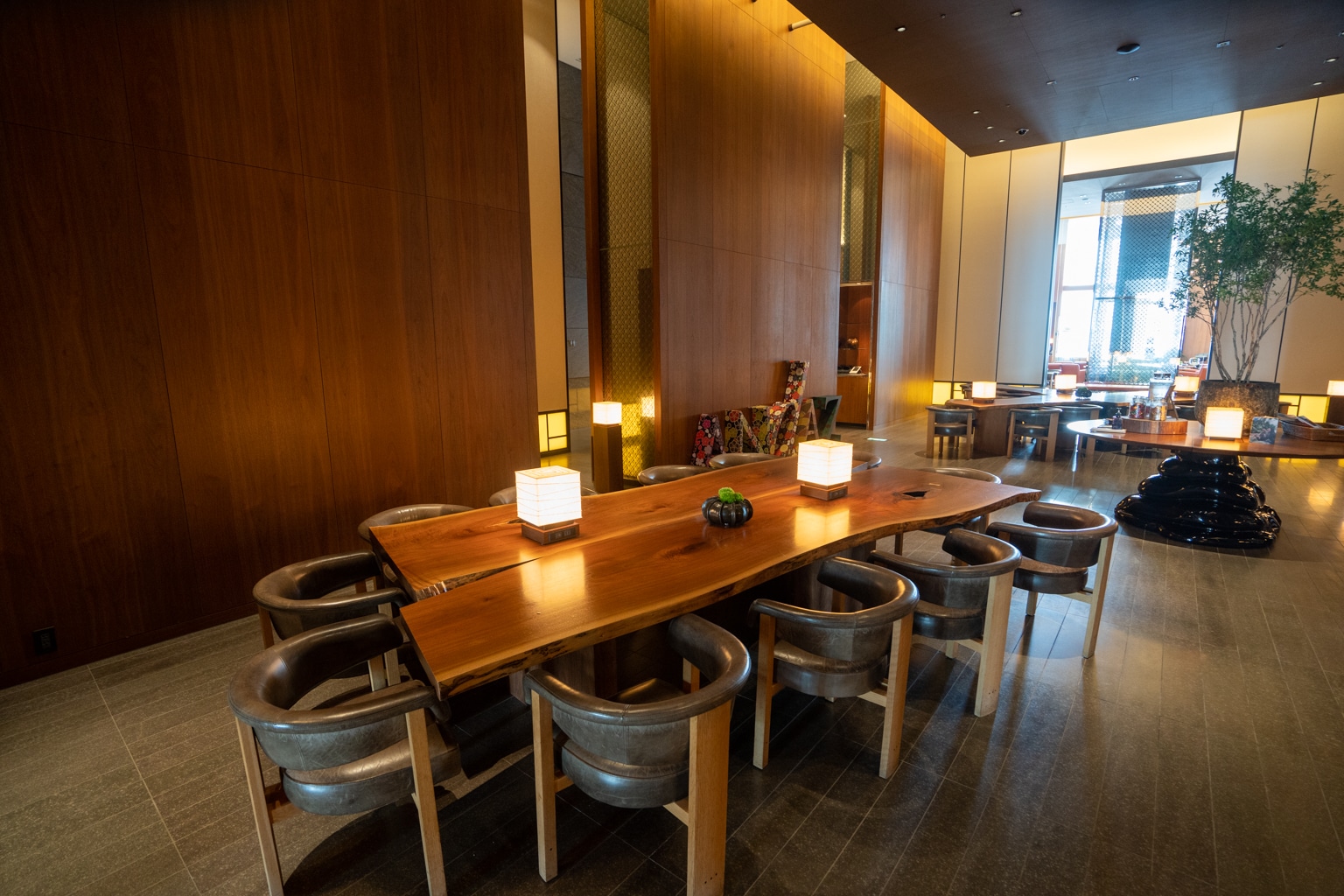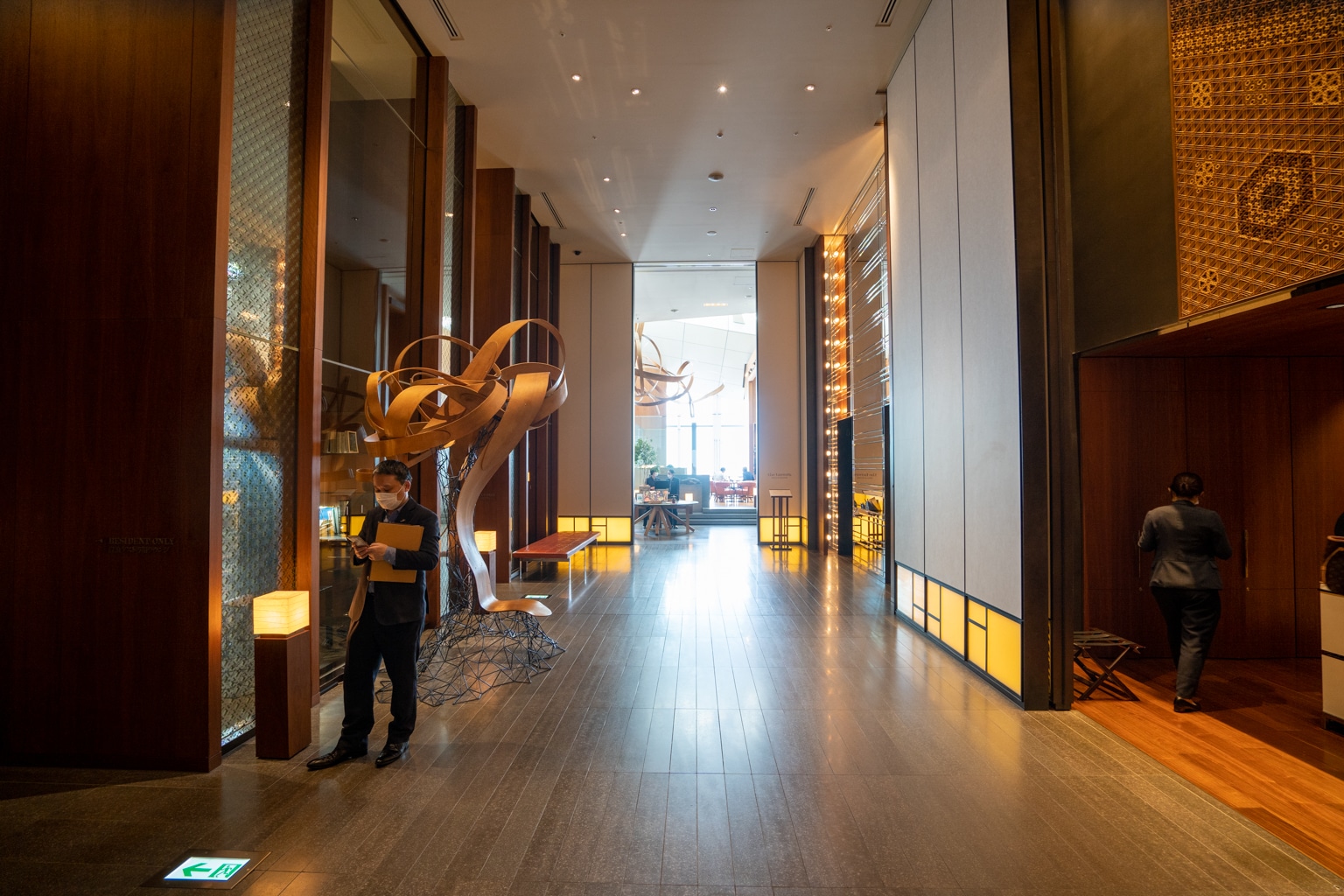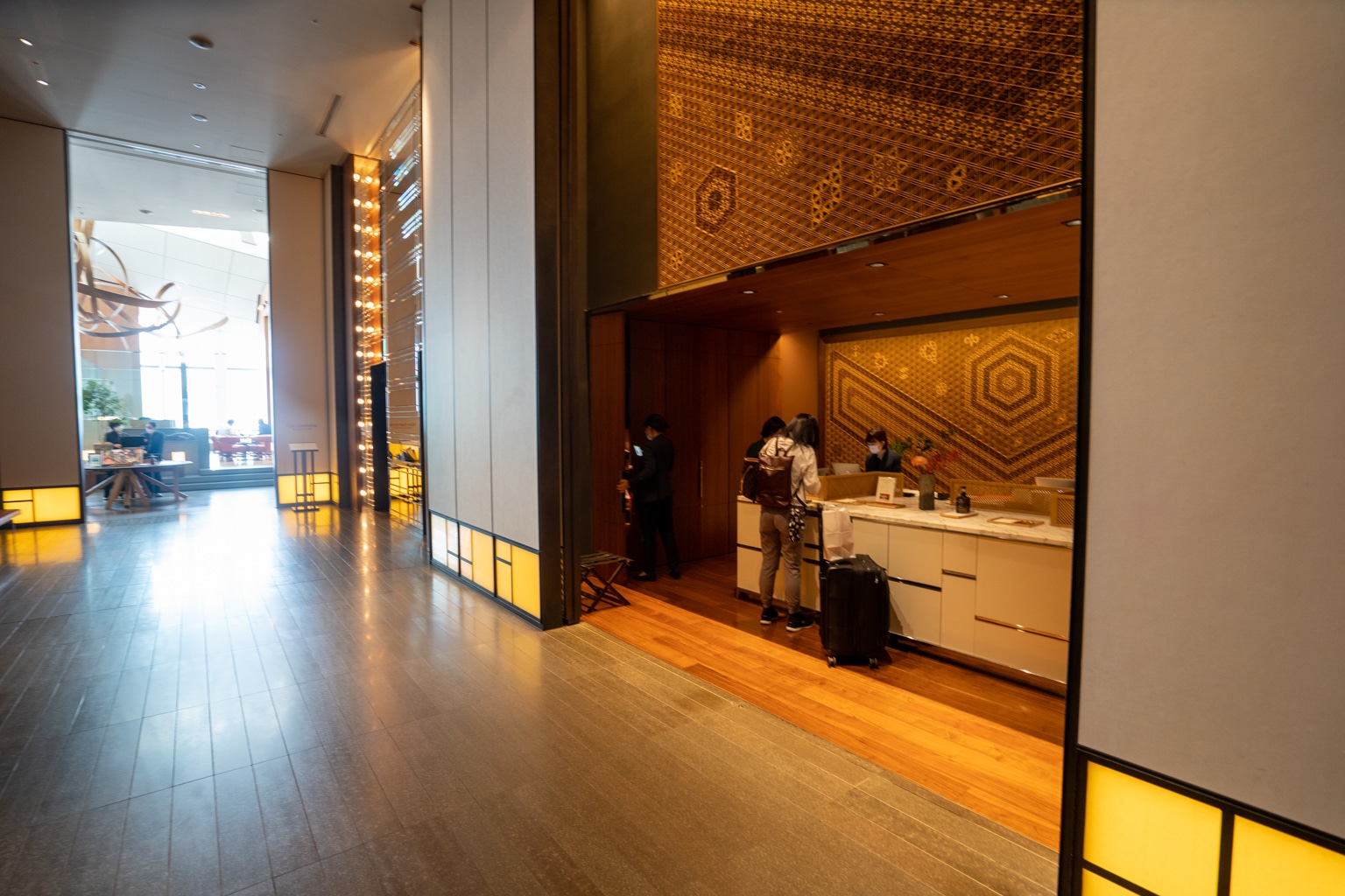 Upon entering the lobby, I took note of the warm, bronze, and wooden tones. There’s an eye-catching feature wall in the lobby with a towering kumiko wood mosaic that exudes a sense of grandeur.