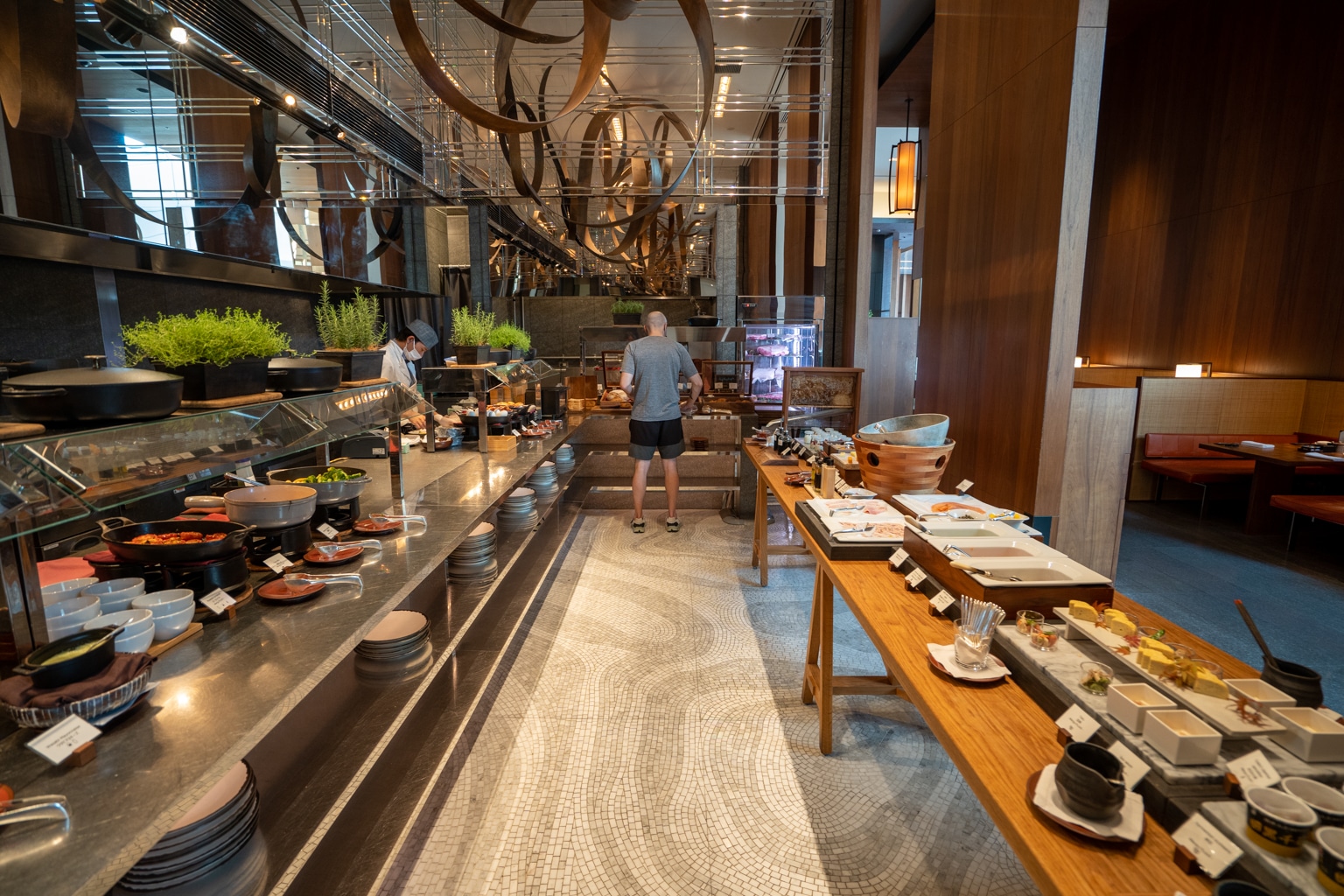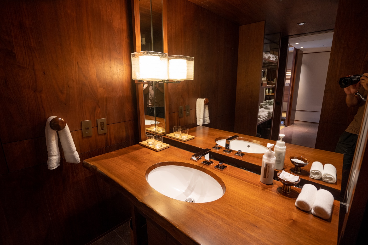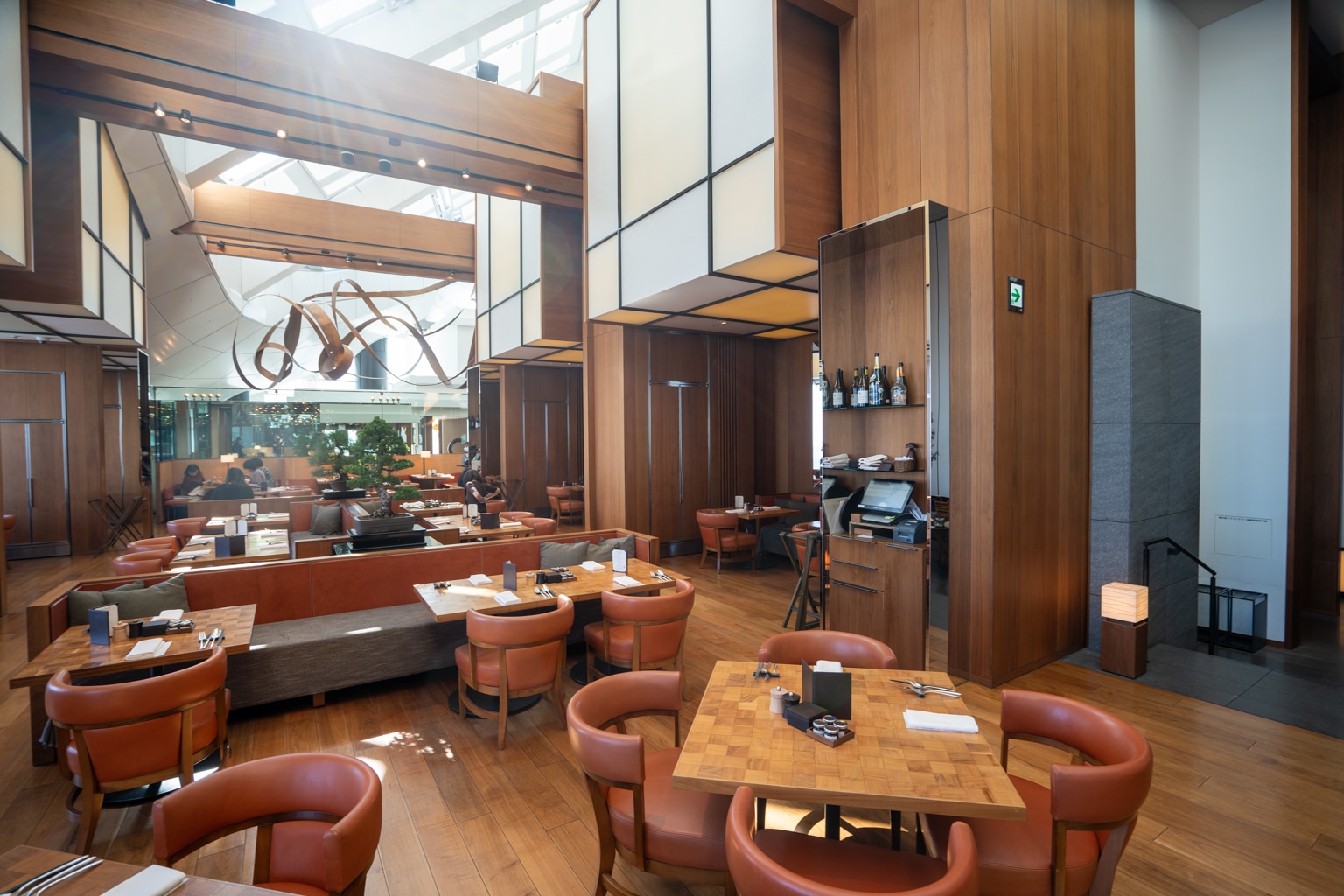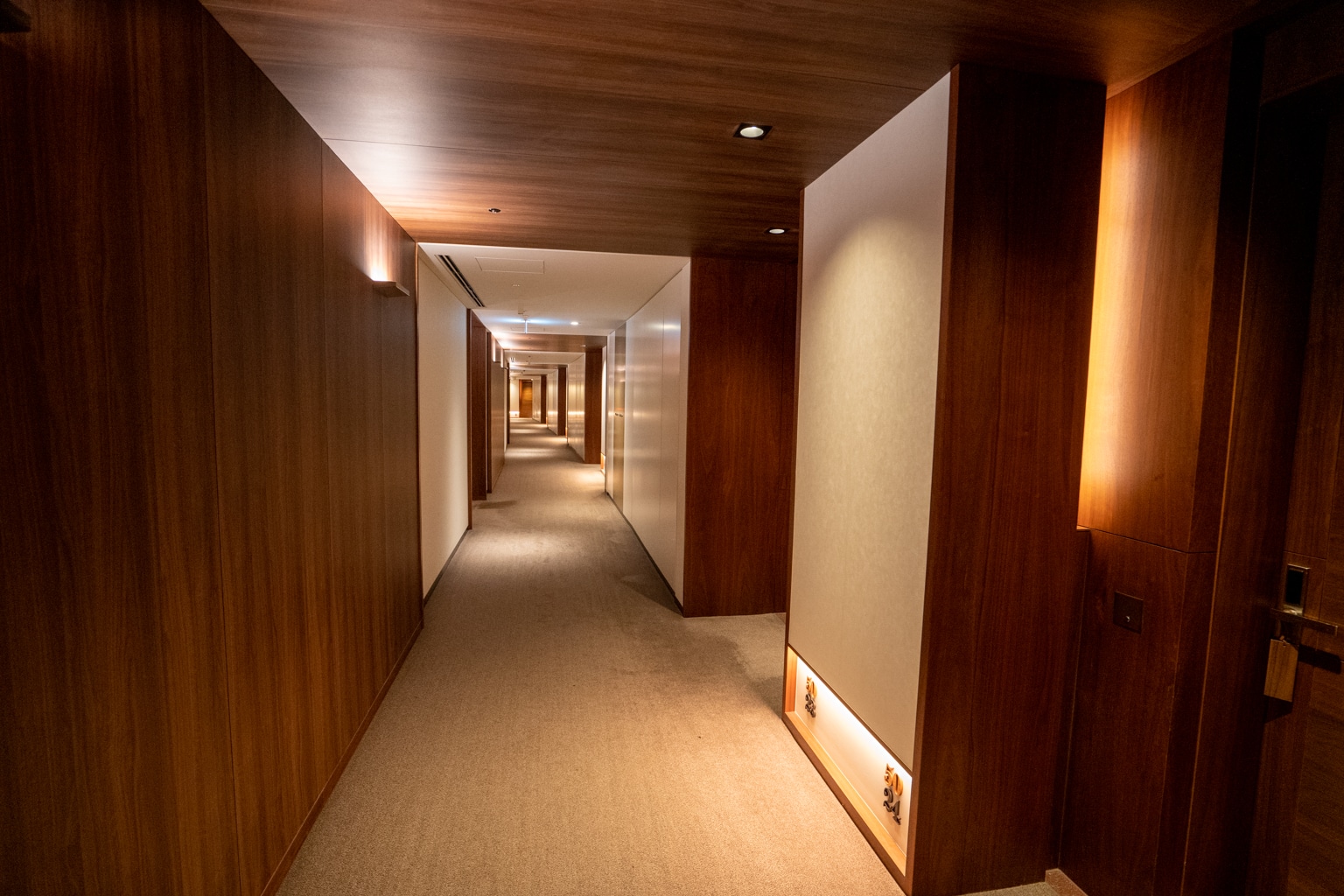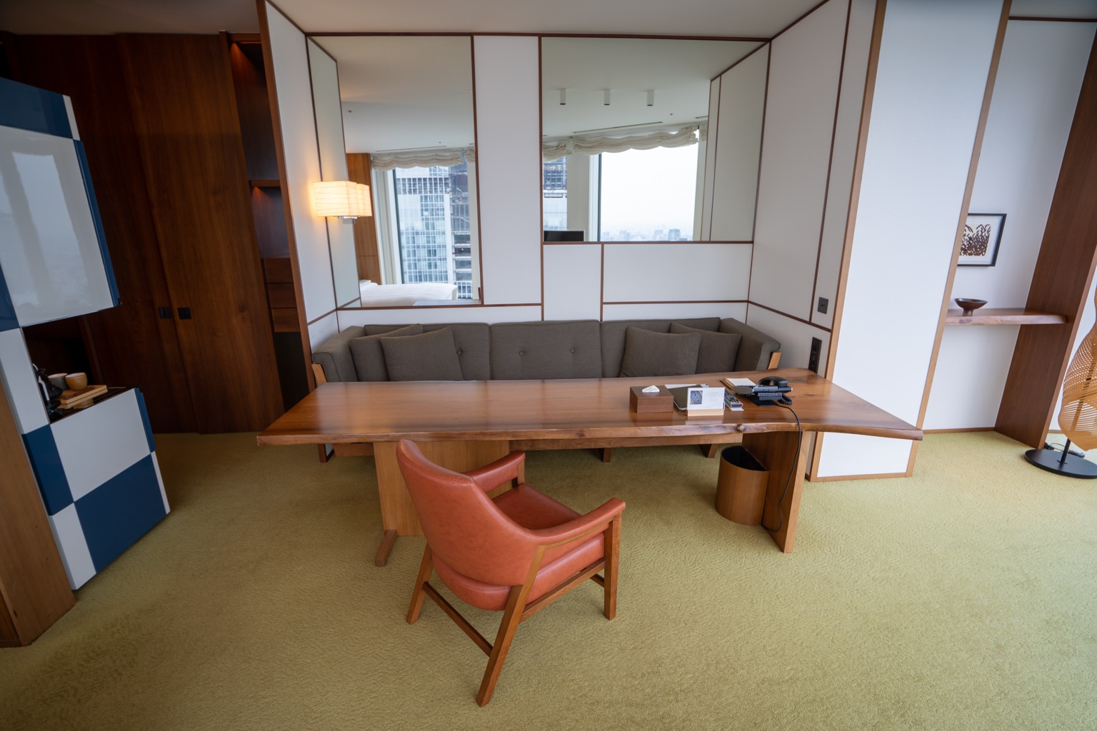 Upon entering the lobby, I took note of the warm, bronze, and wooden tones. There’s an eye-catching feature wall in the lobby with a towering kumiko wood mosaic that exudes a sense of grandeur.