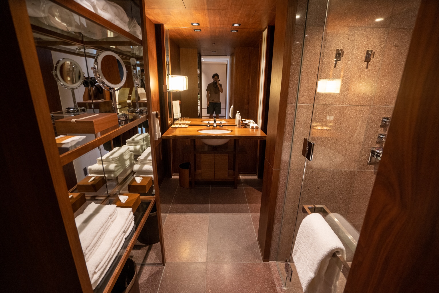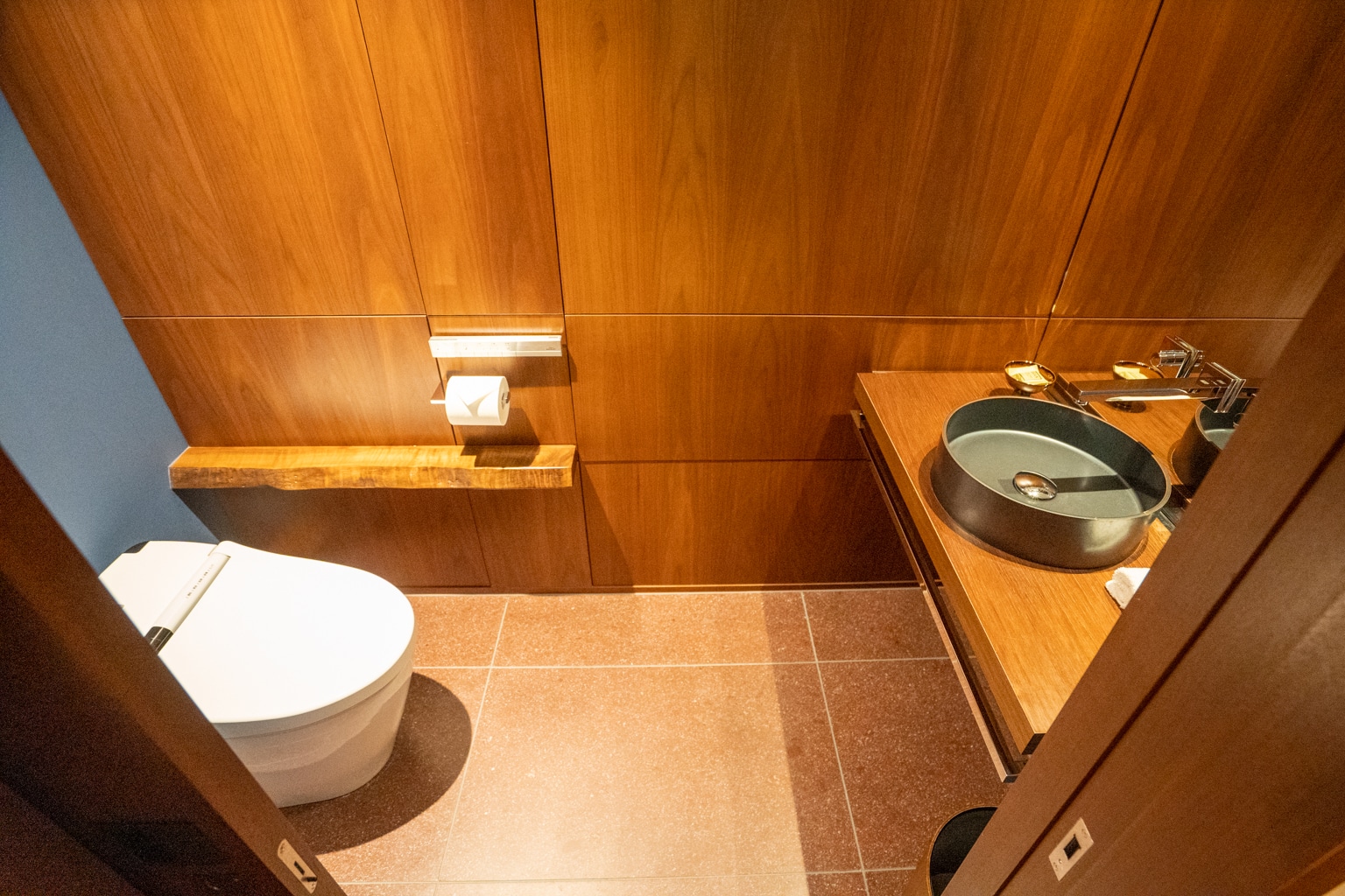 The bathroom was quite striking and elegant, with a monotone wooden theme. The space was adorned with dark walnut walls and ceilings with touches of granite.