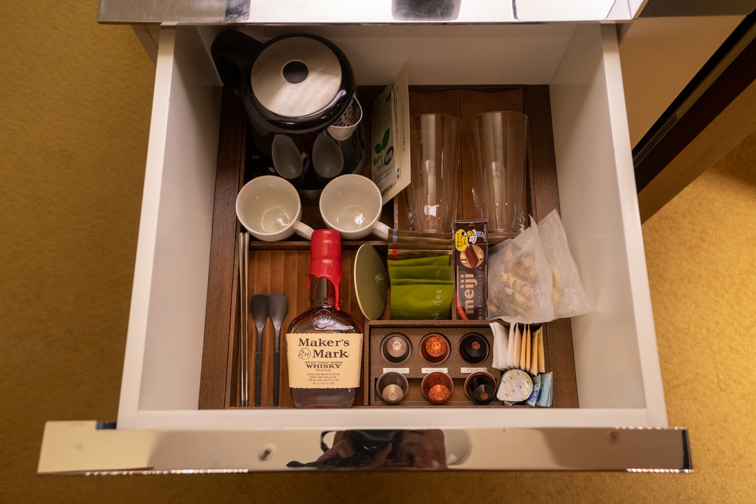 There is a well-stocked minibar with a handful of complimentary snacks and non-alcoholic drinks, including a Nespresso machine and tea station.