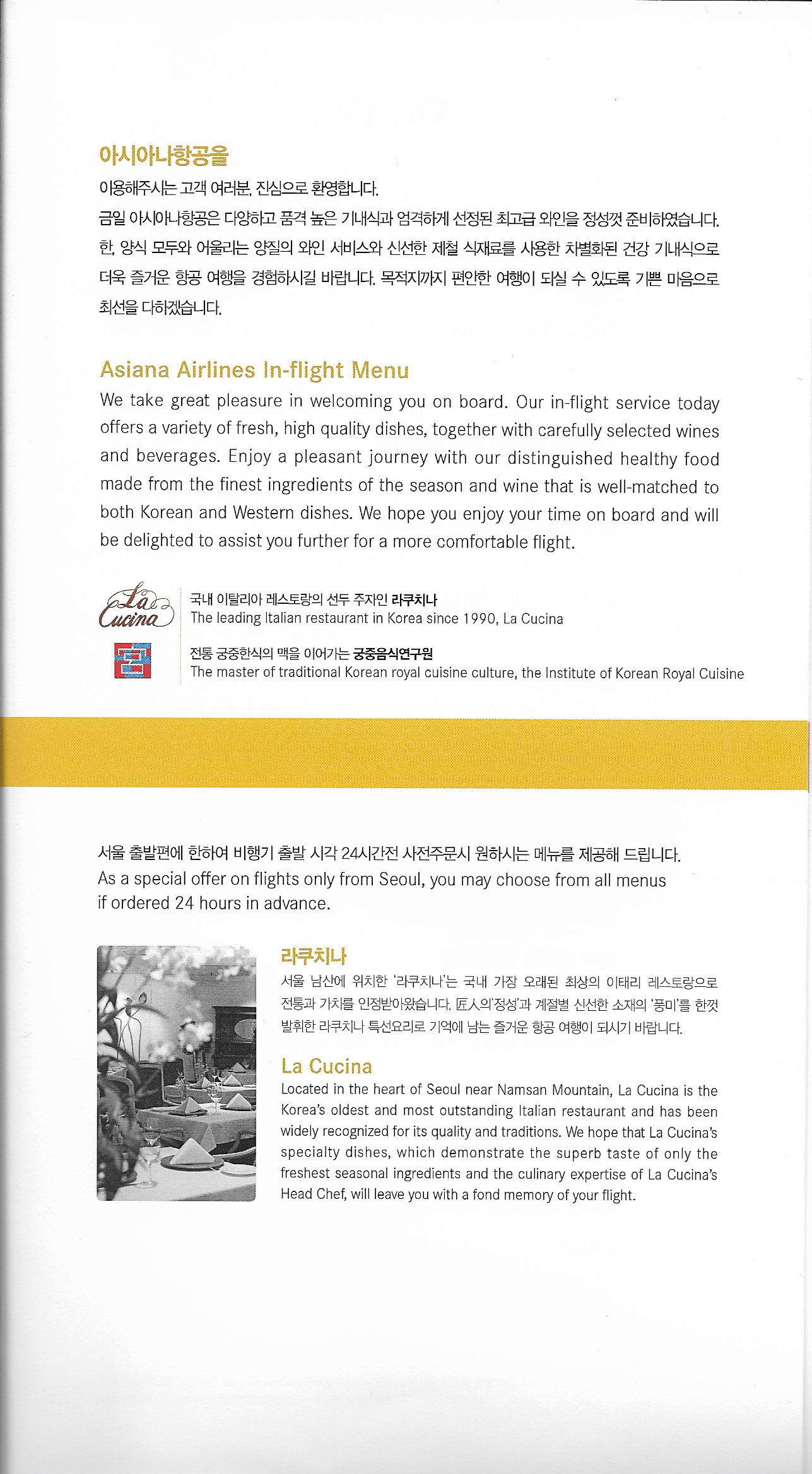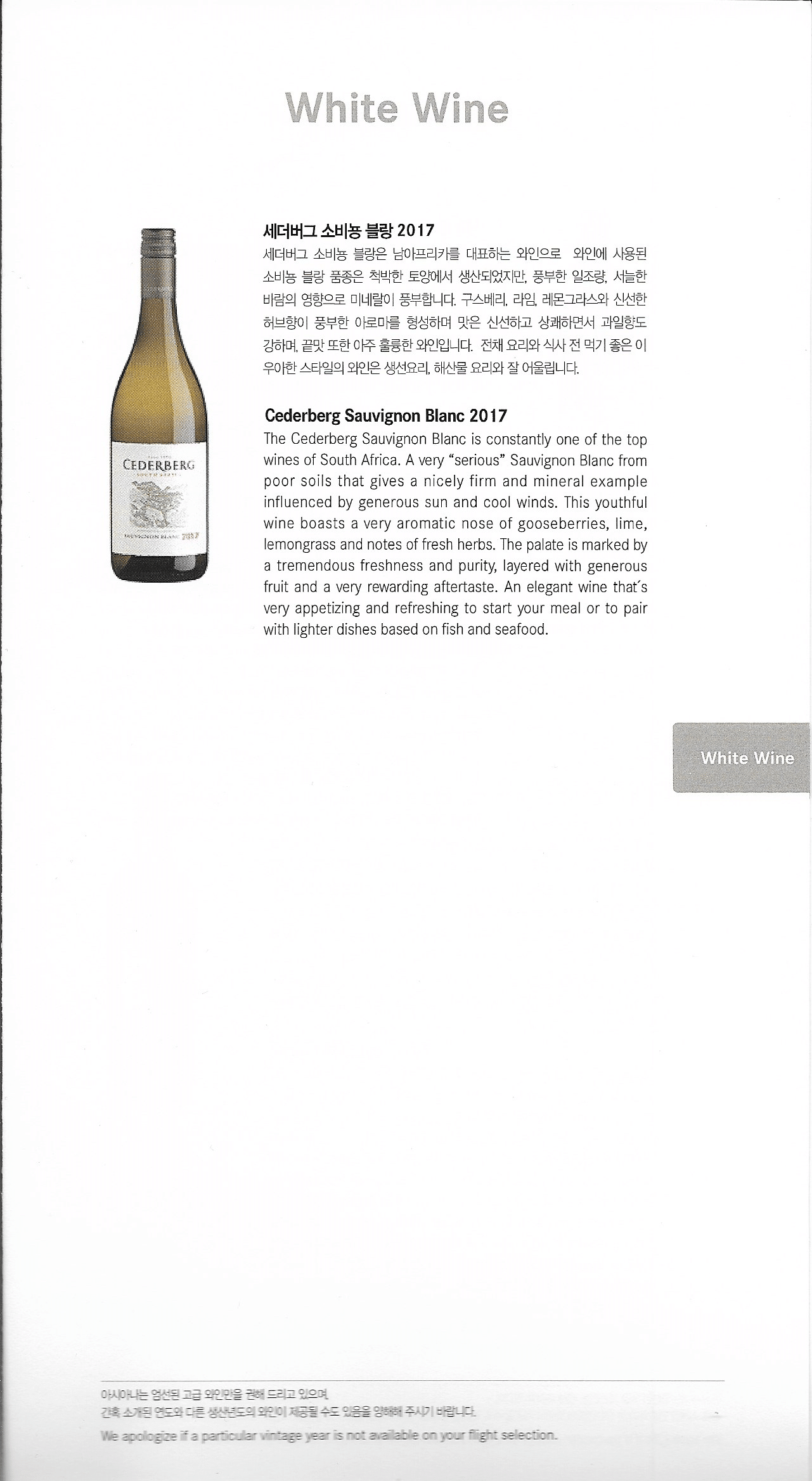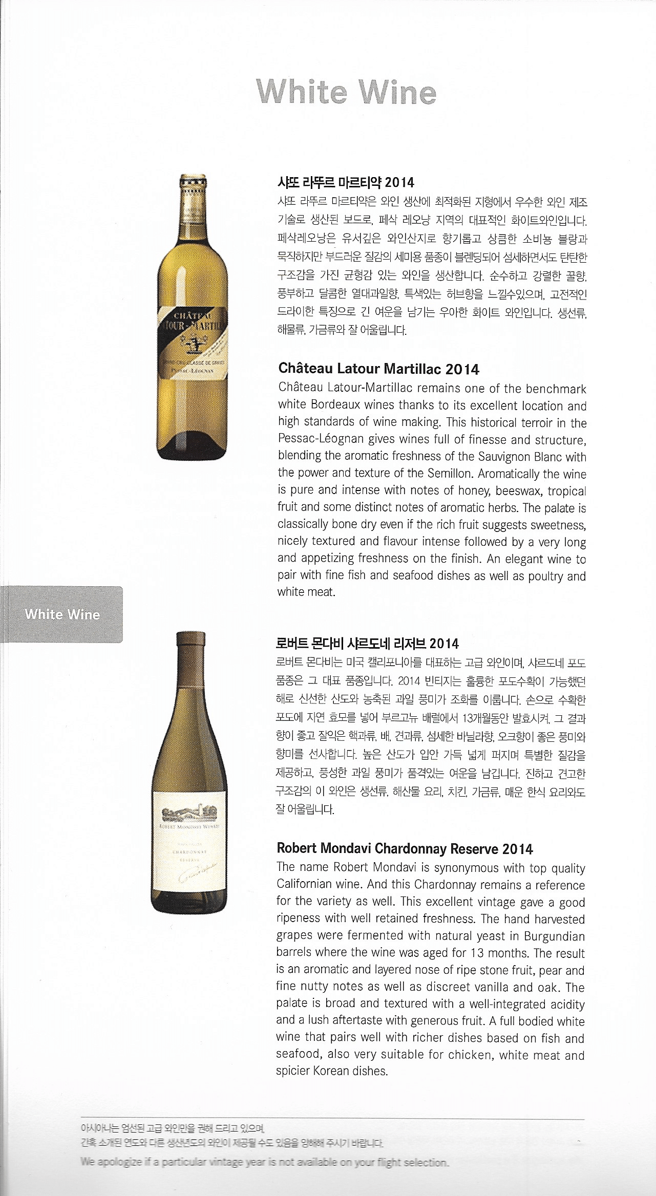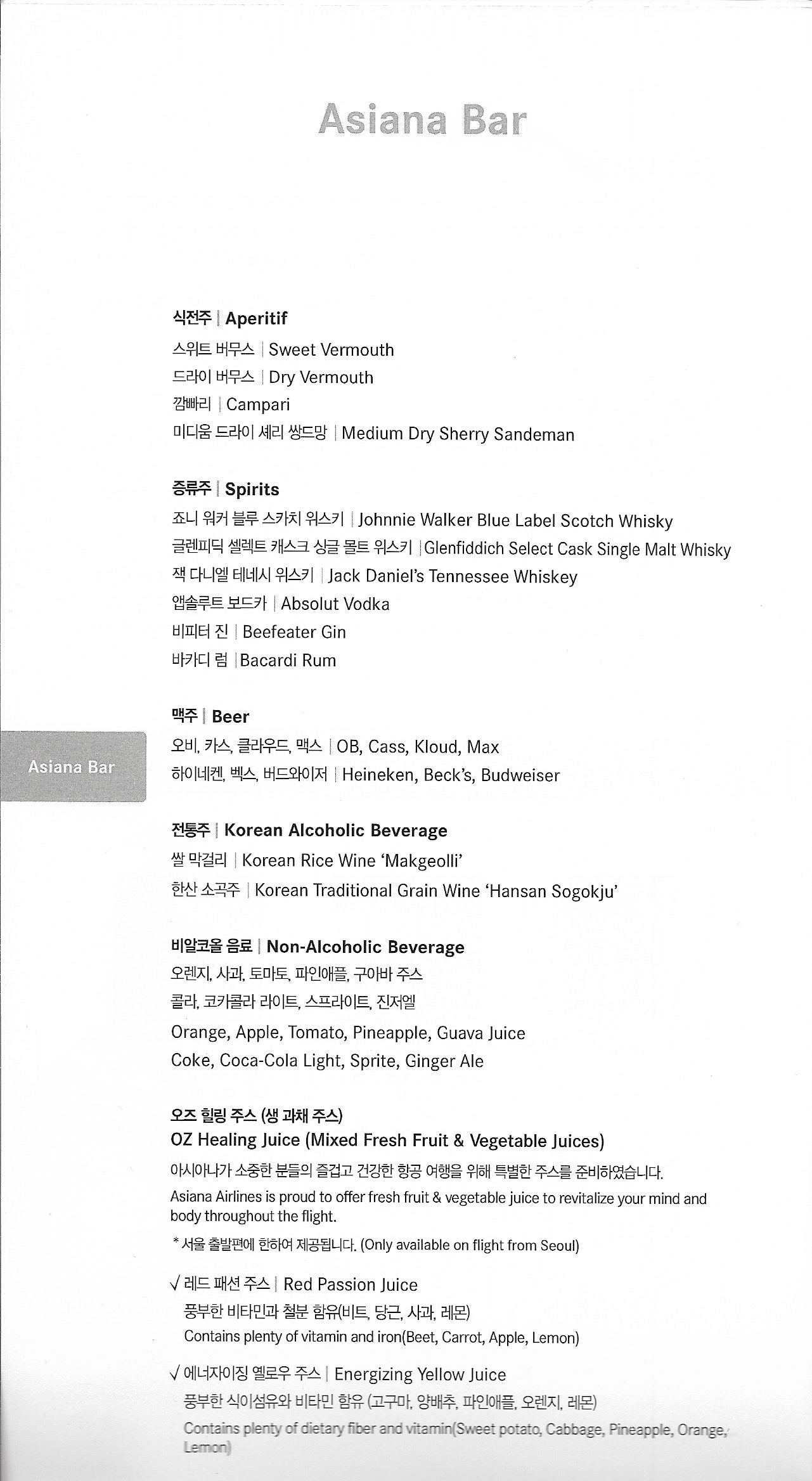 Asiana Airlines First Class – Menu and wine list