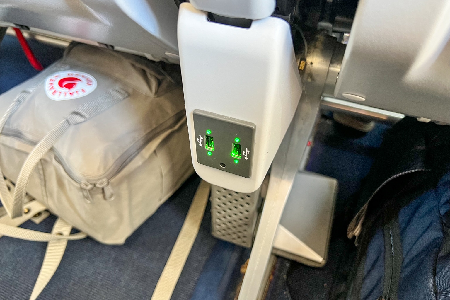 I also appreciated the added feature of USB ports down by our legs, which isn’t always available on short flights like this one.