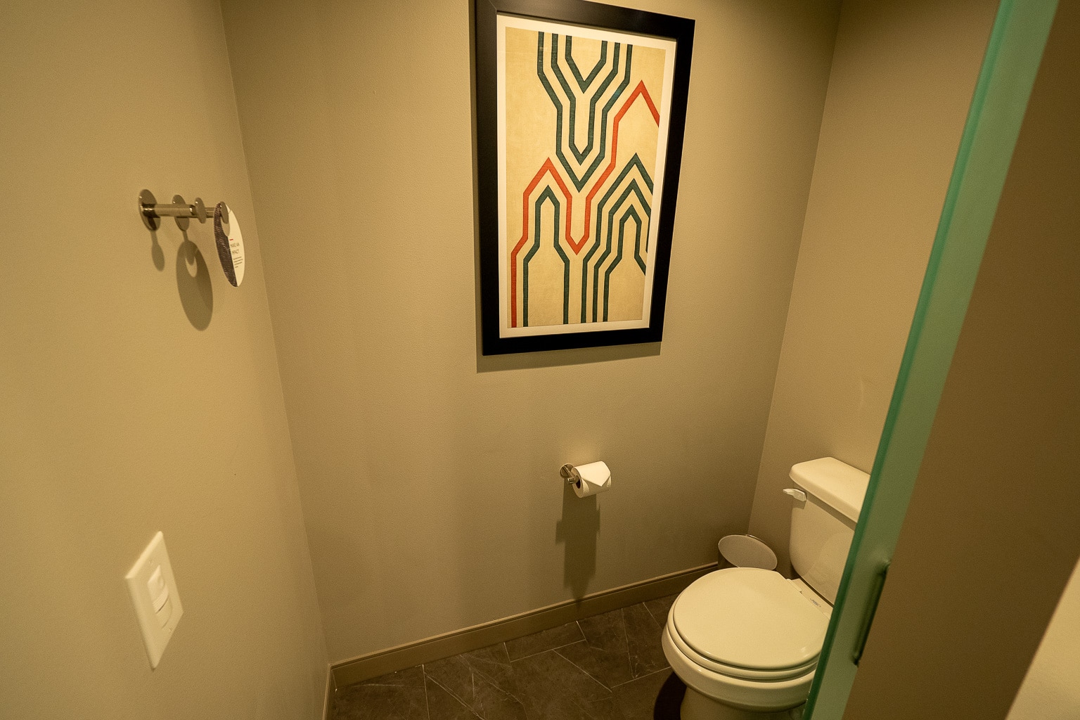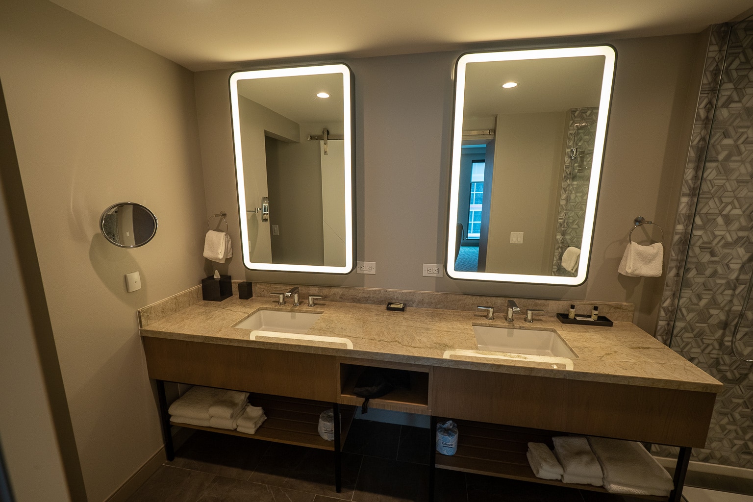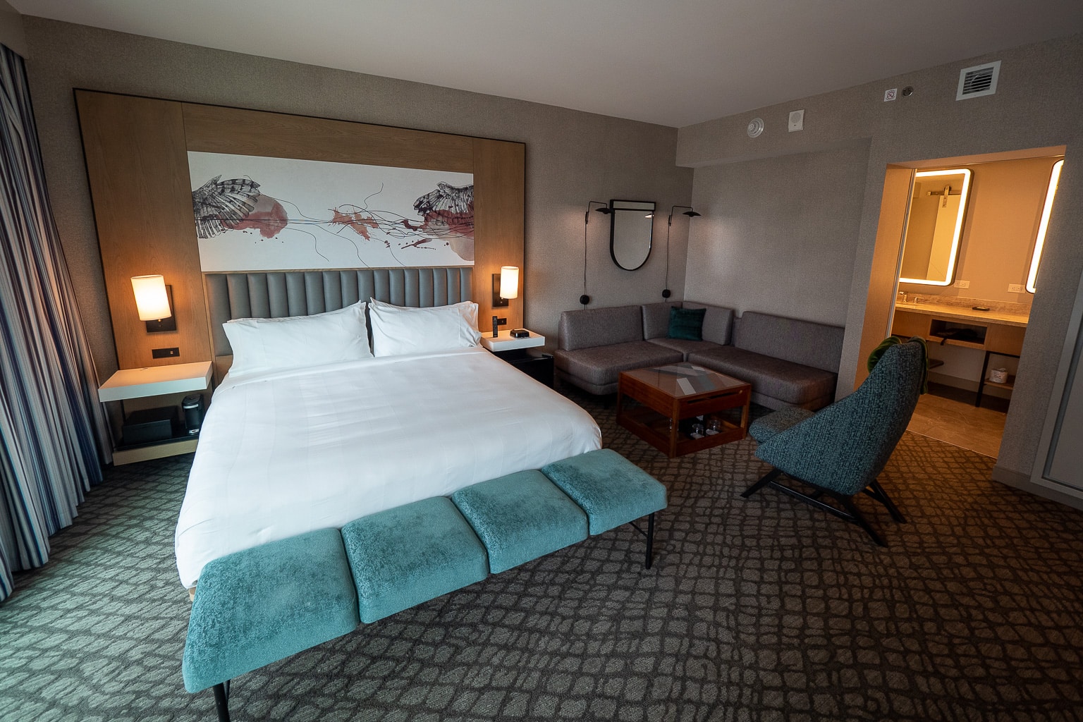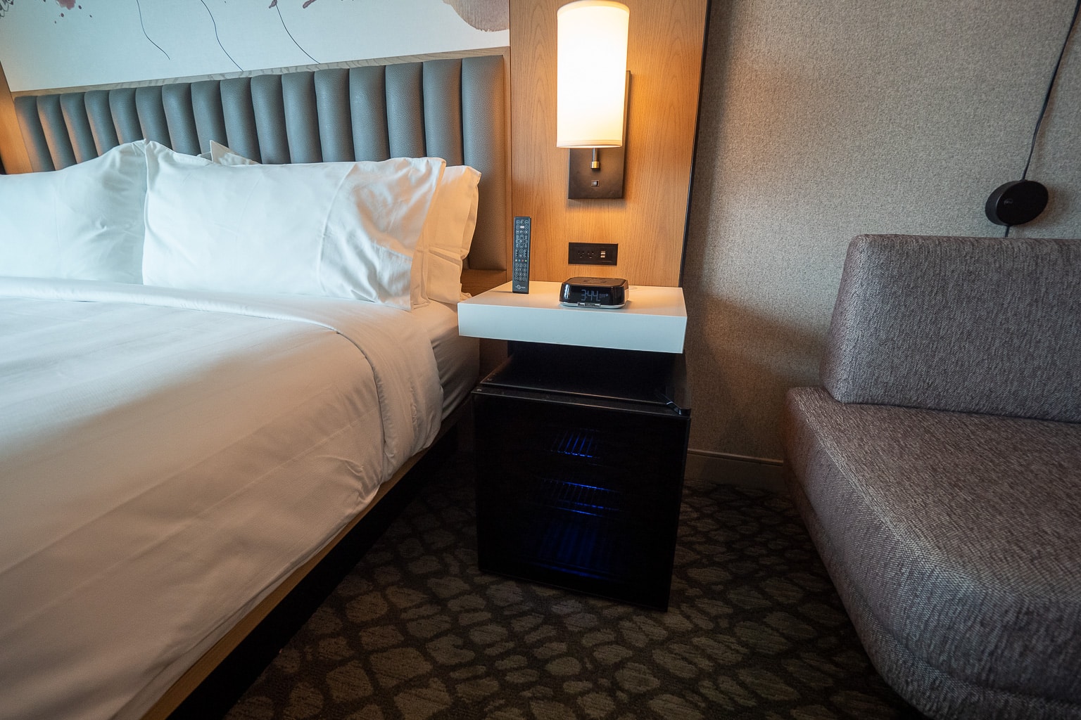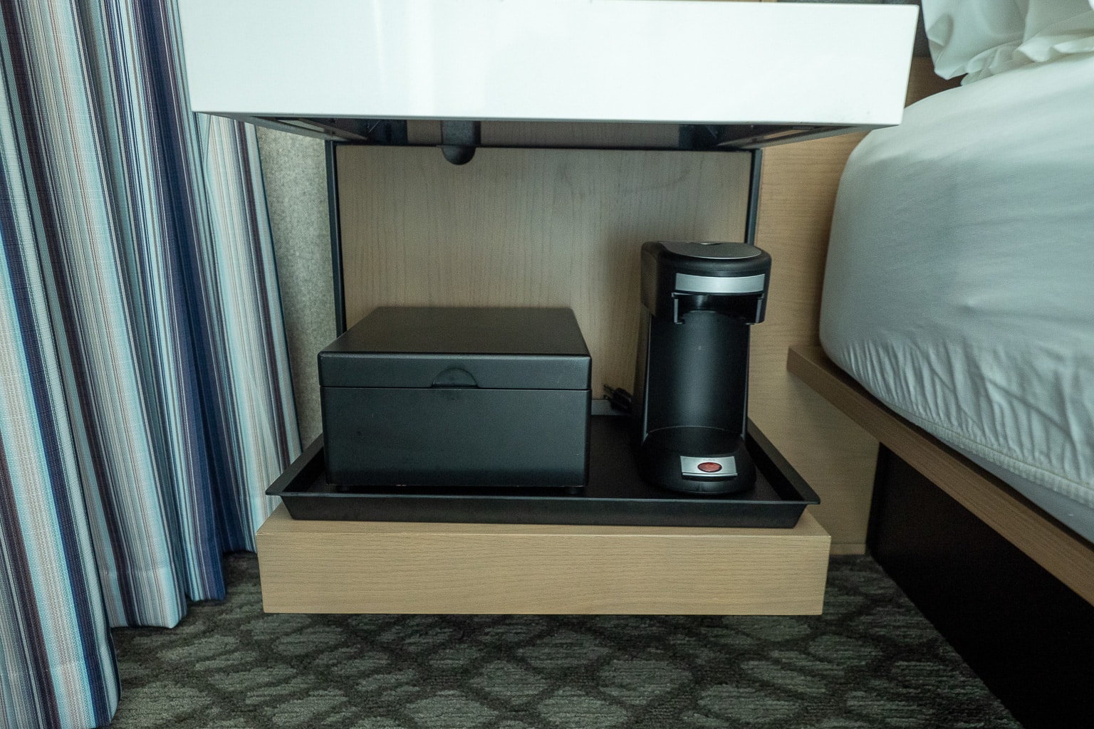 In fact, there were some other oddities about the suite’s configuration, despite being fully featured. For one, the mini-fridge and hot beverage caddy are underneath the nightstands beside the California king bed.