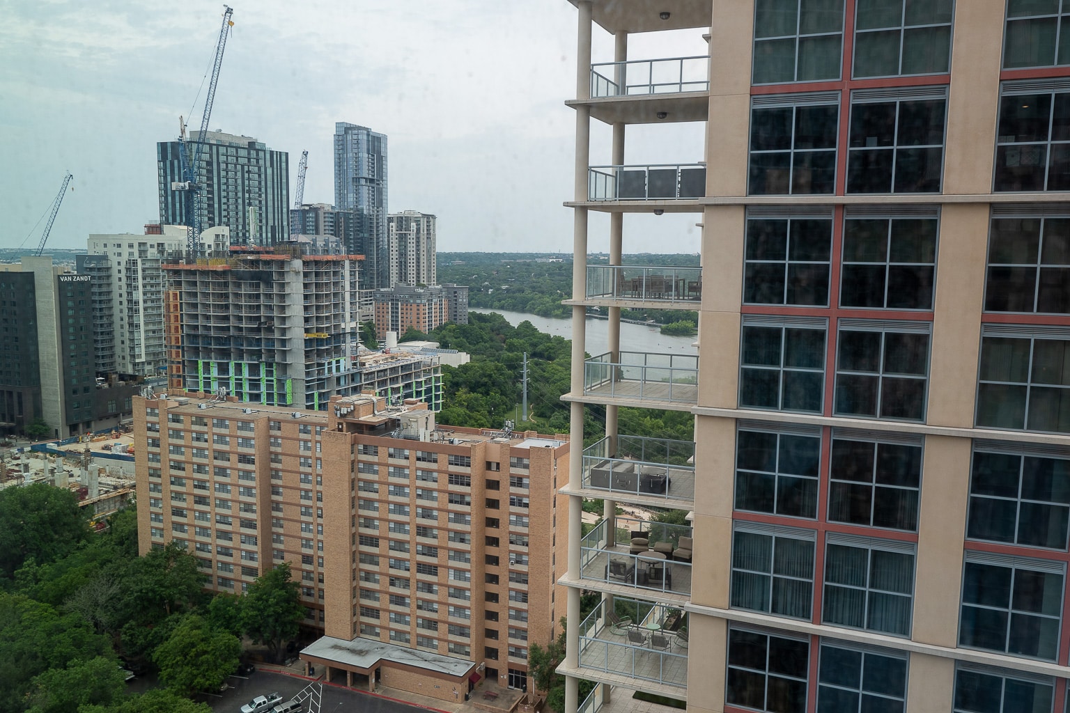 The southward-facing vista of this particular room faces condominium towers, with views of kayakers and paddleboarders enjoying the nearby Lady Bird Lake.