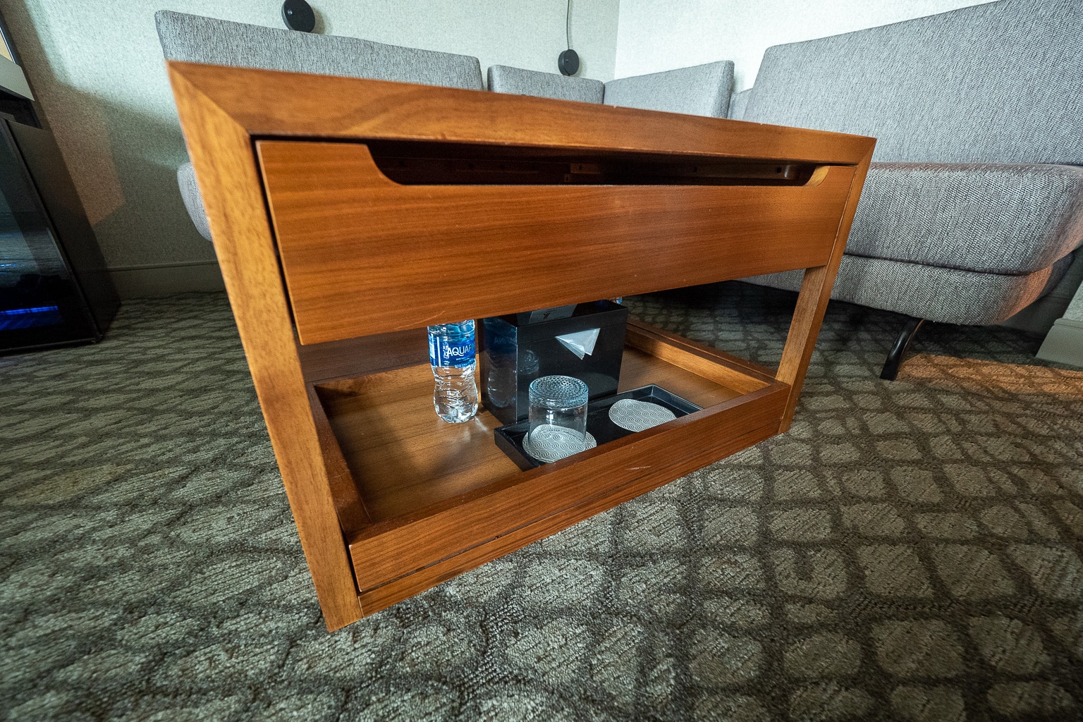 The coffee table has a peculiar set-up, with amenities and water bottles stashed underneath, out of sight and easy to miss.