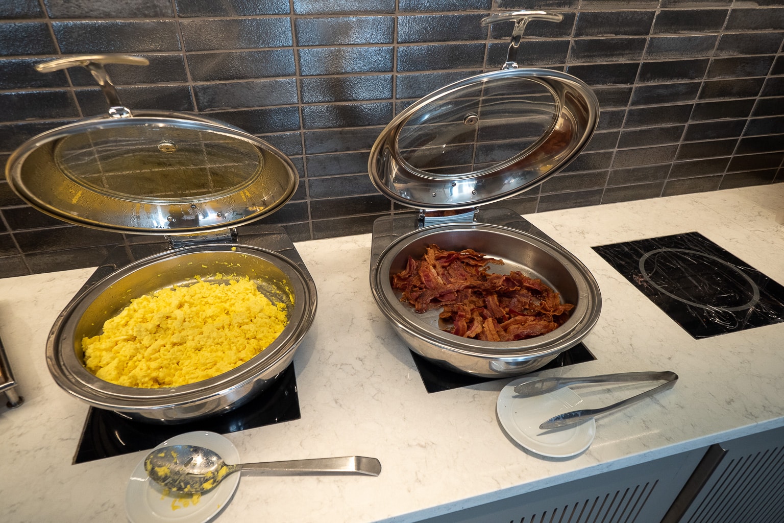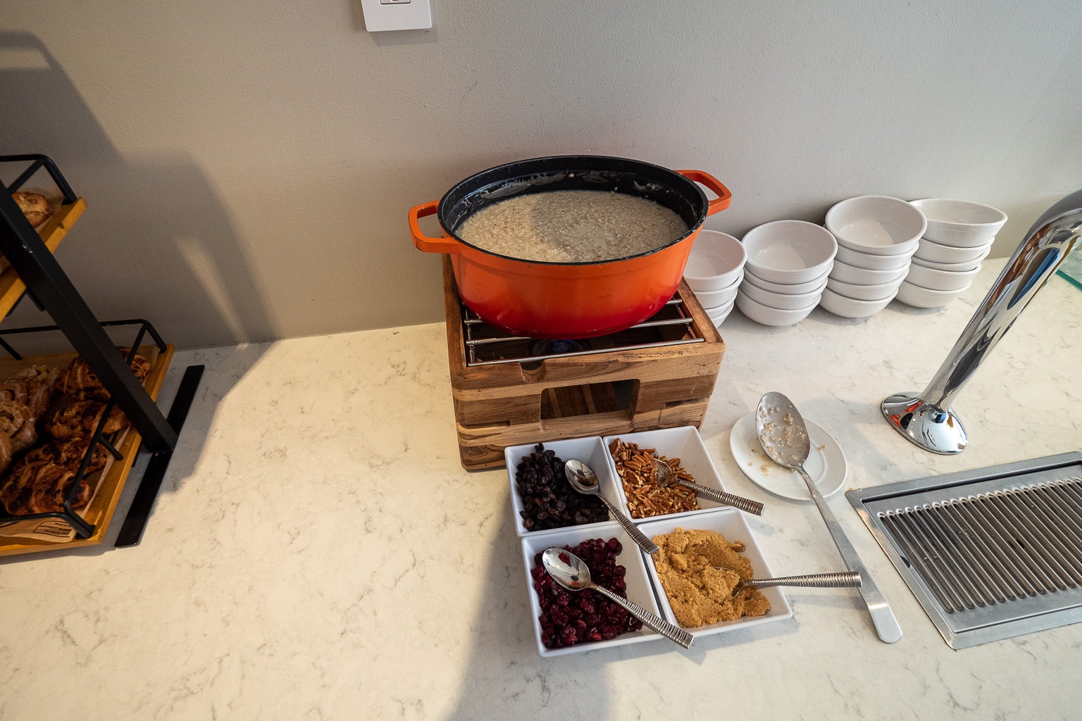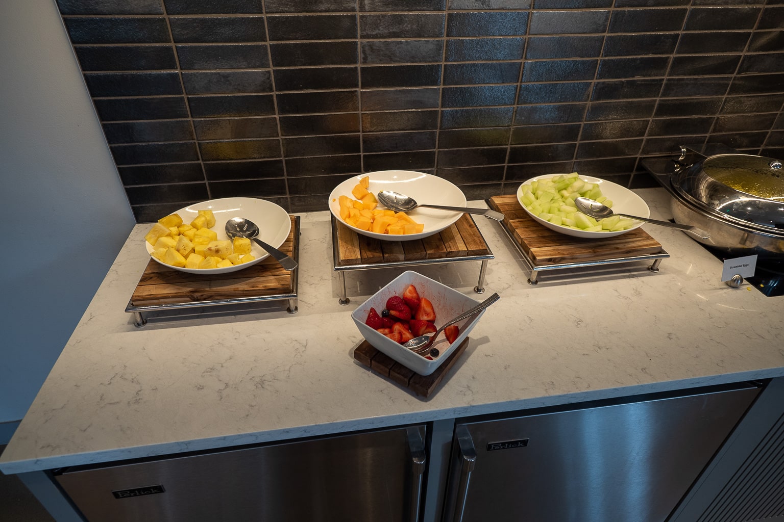 The self-serve breakfast buffet has a selection of fresh fruit, basic hot fare including scrambled eggs and either bacon or sausage depending on the day, pastries and bread, and yogurt.