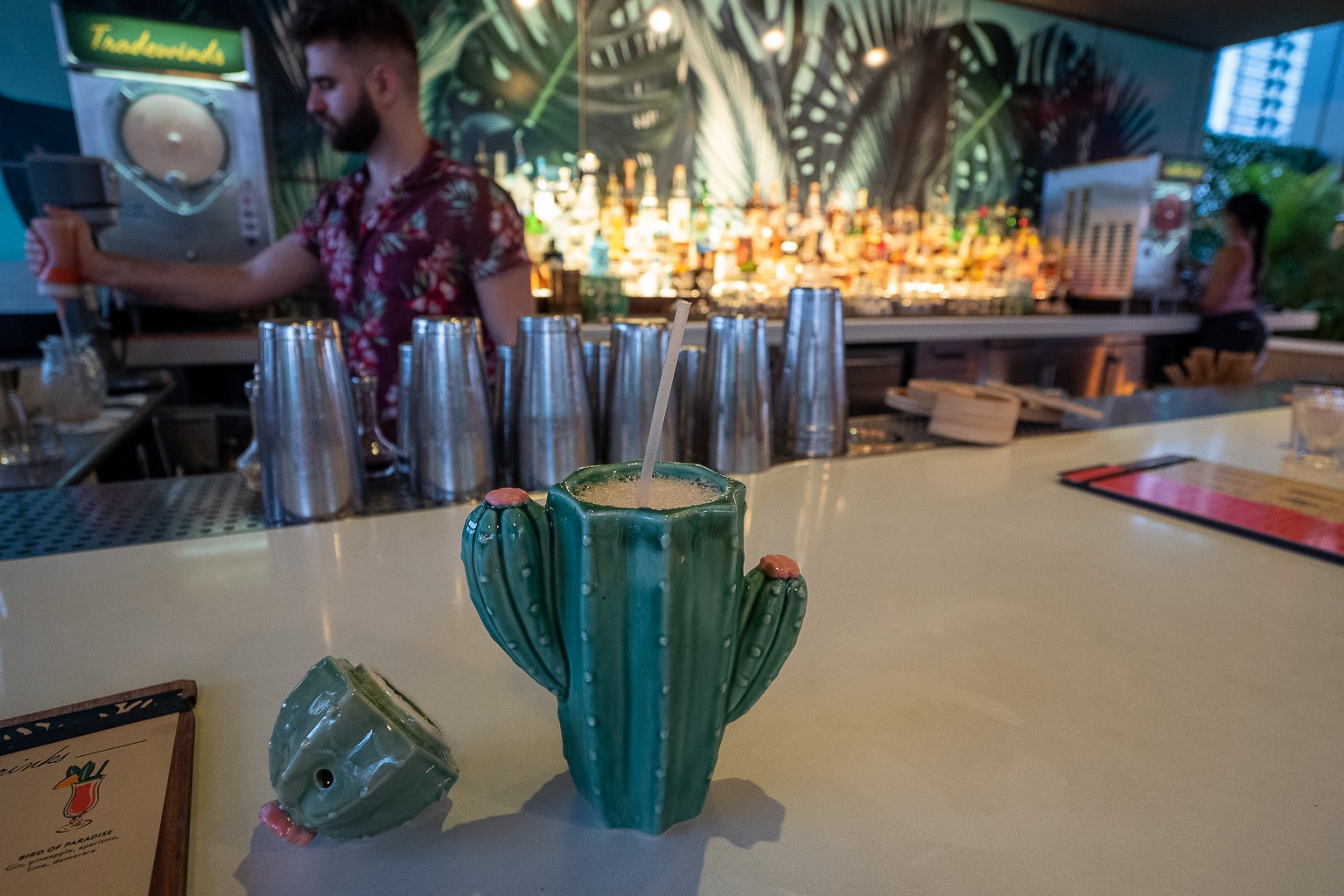 I enjoyed a Feels Like Summer, one of many fruit-forward cocktails served in its own garish cactus-shaped glassware.