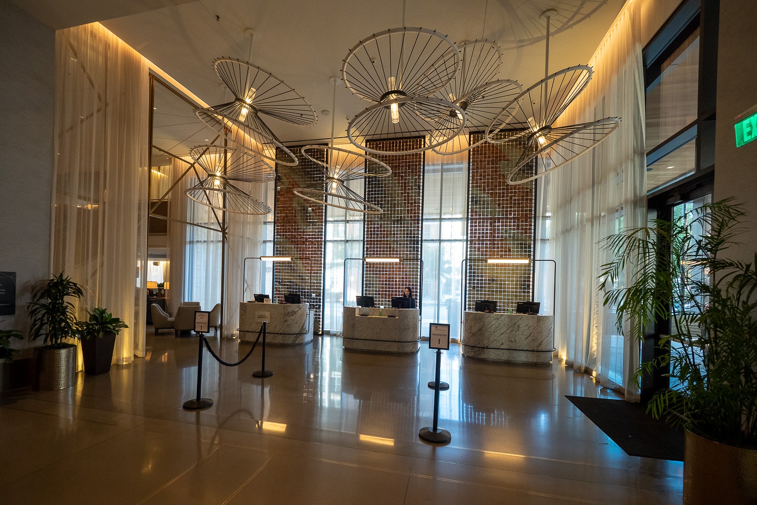 The high-ceilinged lobby is arranged as a long corridor, with the front desk to the right.