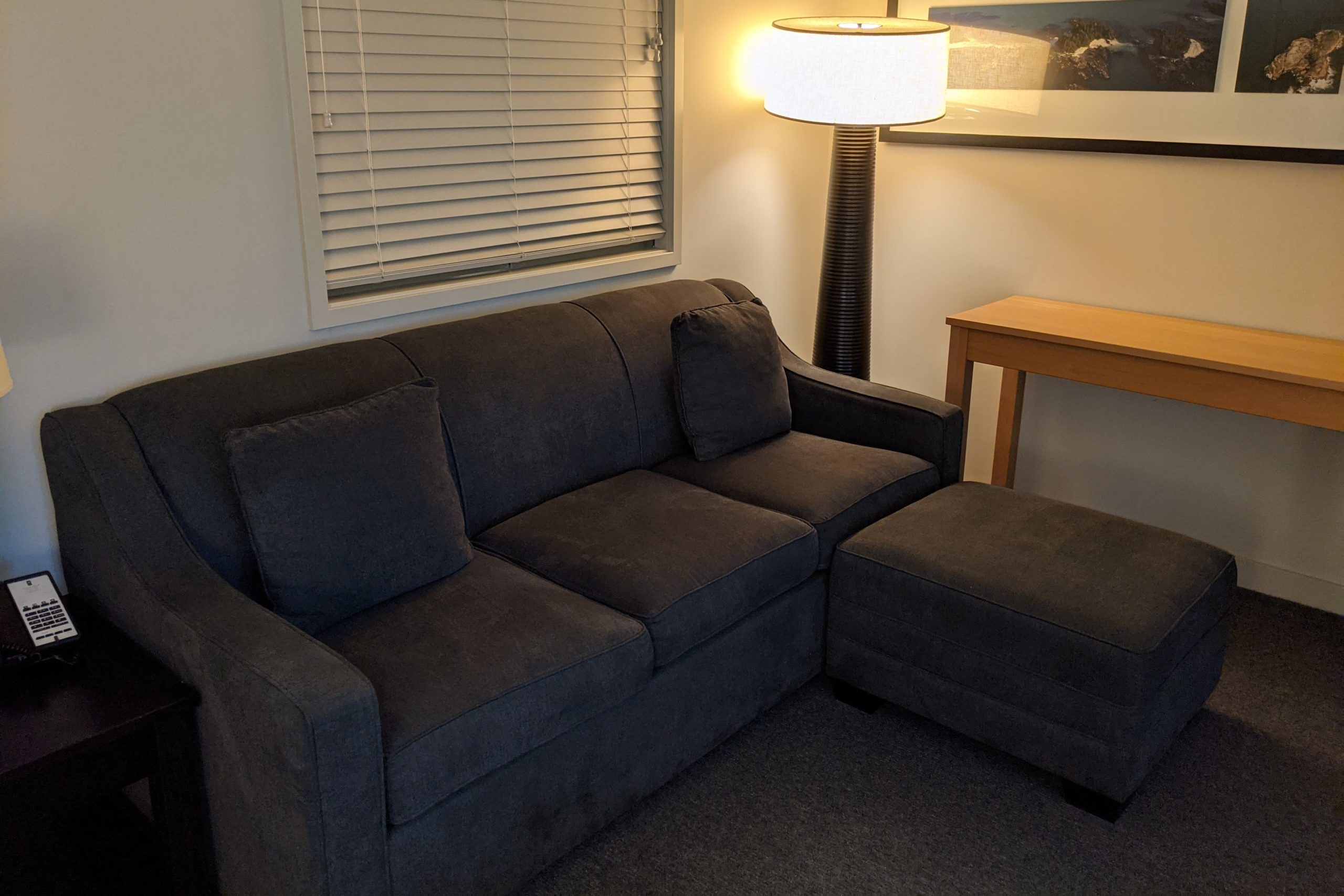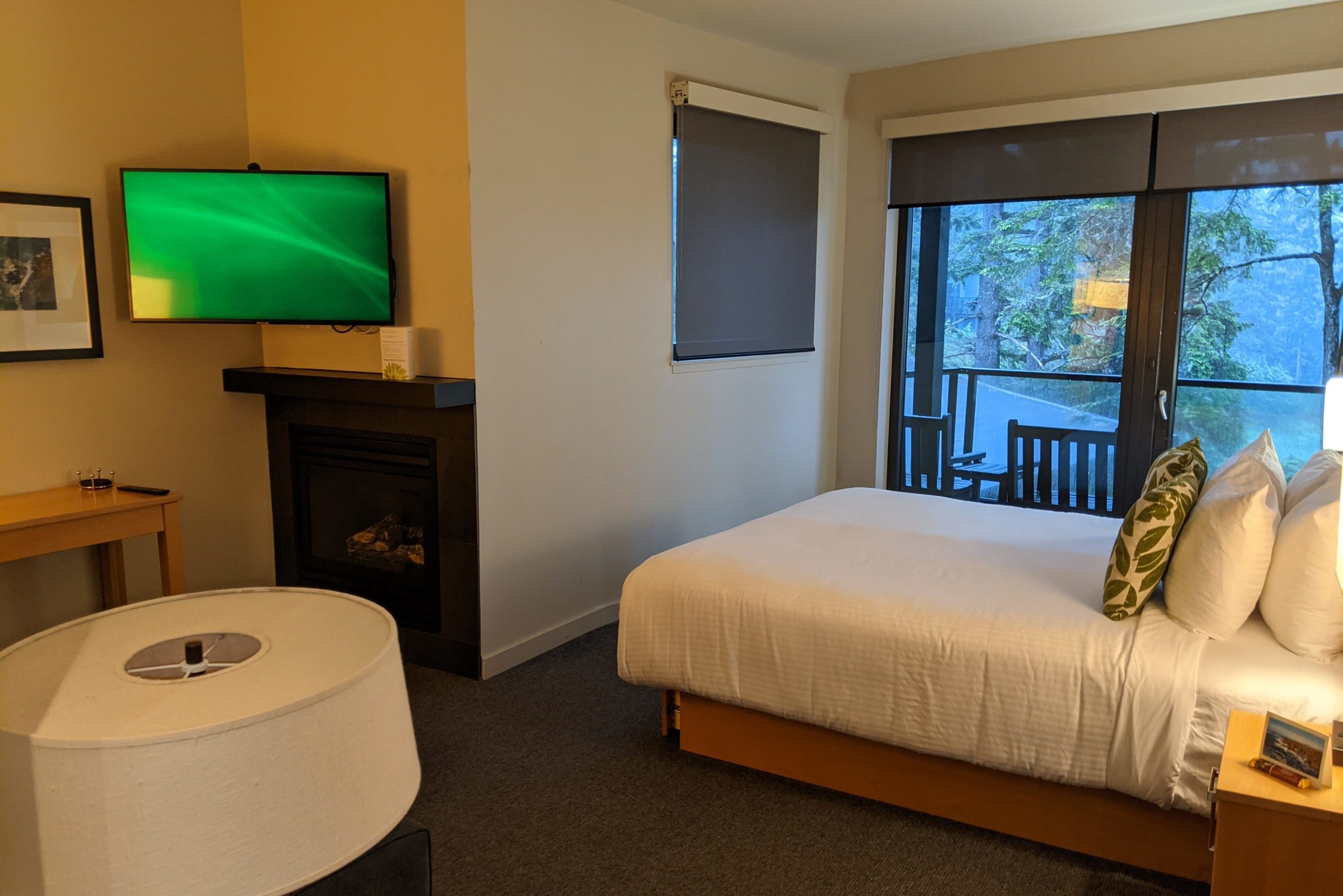 One feature of this room that I appreciated was having a couch. In similar rooms, there have been two chairs and a table instead, but I preferred this setup as I could see both the fireplace and the view at the same time.