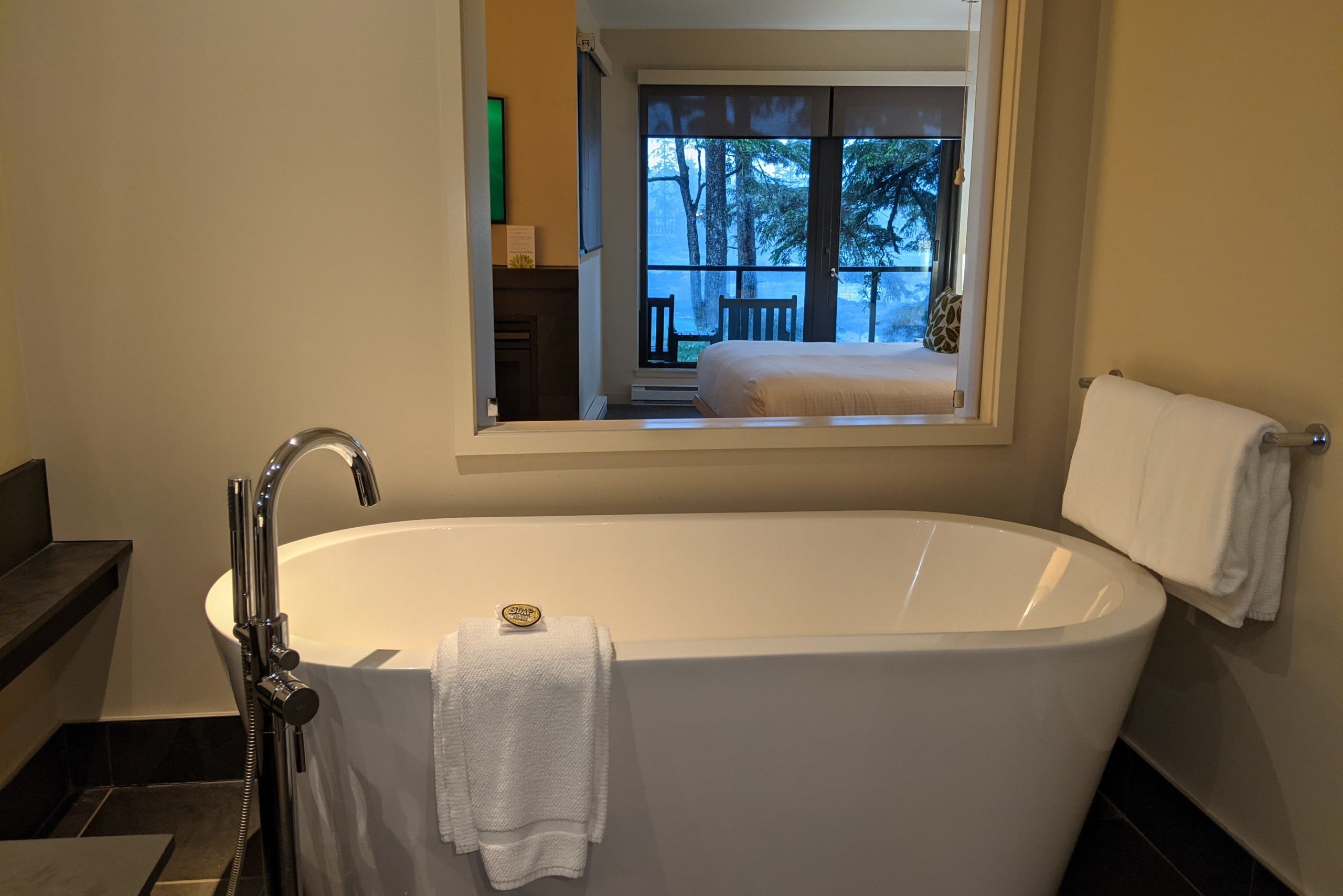 The view from the tub overlooks the room and whatever view you are treated to. With the blinds up, anyone else would be treated to a view of whatever is happening in the bathroom, too, so be mindful of this if there are others in the room.