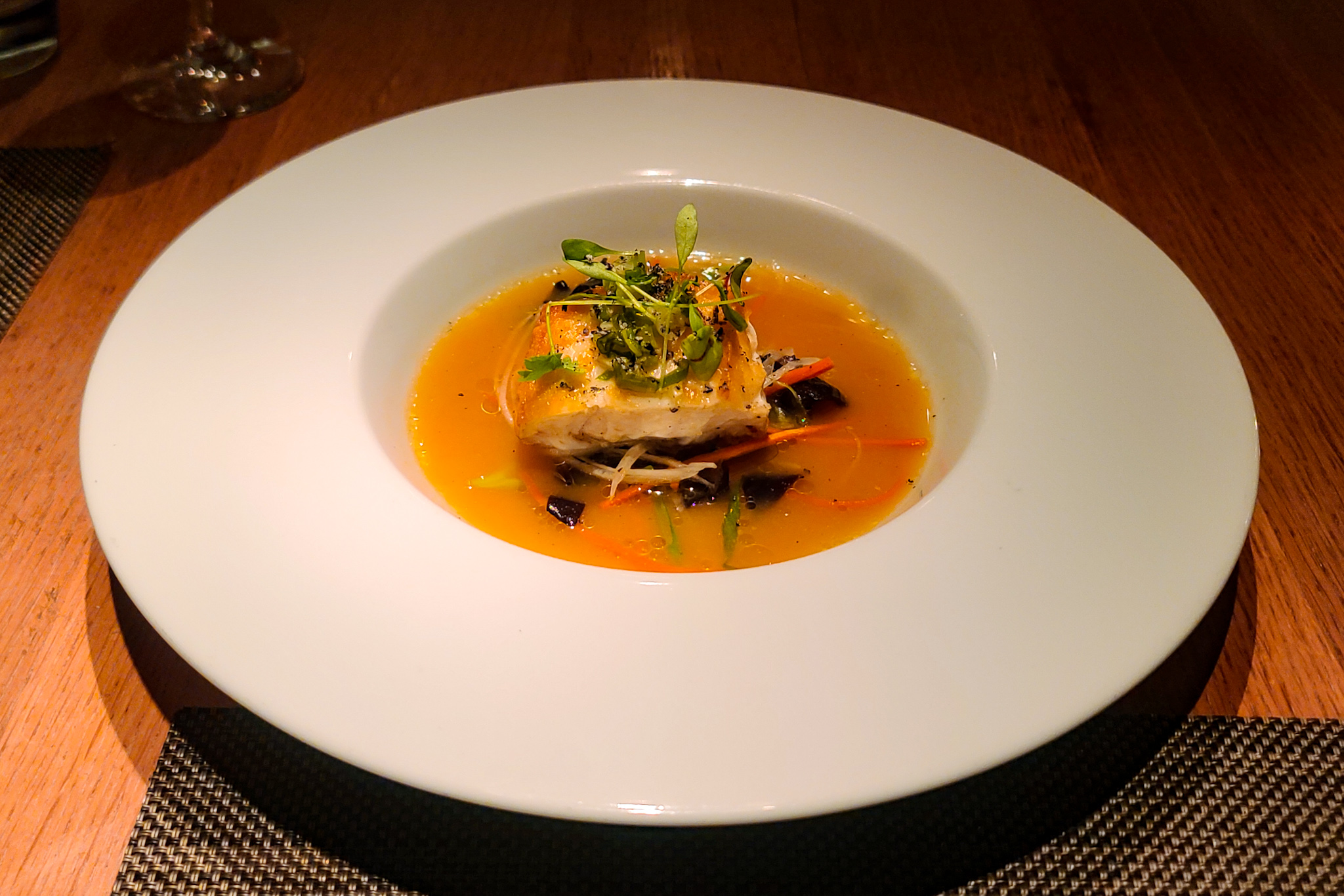 The pan-seared halibut was tender with a subtle sweetness. The dish took inspiration from Thai cuisine, with notes of ginger, sesame and miso coming from the broth.