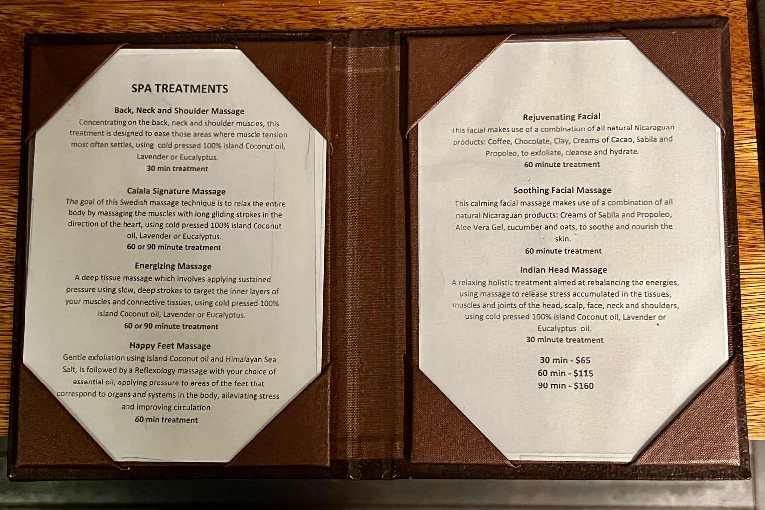 The spa menu reads as as follows: