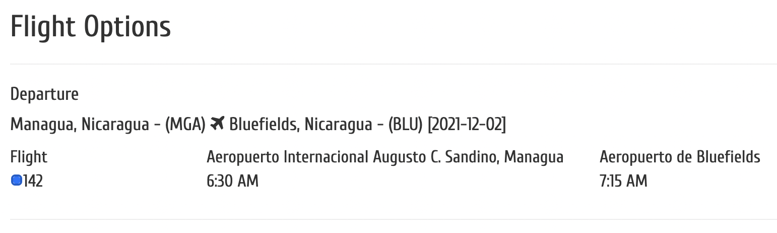 The times of day at which you can make the journey are determined by the flight schedules of La Costeña Airlines, Nicaragua’s domestic airline. Due to the COVID-19 pandemic, La Costeña currently only offers one daily service between Managua and Bluefields (and vice versa) in the mornings.