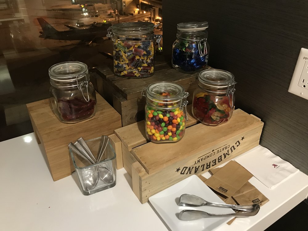 The M Club in this hotel consisted of one large room, with varied seating options spread out throughout the space. In the far corner of the lounge there was a telescope, which you could use to look at the planes up close. It seems like everywhere with half-decent views of an airport runway is getting a telescope these days, and I absolutely love it.