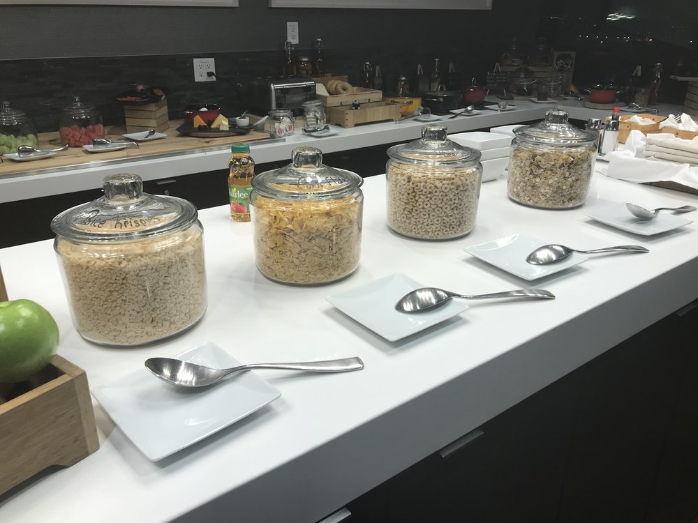 The M Club is open 24/7, but offers different food spreads depending on the time of day. A small snack selection consisting of cookies and candies is available round-the-clock. The same is true for the juice and pop available in the drink refrigerator.
