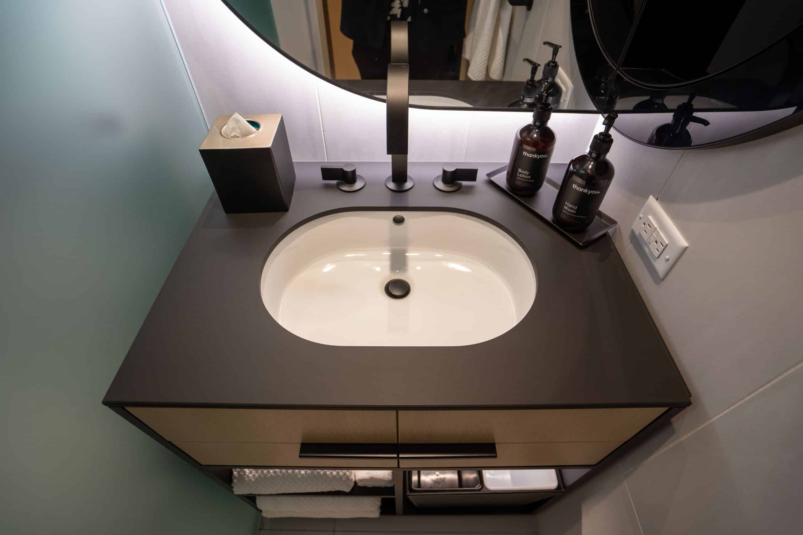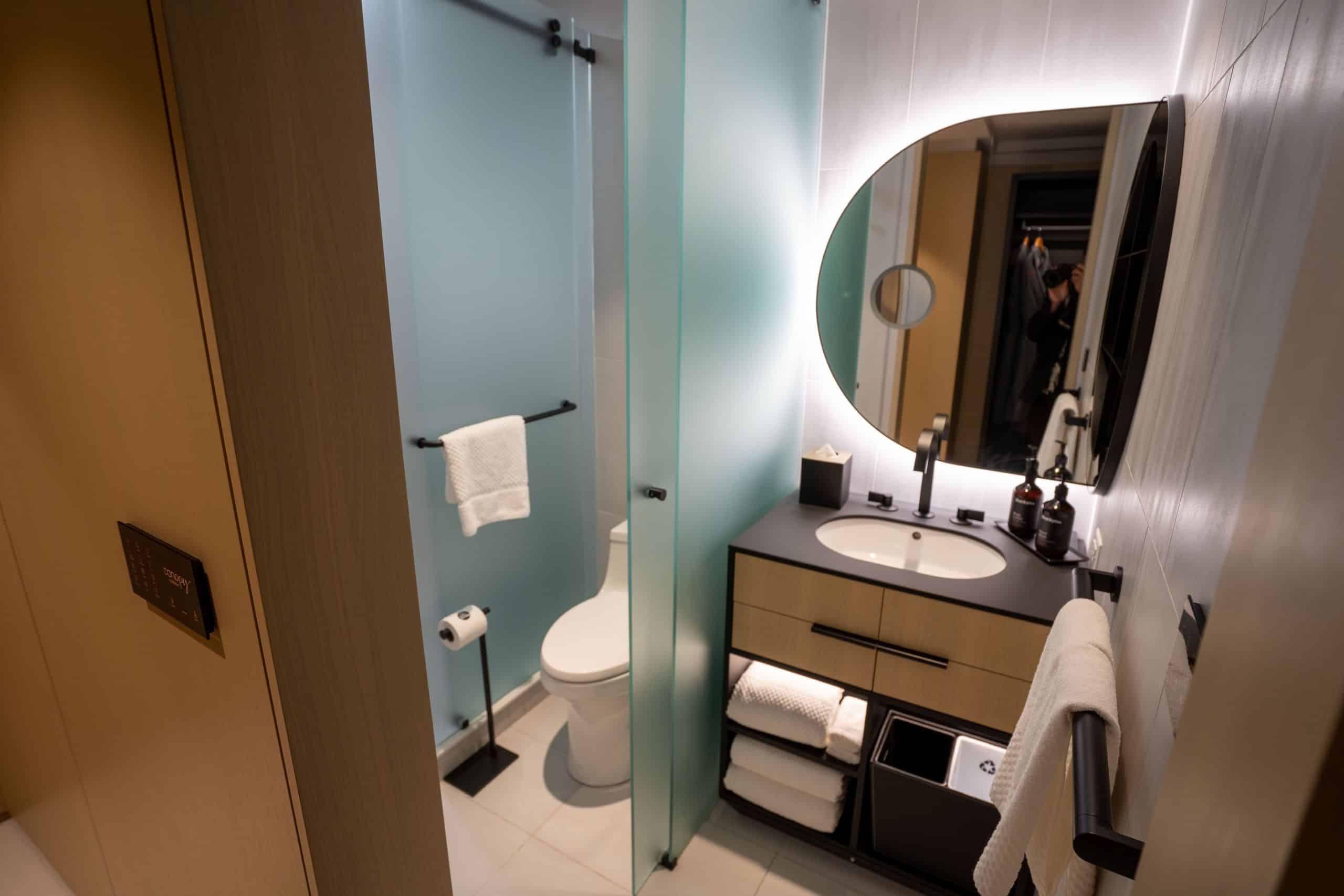 Back in the foyer, immediately to the left is the bathroom, which was definitely on the small side. However, the lighting and fixtures were attractive and stylish, including a curved LED mirror and black single vanity.