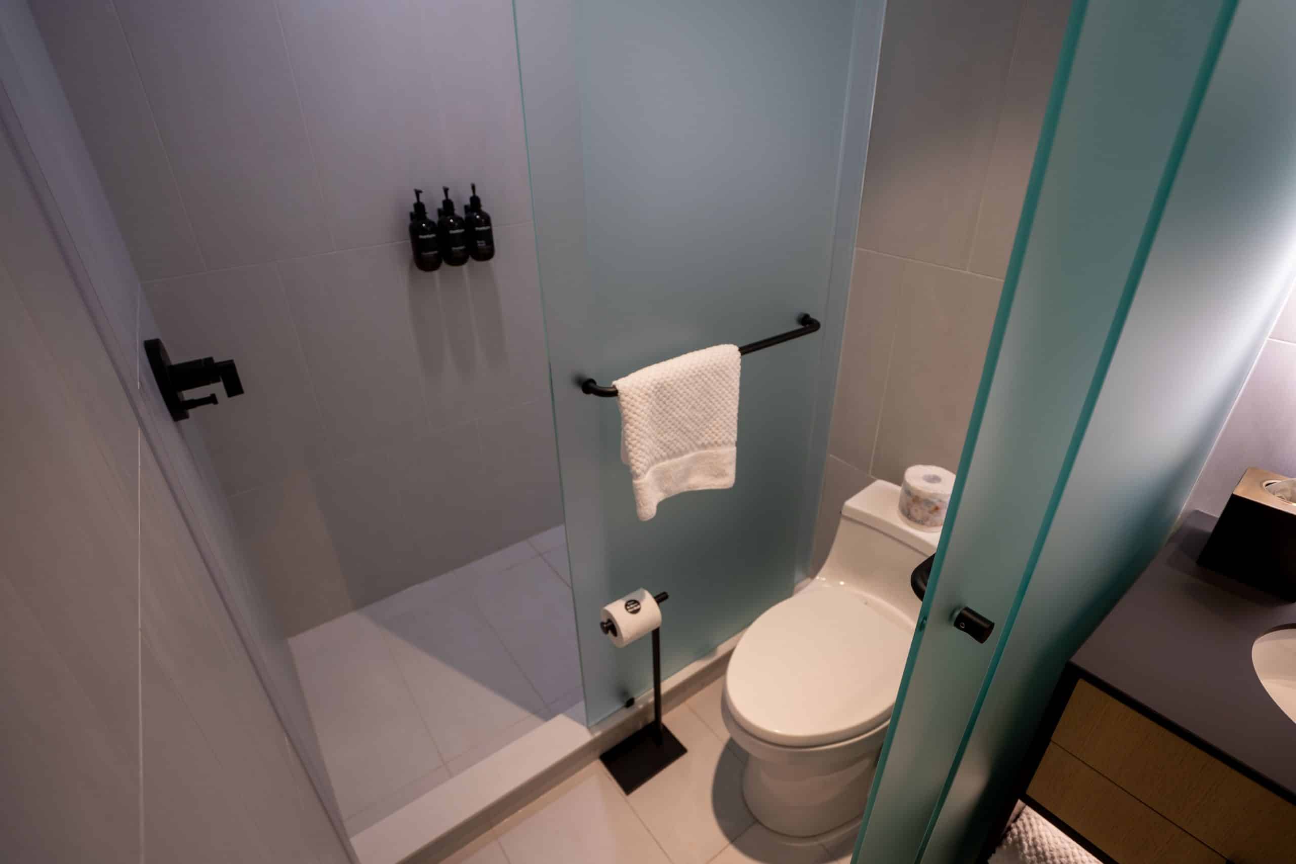 Nestled behind frosted glass, the toilet ensures maximum privacy, while a spacious shower rounds out the amenities.