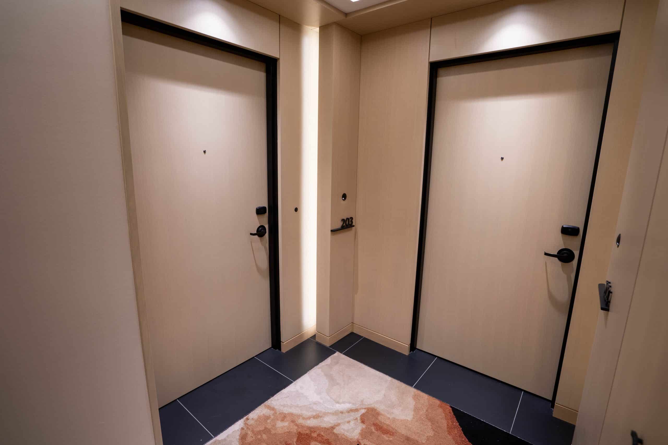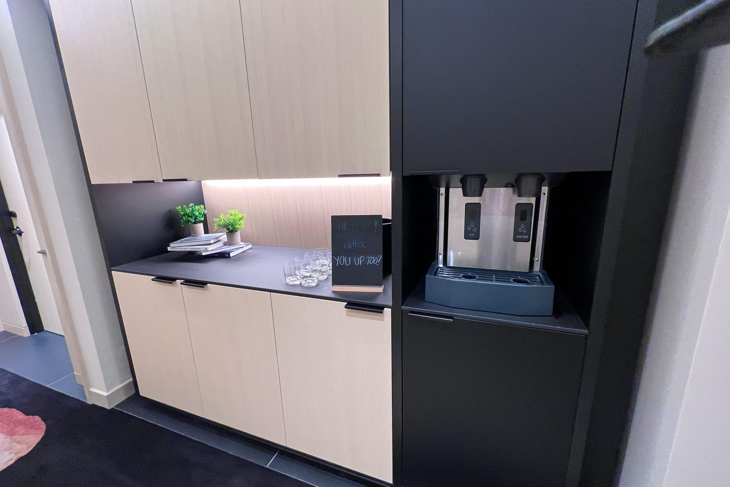 The guest room hallways feature attractive white oak walls and doors, and a pleasant deep blue and pink patterned carpet. Moreover, there’s a water station en route, with a cheeky sign that says “Water you up too?” that gave me a nice chuckle.