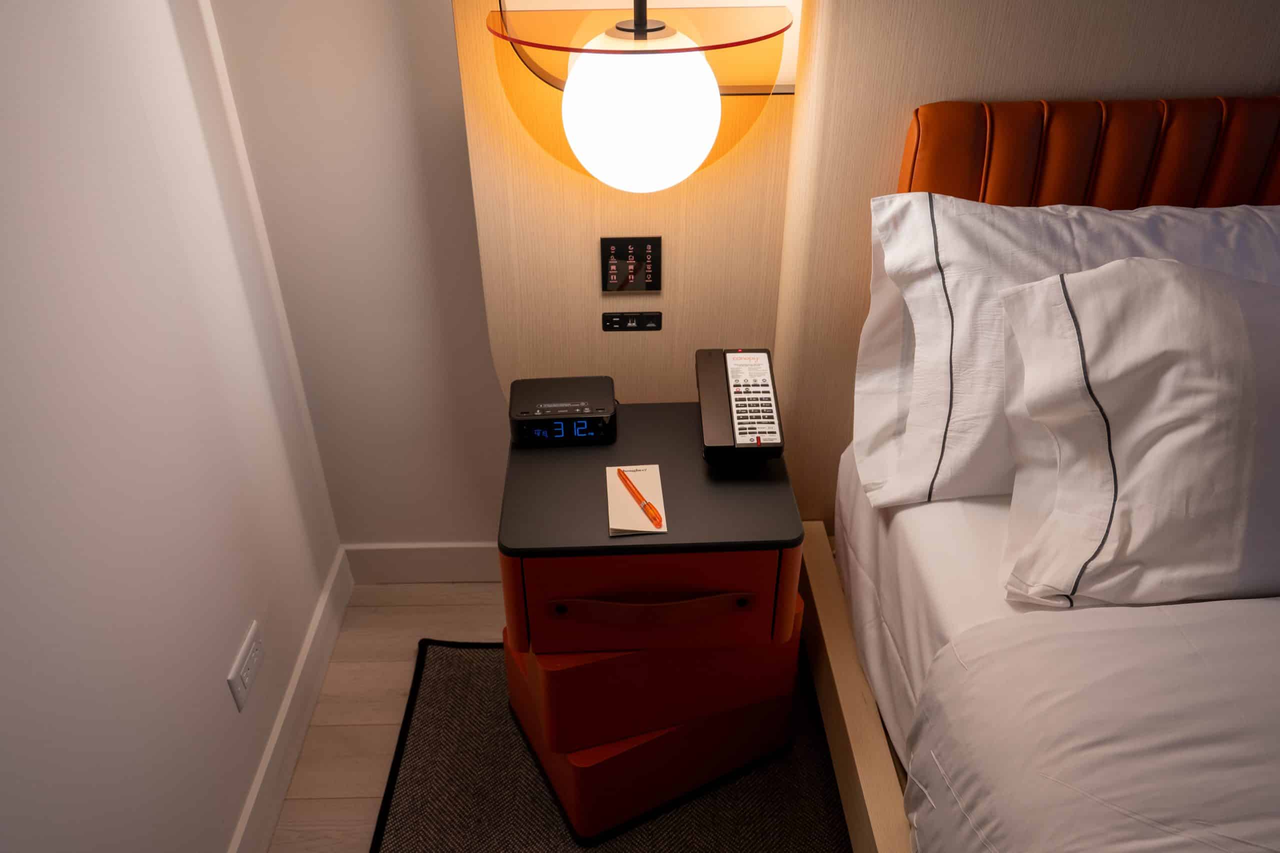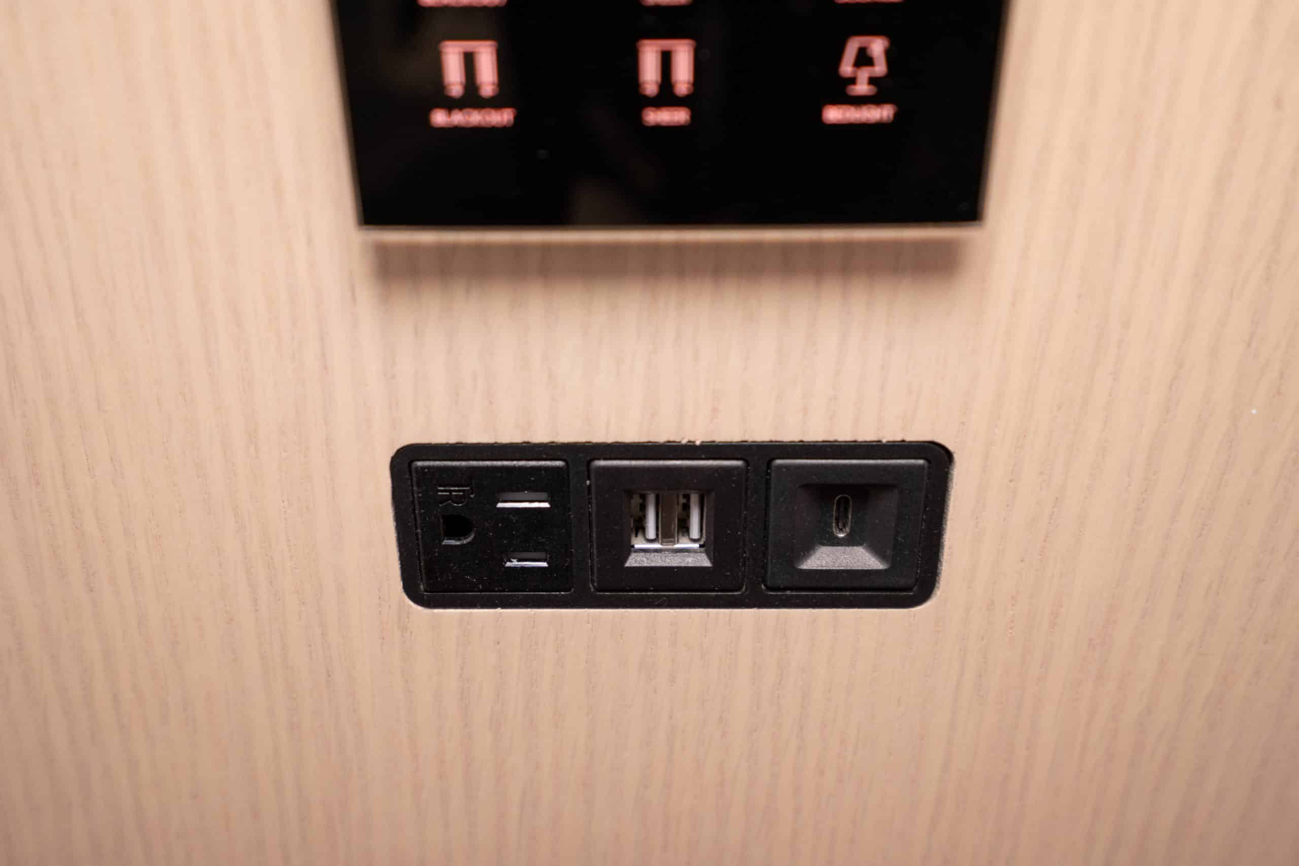 On the left, a funky three-layered side table injects a playful touch, while the right side has a comprehensive set of controls for lighting and curtains. Additionally, positioned below is a charging outlet, and two USB-A ports, and one USB-C port.