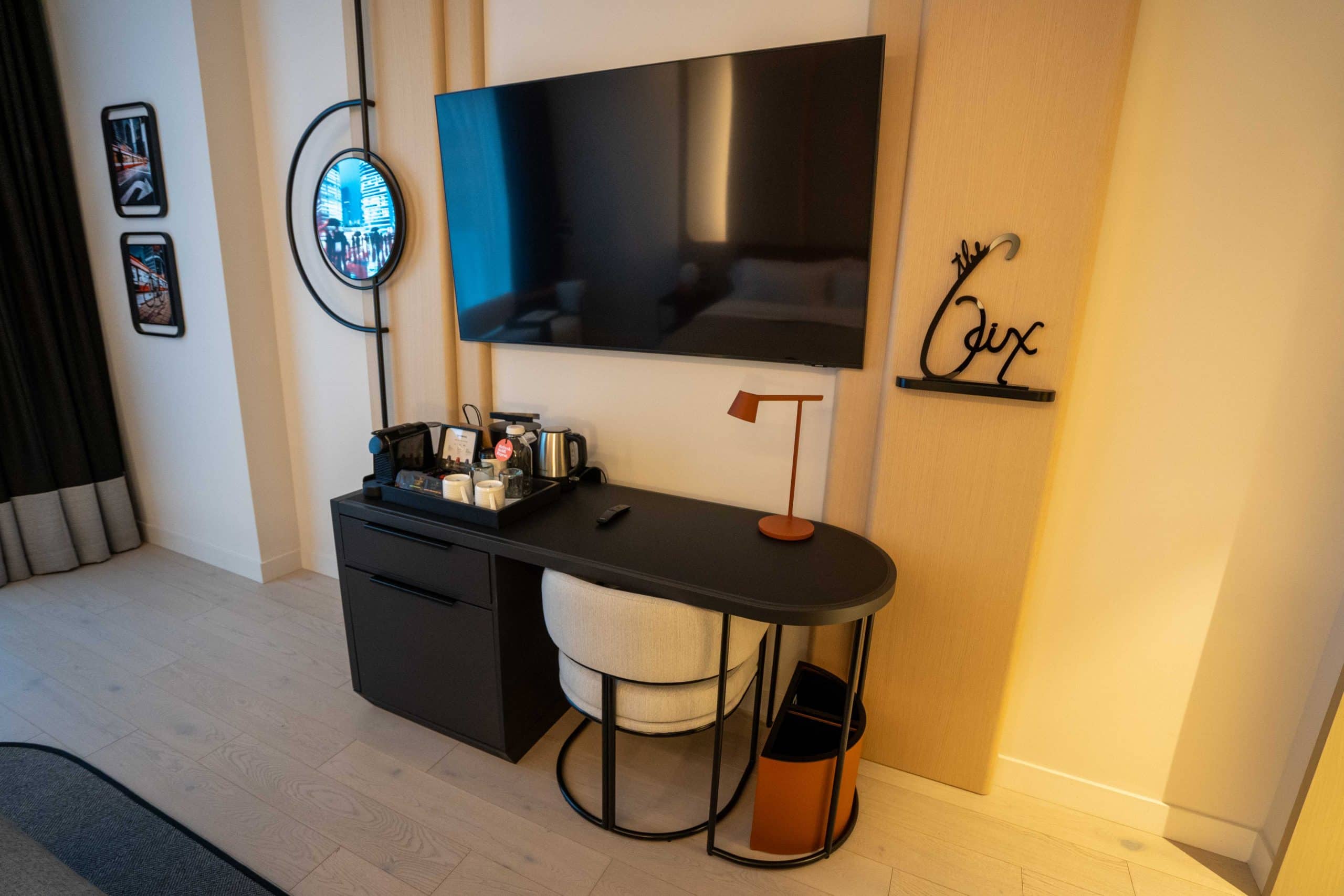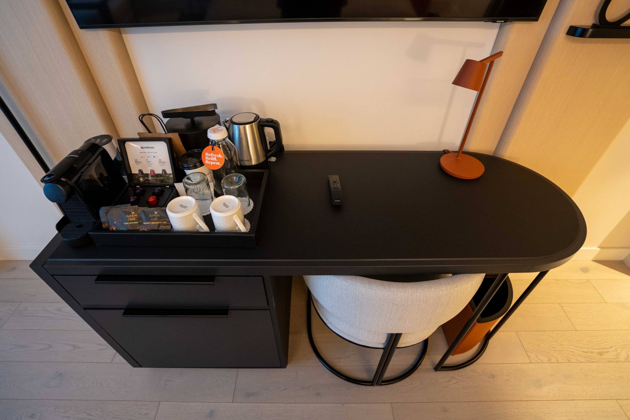 Opposite the bed, a desk and ergonomic chair offer a workspace, with a flat-screen TV mounted on the wall aloft. Located on the desk is a coffee and tea station equipped with a Nespresso machine. Furthermore, just below is a refrigerated drawer.