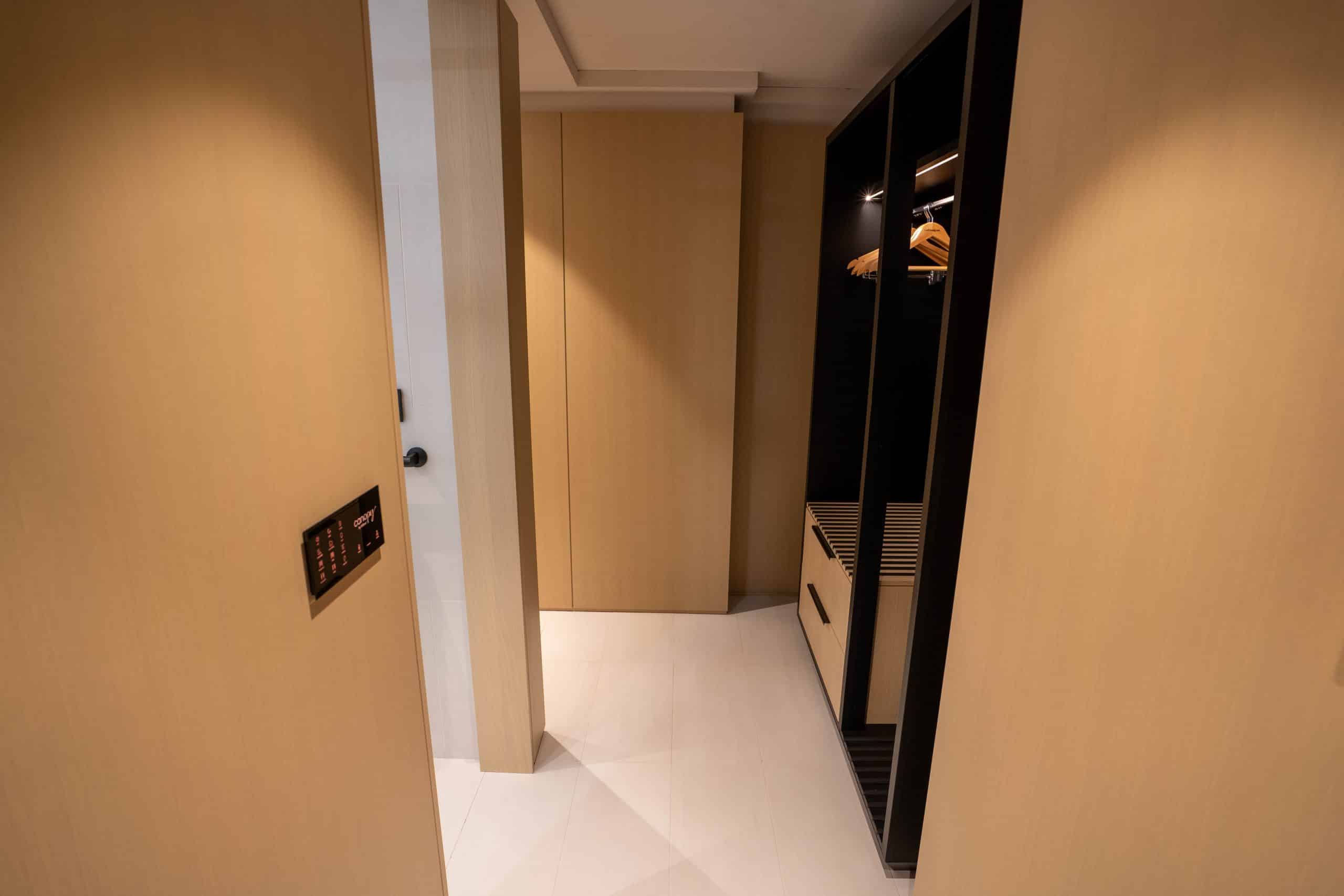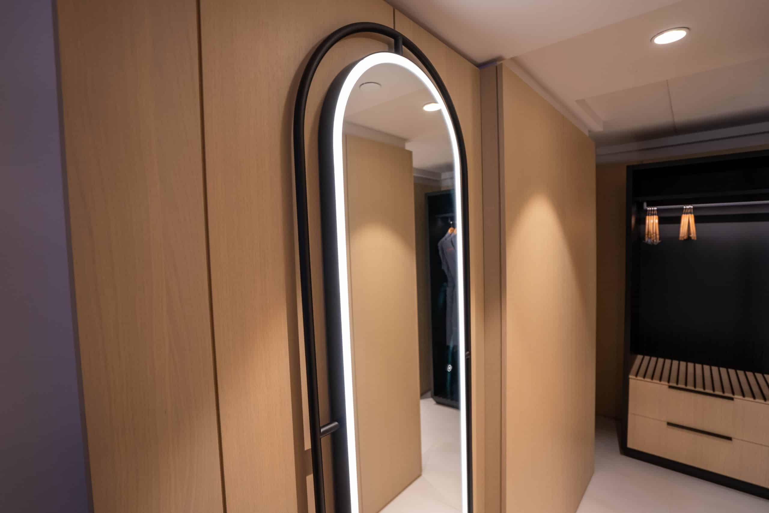 As you round the corner, an arched LED mirror catches your eye, and the space opens up to the bedroom with predominantly beige tones and touches of grey, black, and orange.