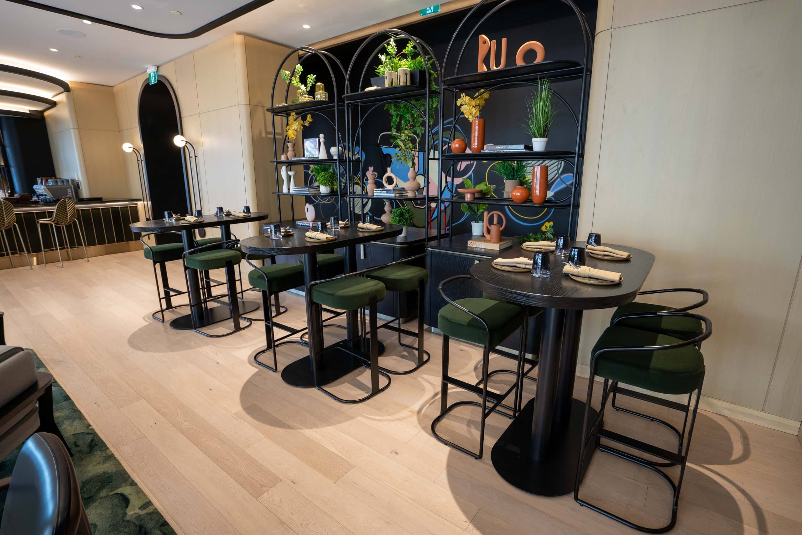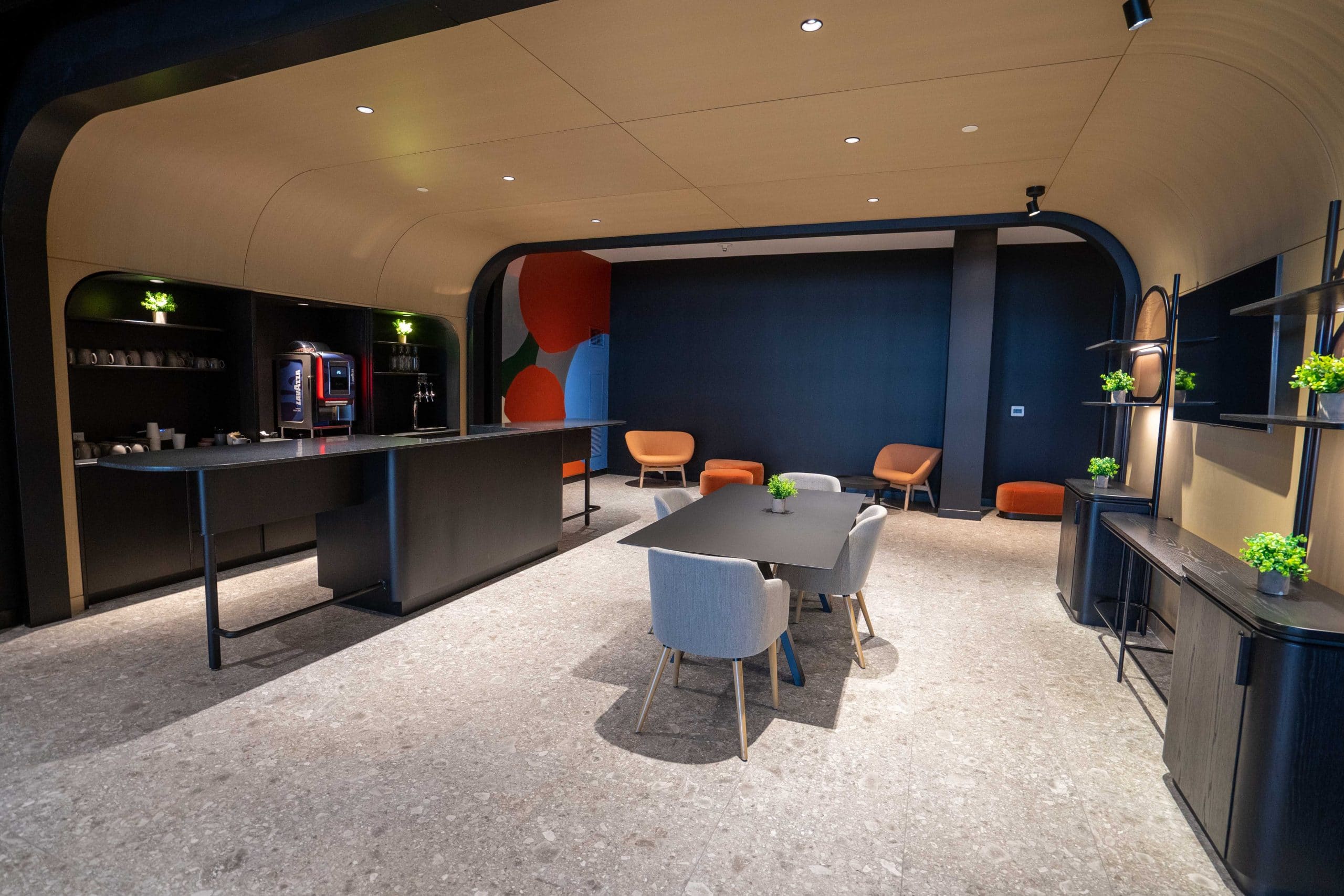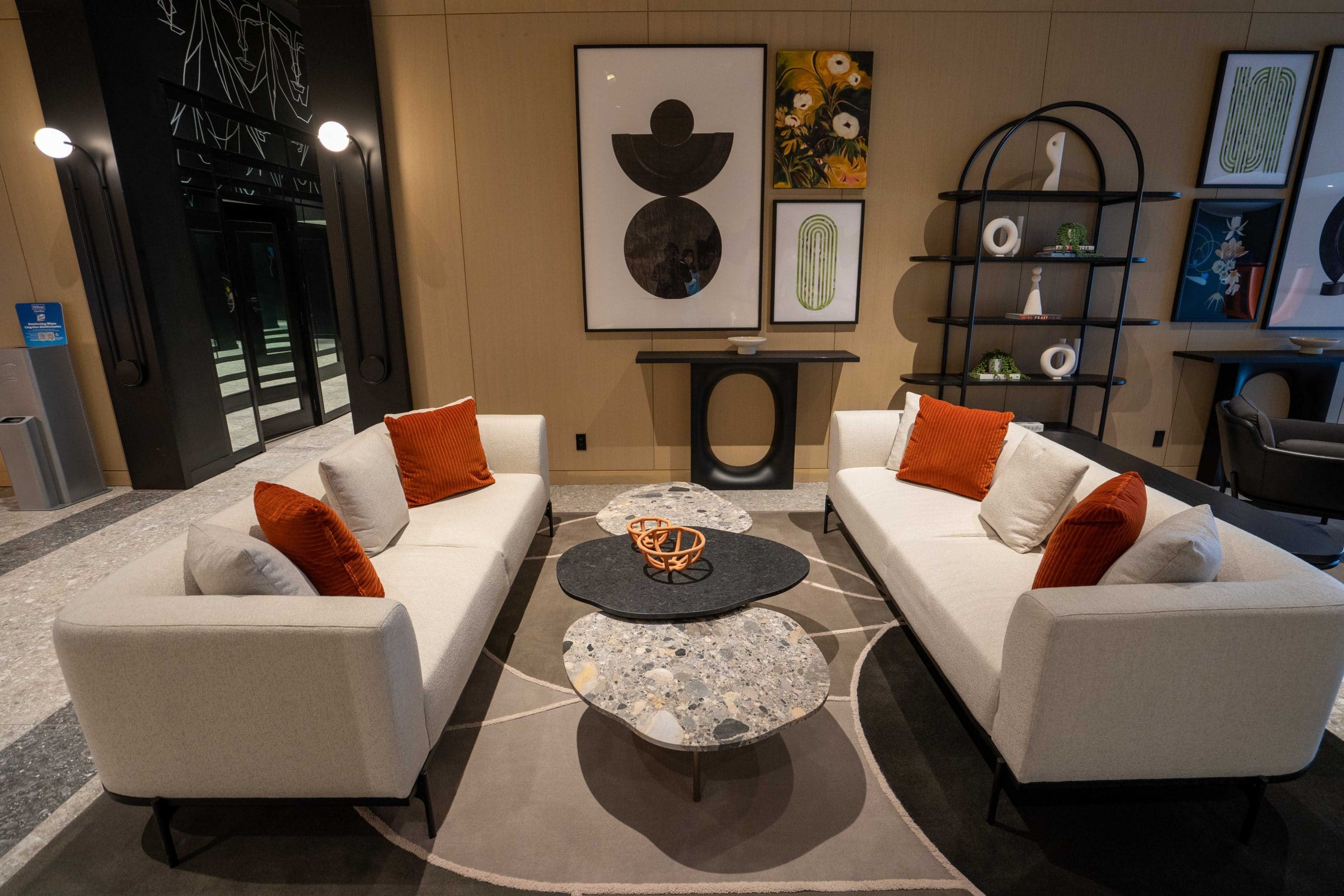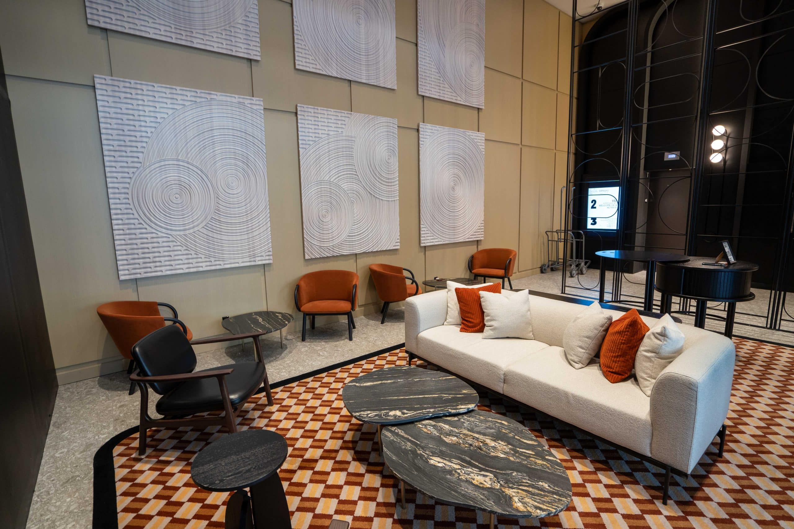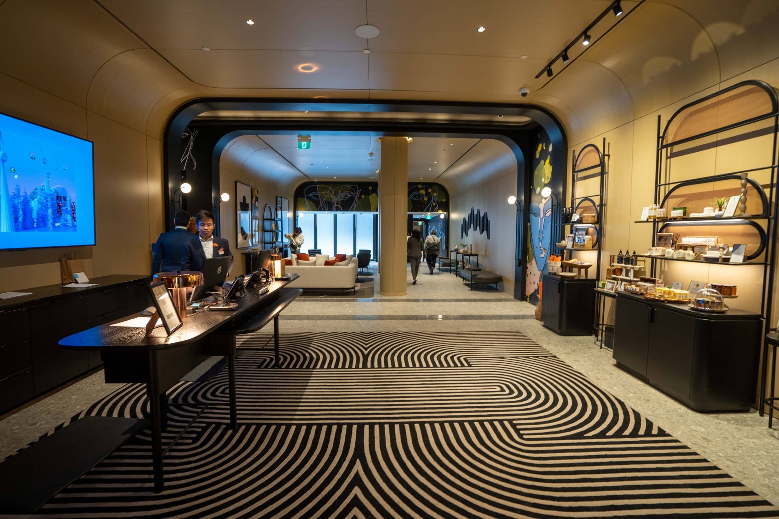 Arriving at the lobby floor, urban elements such as graffiti-style artwork are blended with curved edges, pops of colour, and eclectic patterns.