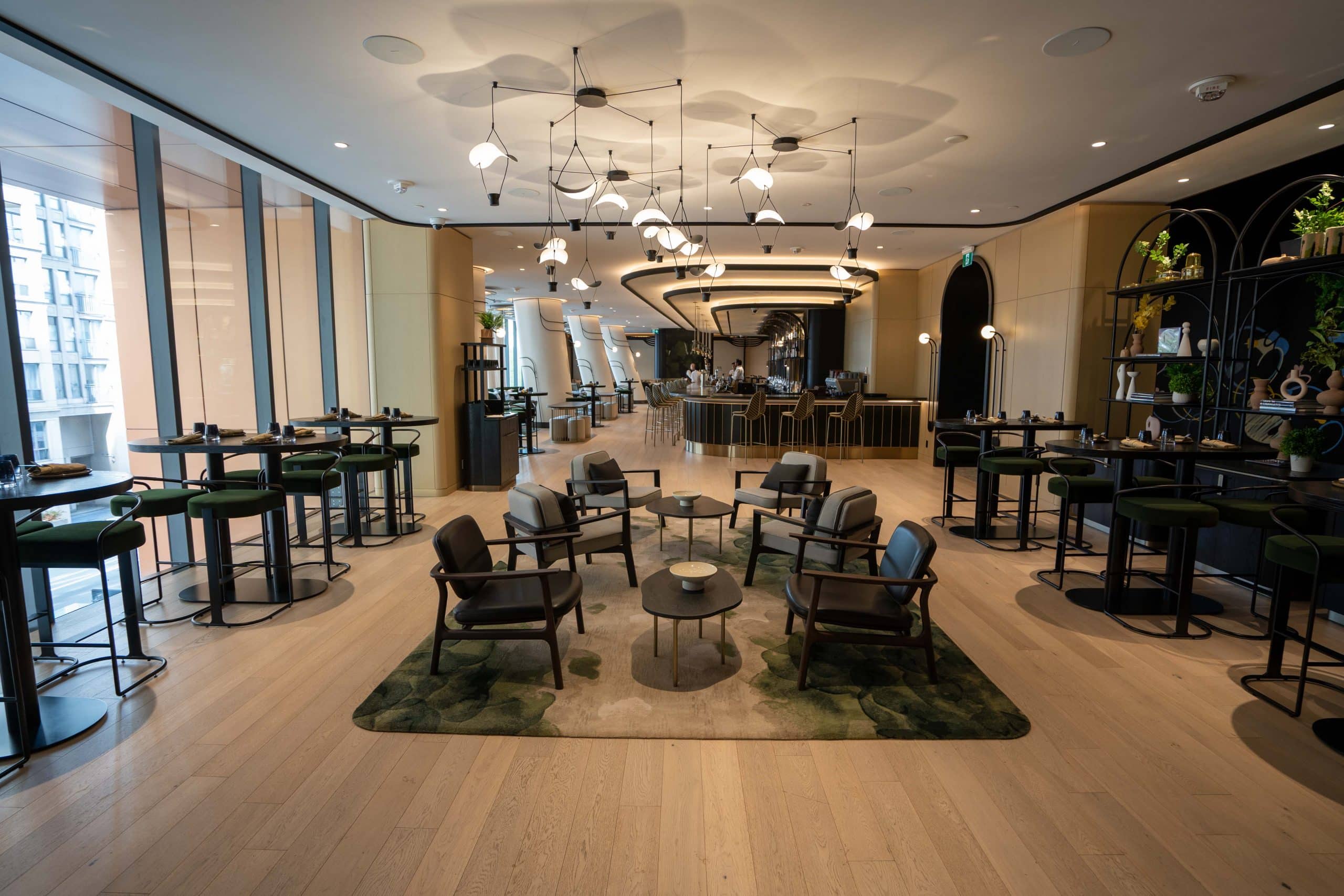 The hotel’s chic décor is immediately apparent upon entering the vibrant ground-floor lobby. Tall ceilings, a hand-tufted rug, white oak wood panelling and copper accents form a chic welcome.