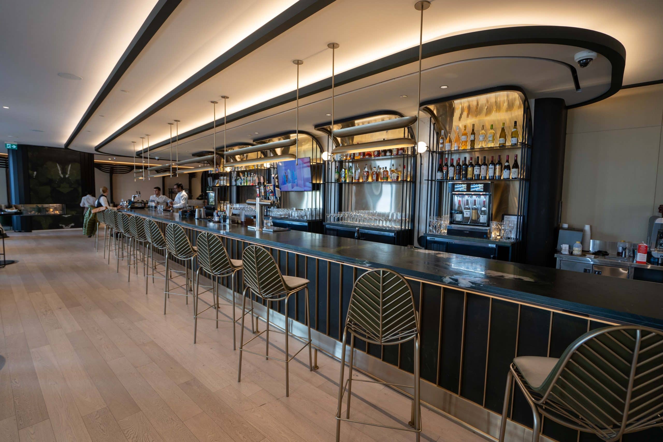 Additionally, there’s a stunning bar area that boasts gold-leaf-themed chairs.