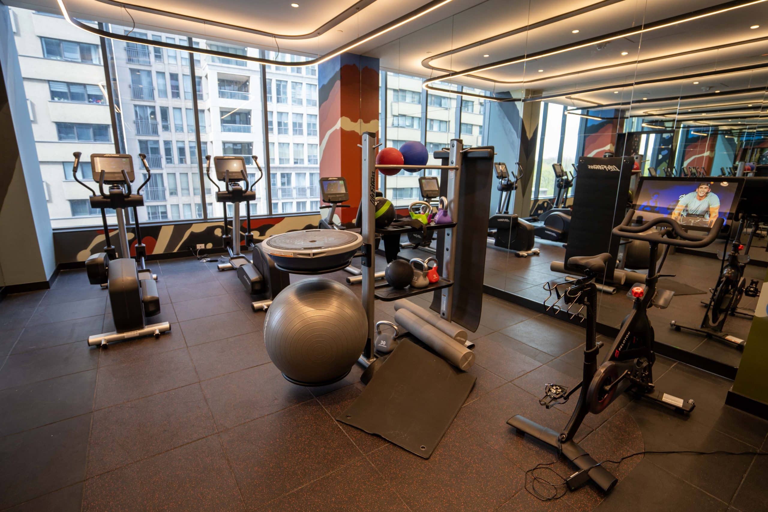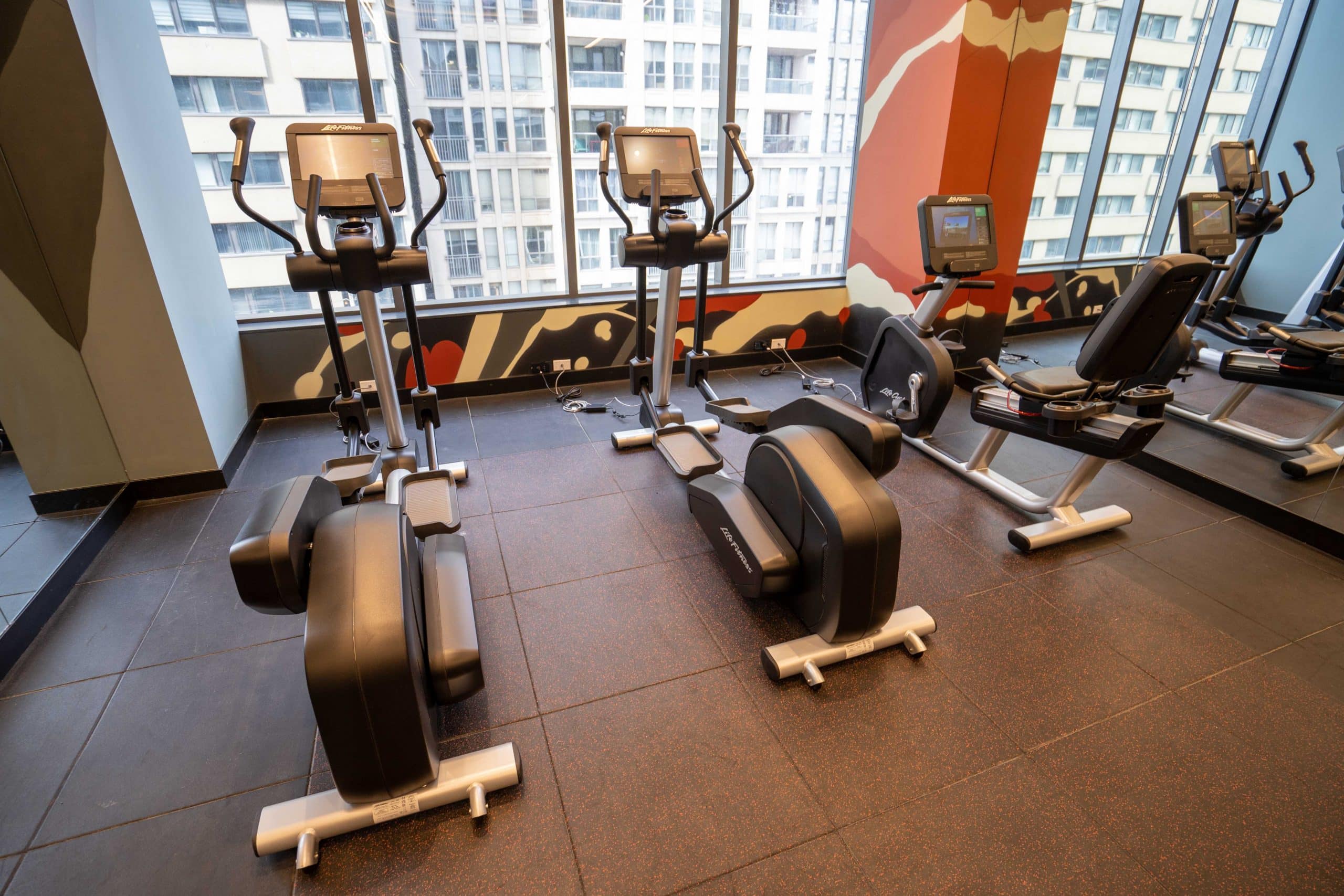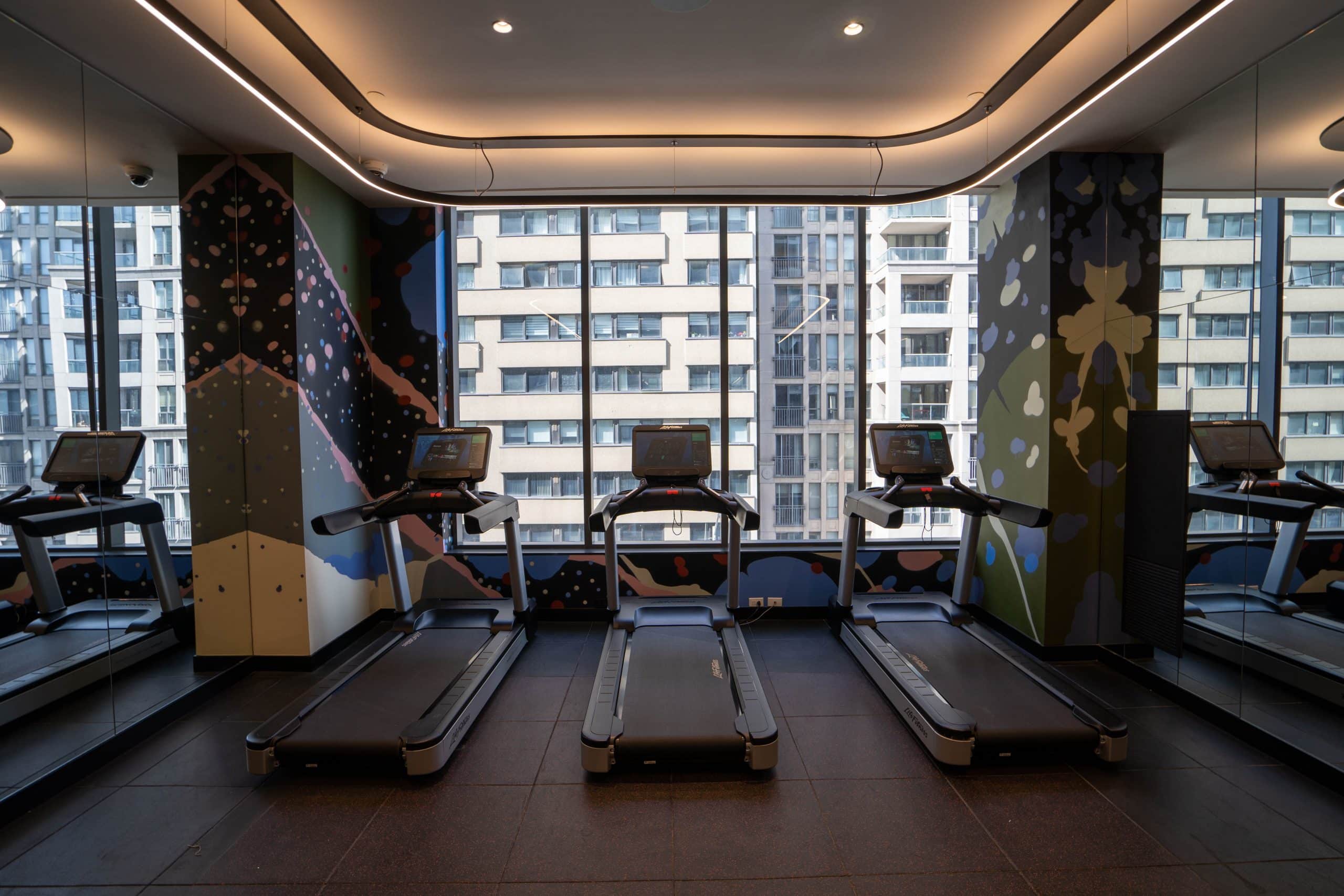 The fitness centre is well-equipped with ample modern cardio machines, free weights, yoga mats, and towels, as well as floor-to-ceiling windows that afford a good amount of light. However, the views are again quite limited, as they simply overlook the building across the street.