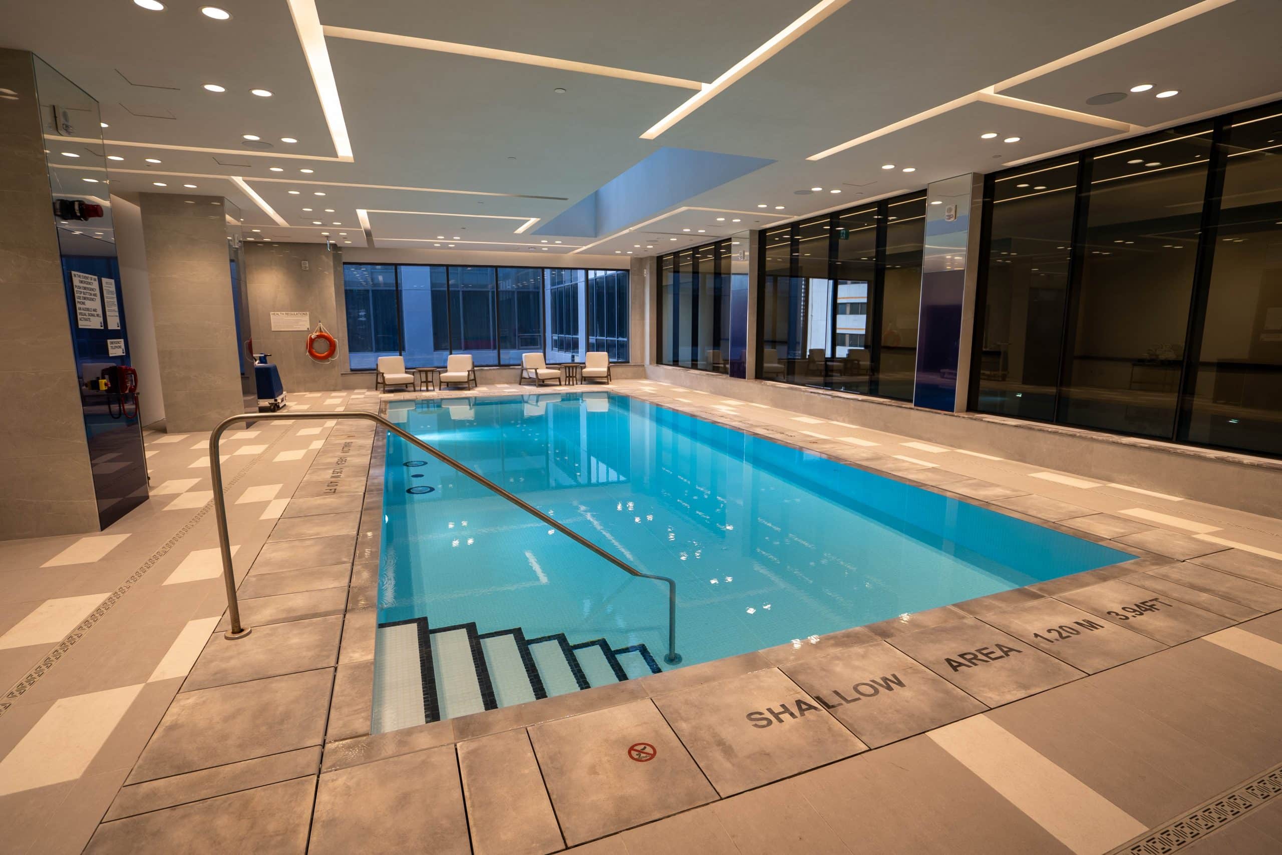On the same floor, there’s an impressive heated indoor pool, where you can enjoy a refreshing dip. The pool is open daily from 6am to 10pm, with a few loungers available on the pool deck.
