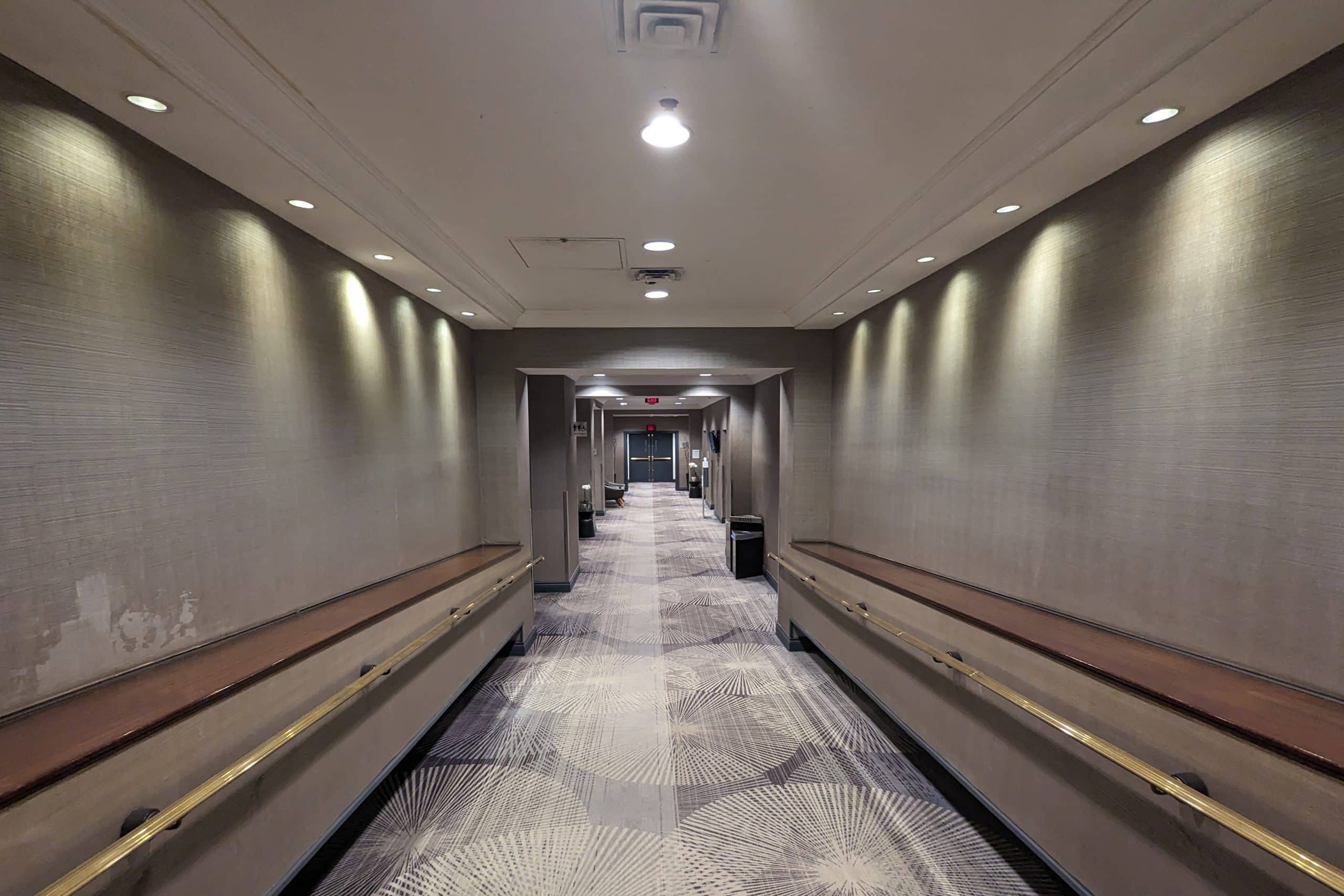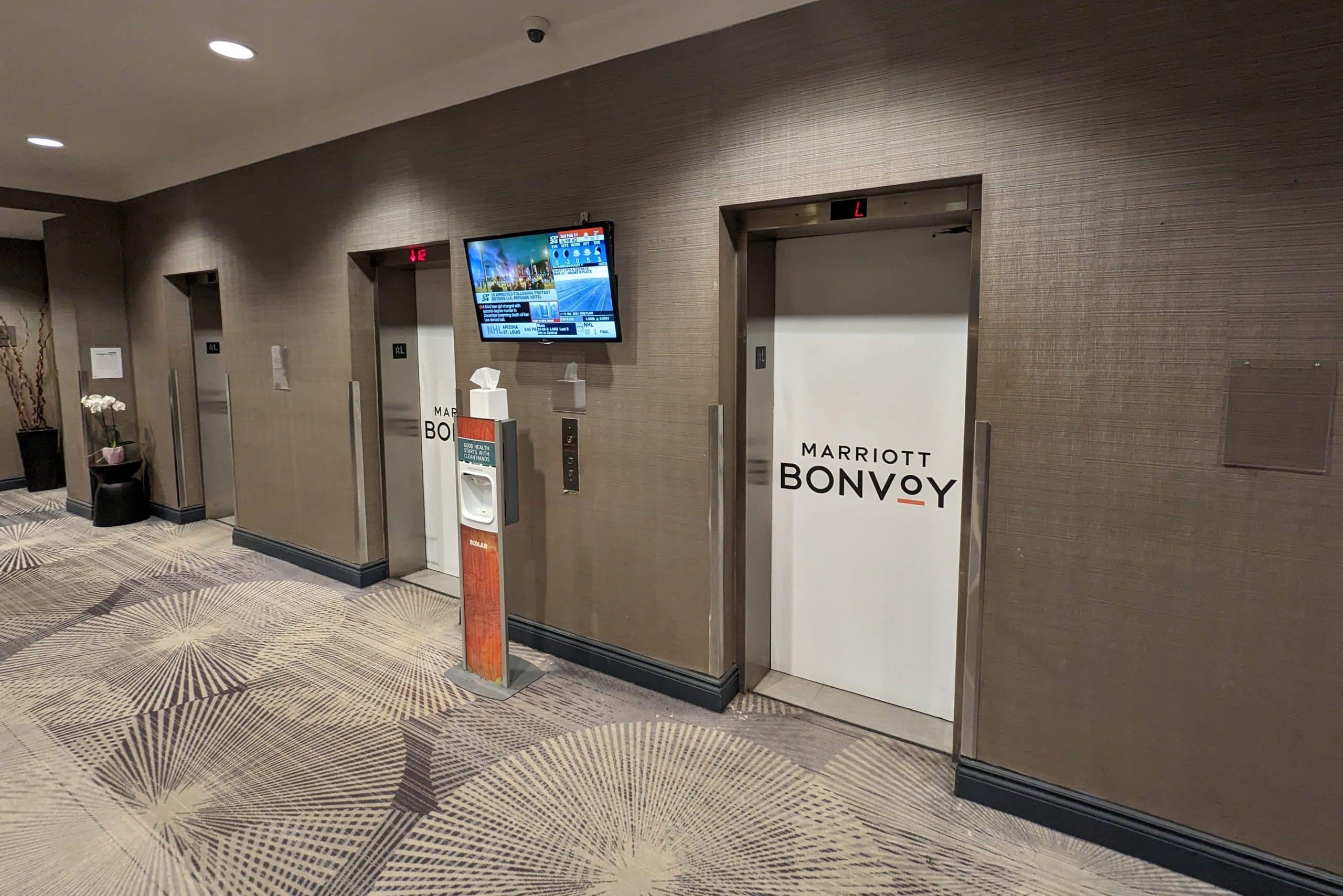 The hotel has two separate towers, a south tower and a north tower, which are connected by separated diverging hallways. I was in the south tower, so I made my way down that hallway to the Marriott Bonvoy-branded elevators.