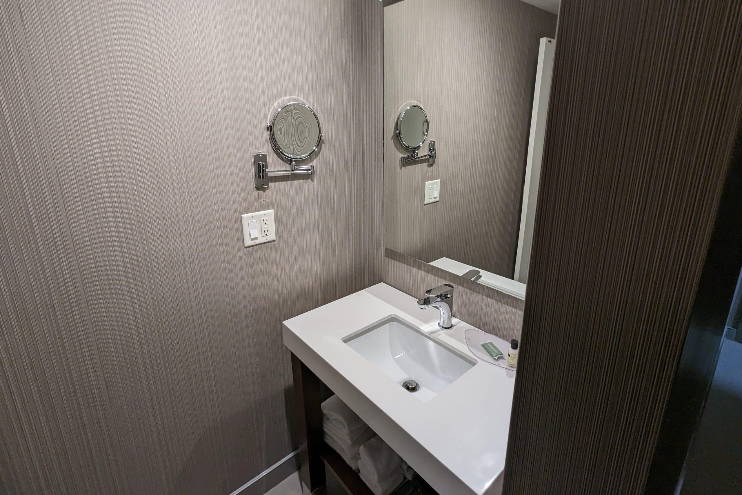 However, the sink was in a separate, open space on the right-hand side of the hallway next to the room’s closet. The sink area also contained all the towels.