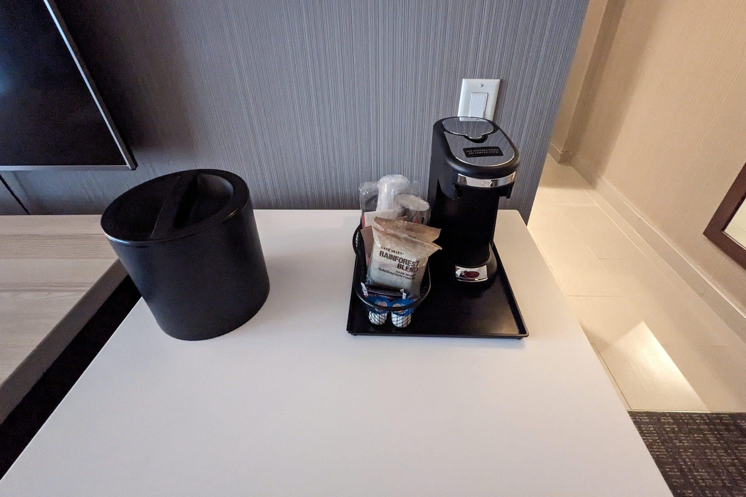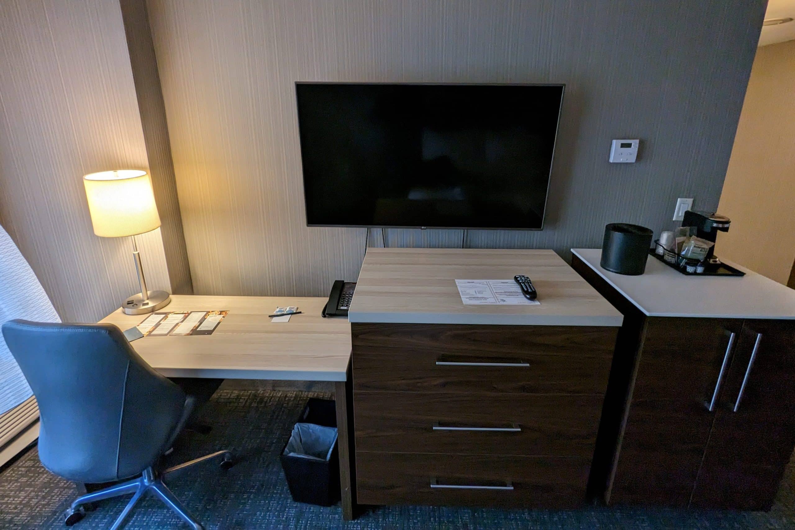 Across from the bed were the usual amenities, such as a flat-screen television and coffee maker, as well as a desk and office chair.