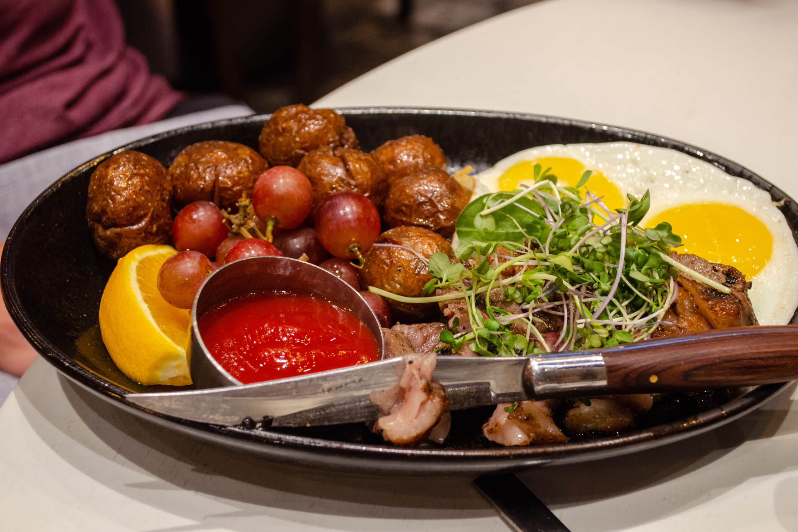 My friend ordered the New York Steak and Eggs, which featured a four ounce striploin steak, two eggs, hash browns, and toast. His son snacked on some berries, avocado, and milk.