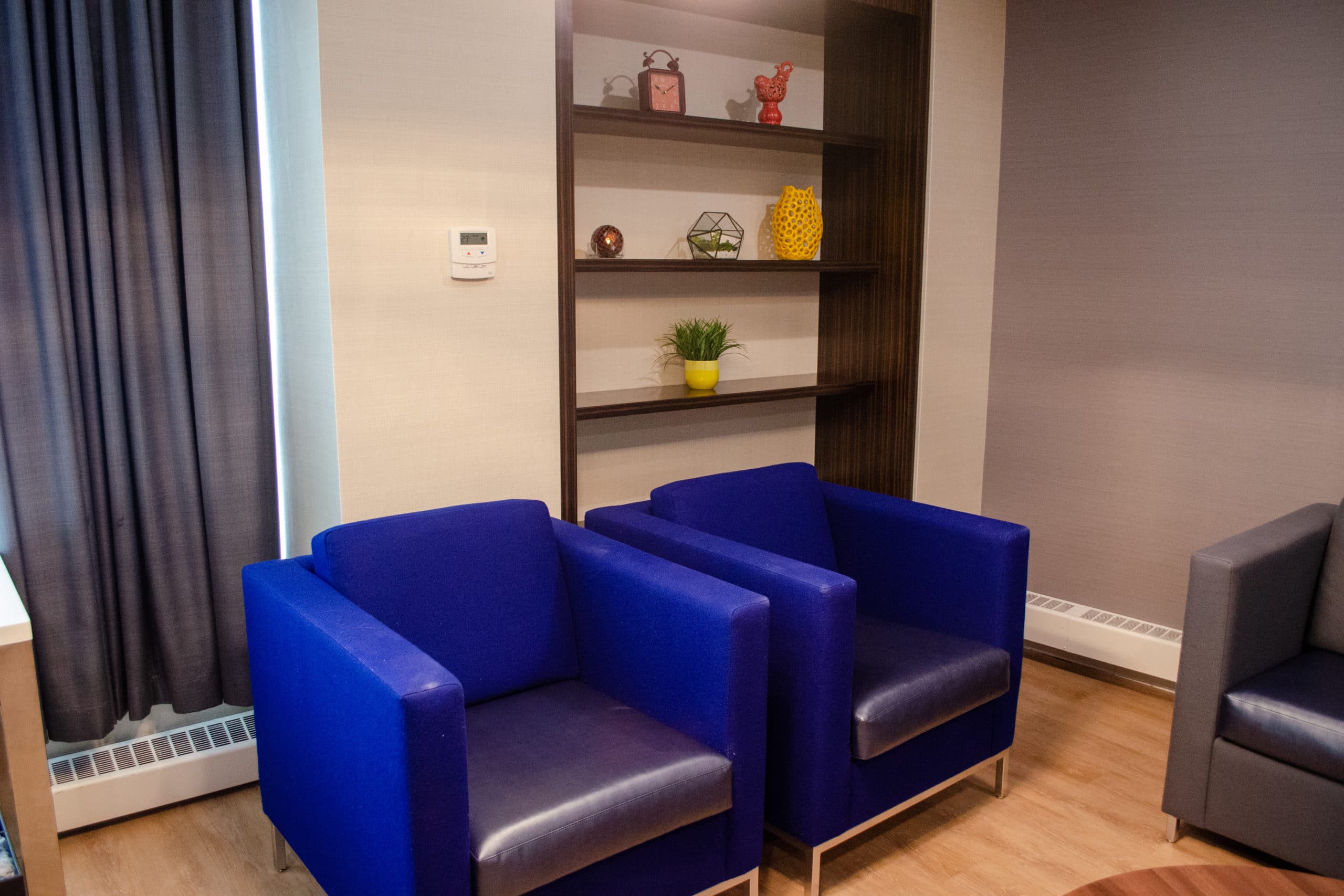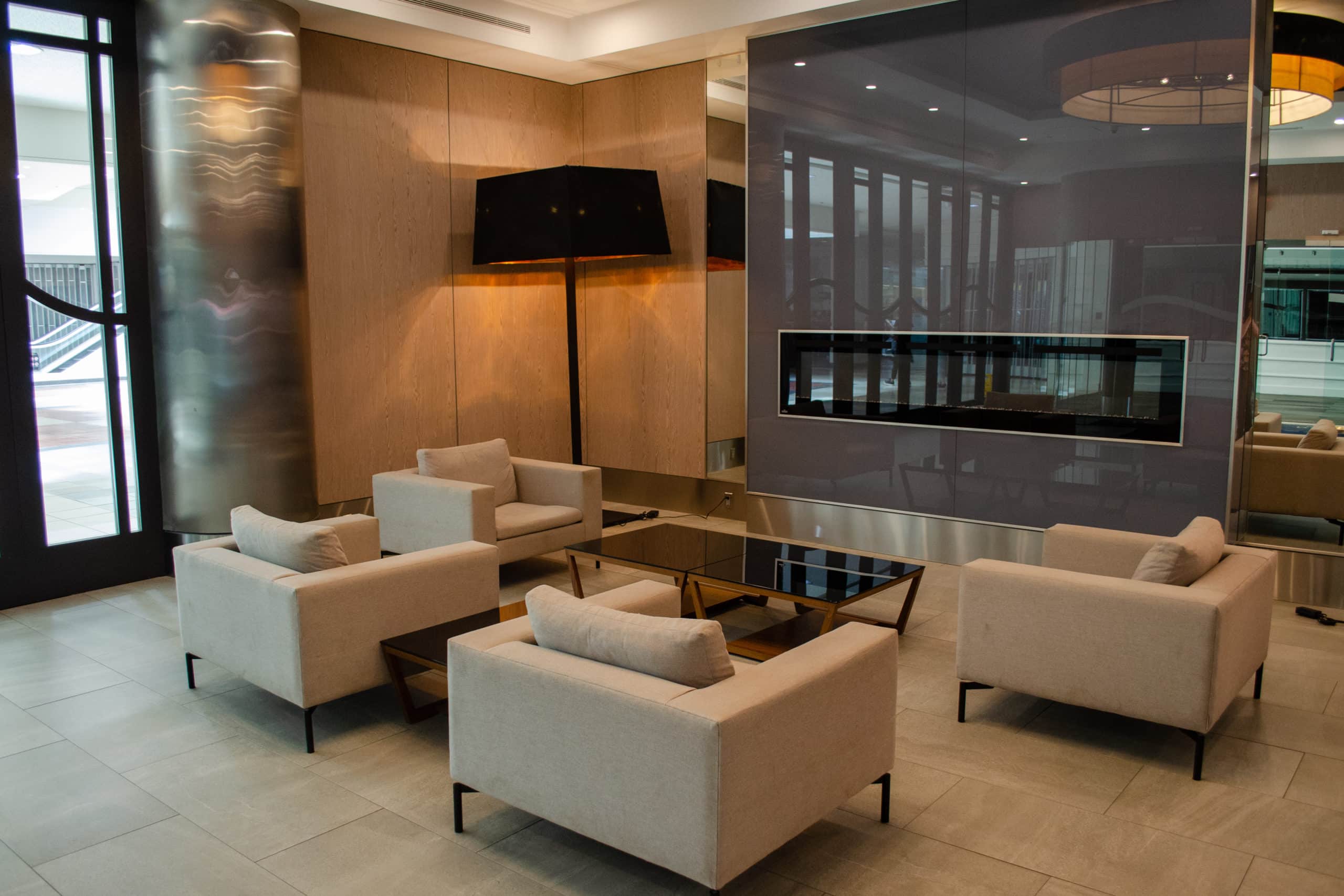 The lobby lounge features a few armchairs centred around an electric fireplace. There isn’t a lot of room here, but it was a perfectly fine place to sit when I waited for my friend the following morning.