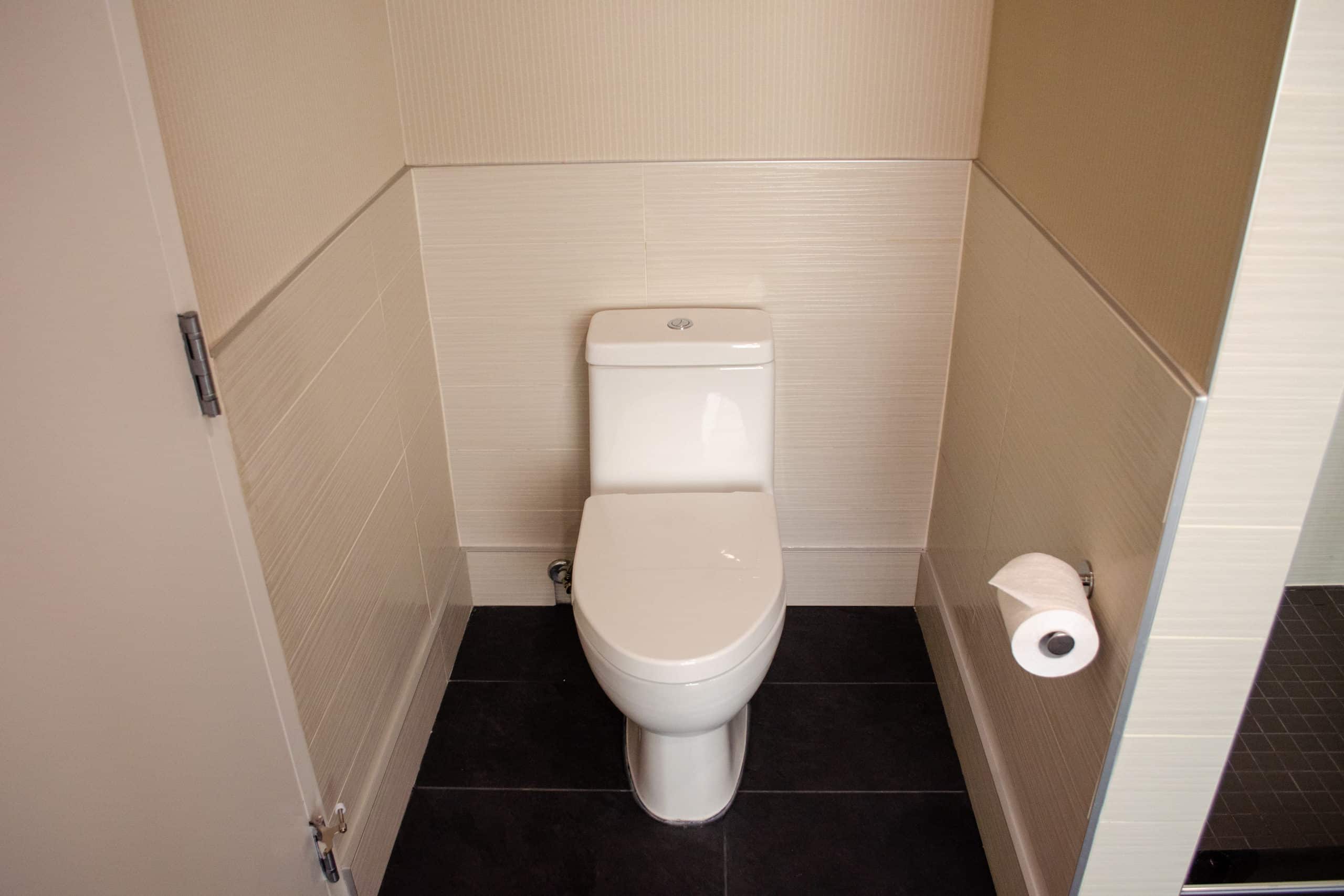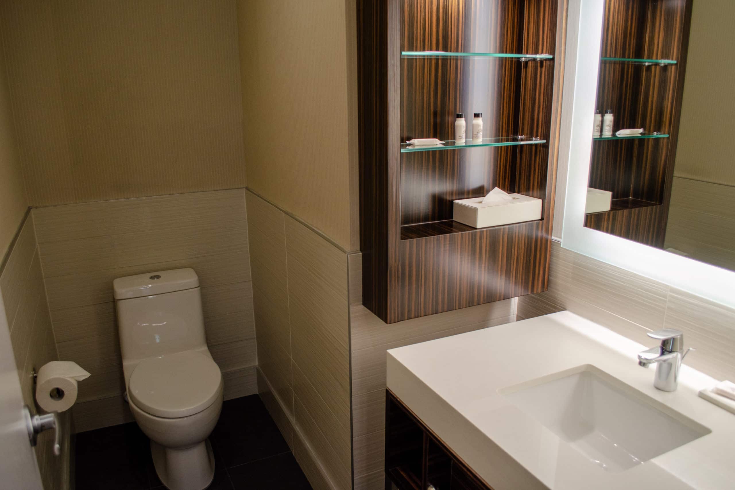 Heading through the suite, you’ll find a smaller, two-piece bathroom between the bedroom and the breakfast bar area. In this bathroom is a toilet and LED-backlit vanity.