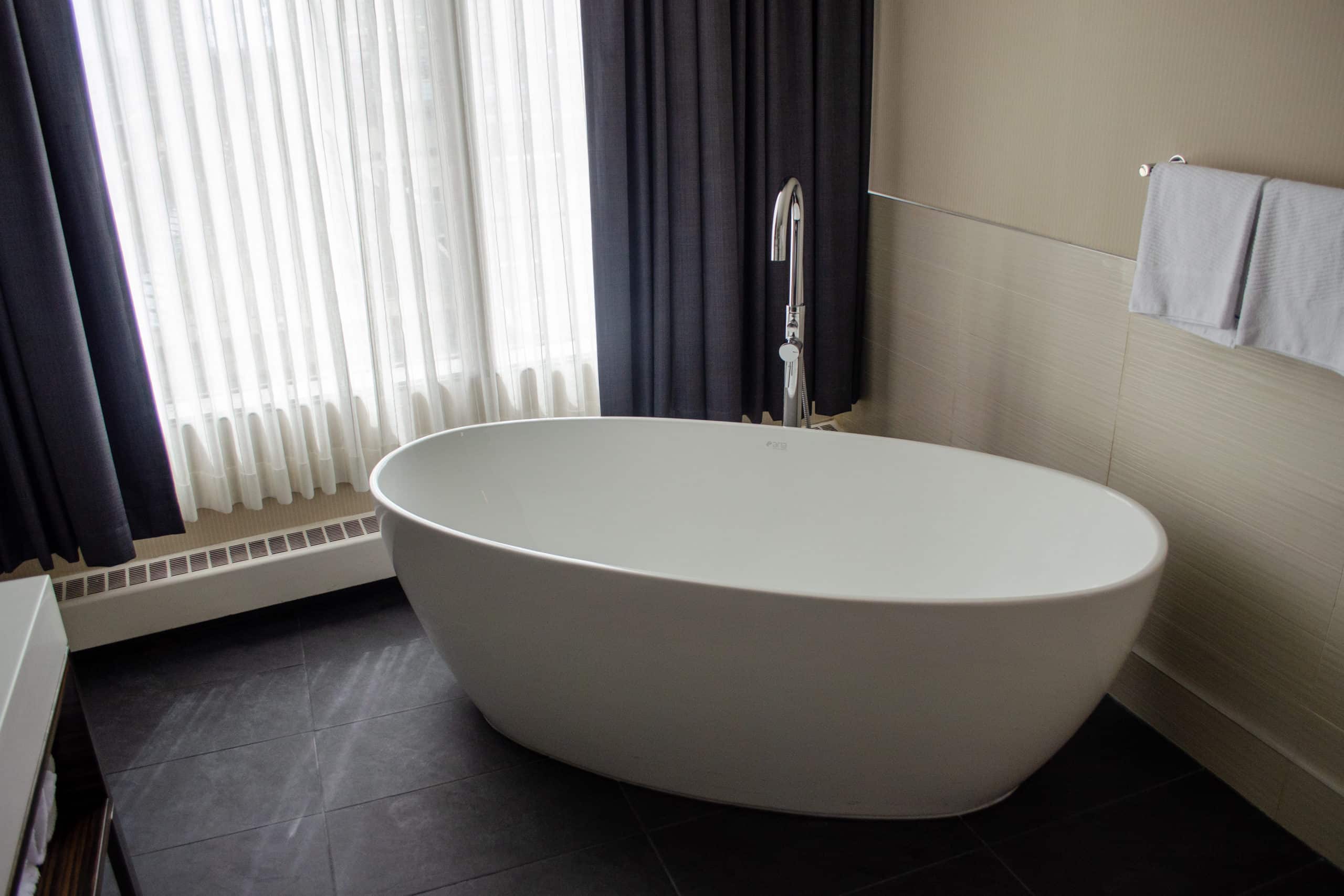 The ensuite bathroom is very spacious. There’s an inviting bathtub situated next to the window, which I unfortunately didn’t have the opportunity to take advantage of.