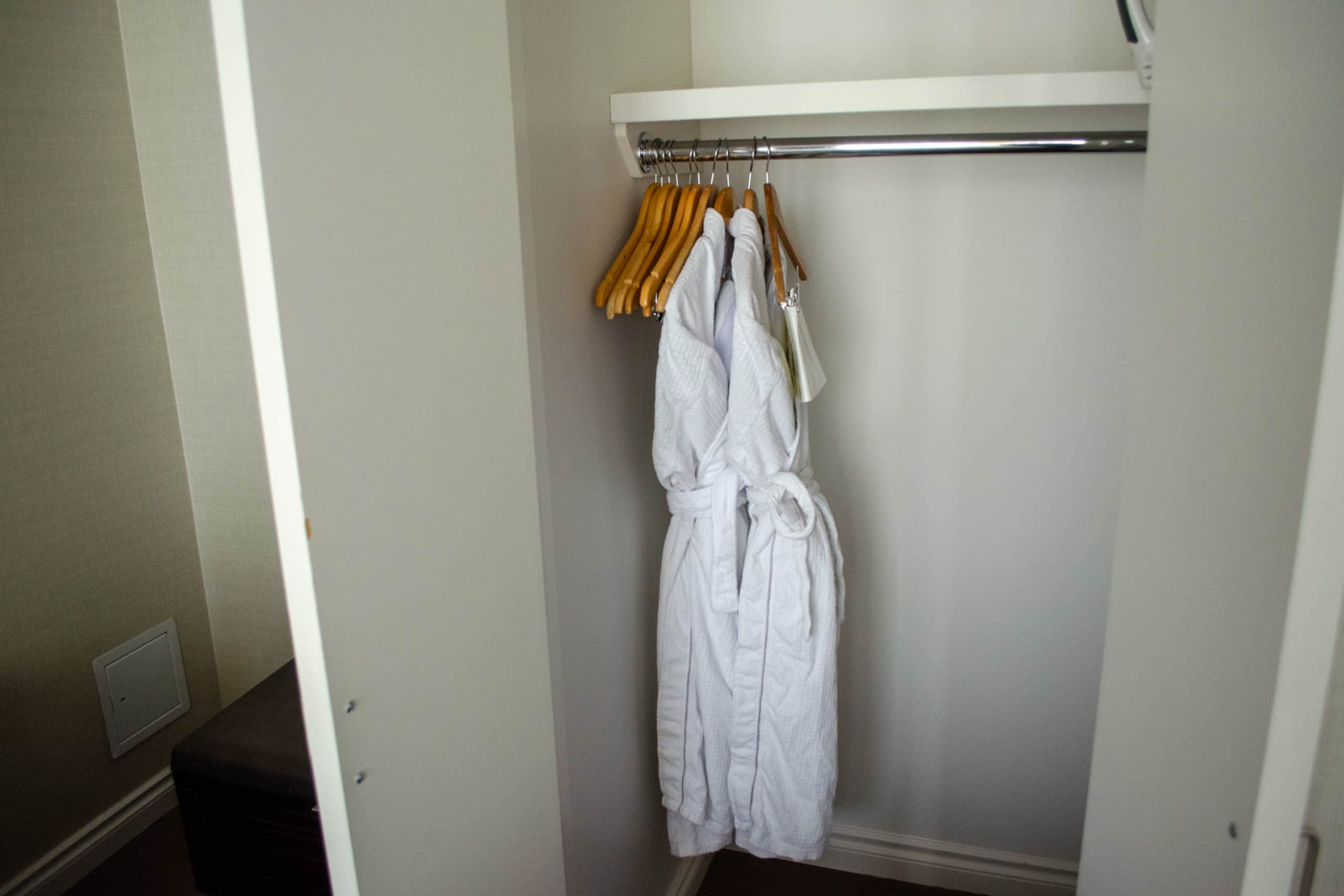 There is another television and a dresser opposite the bed, as well as a full-length mirror and hallway bench in a nook next to a small closet. Inside the closet were two bathrobes.