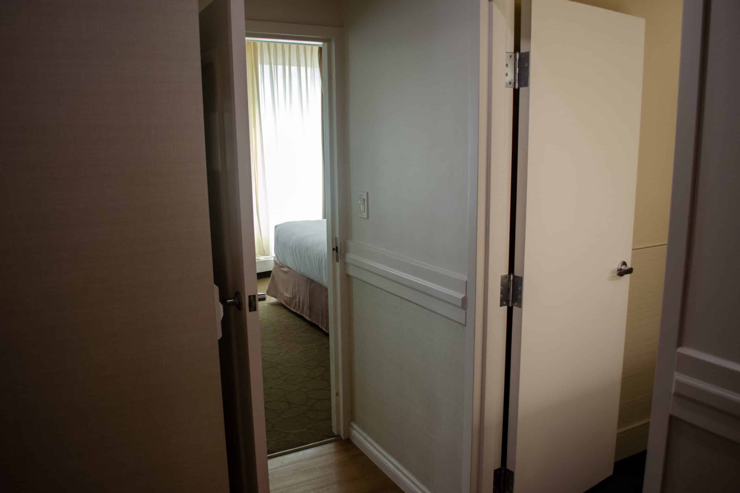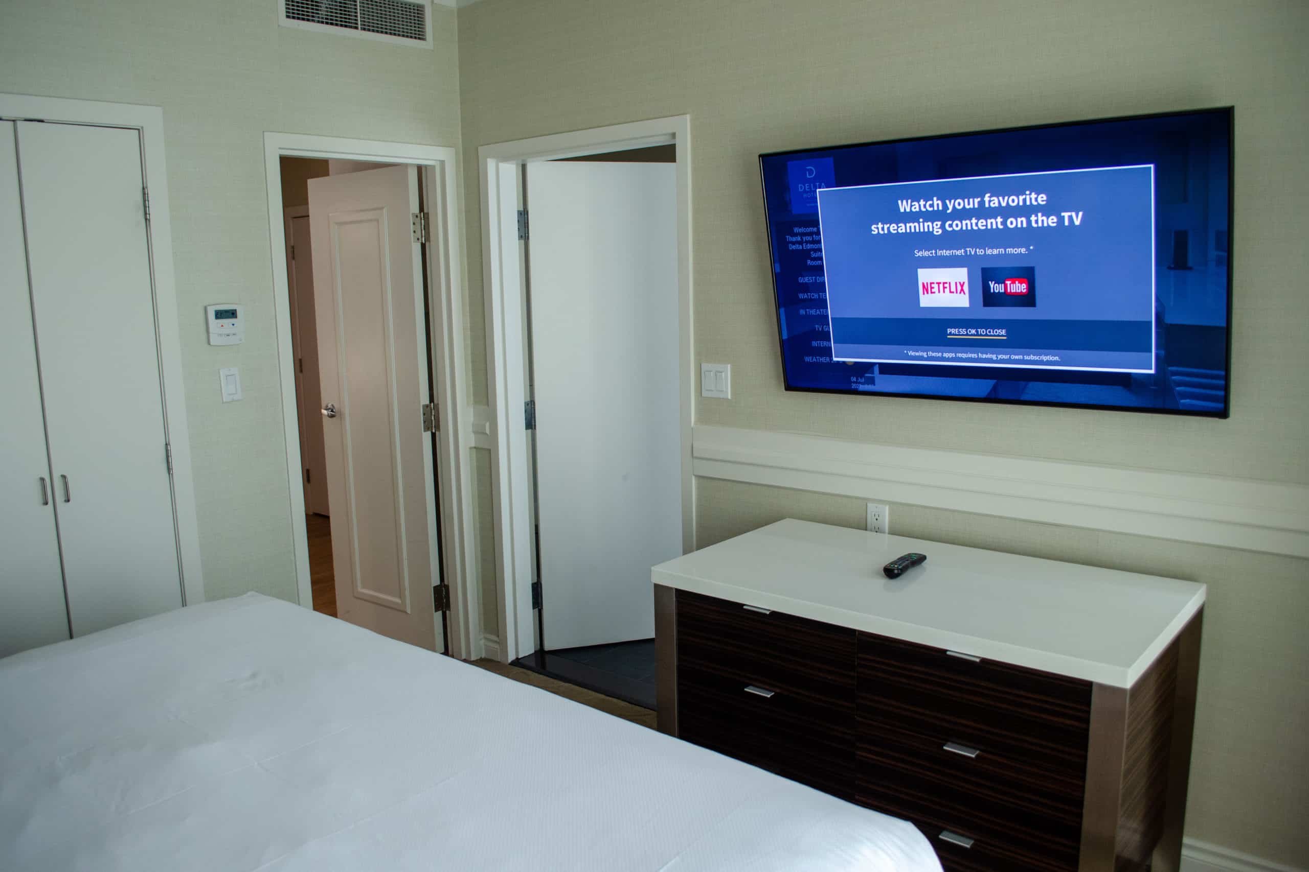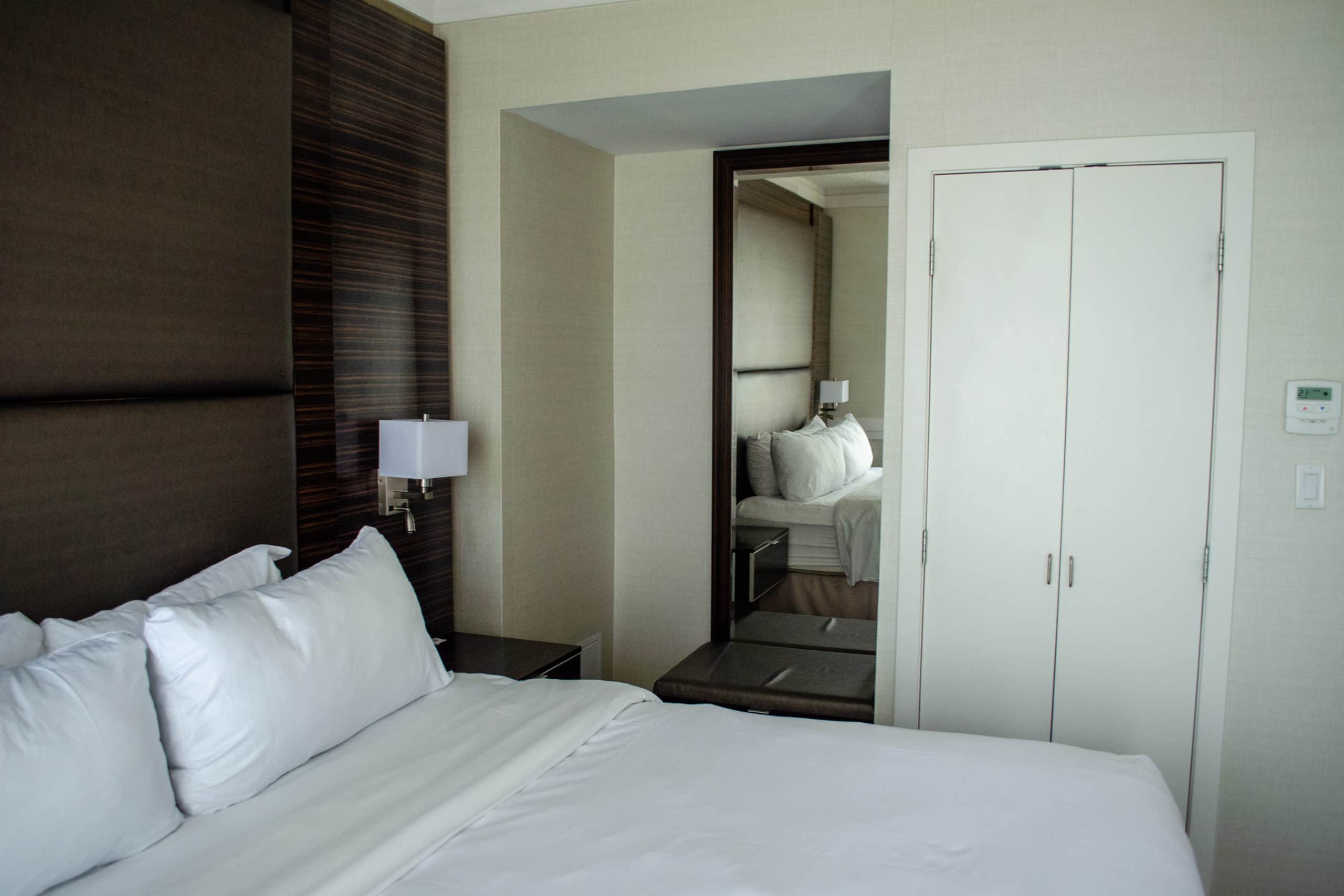 The bedroom is tucked away in a southward-facing corner of the suite. It’s separated from the rest of the suite by a door.